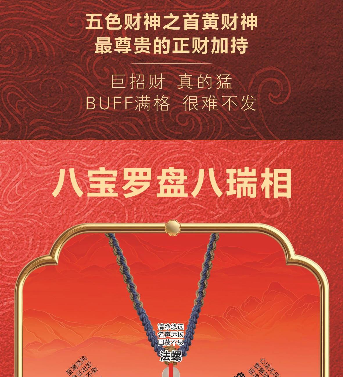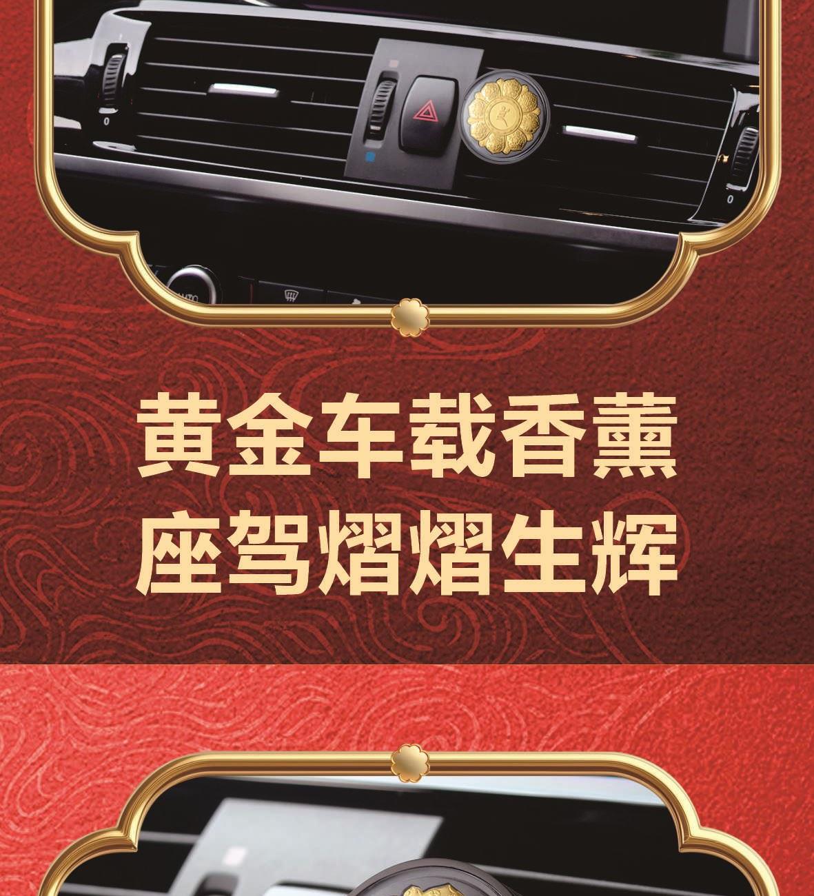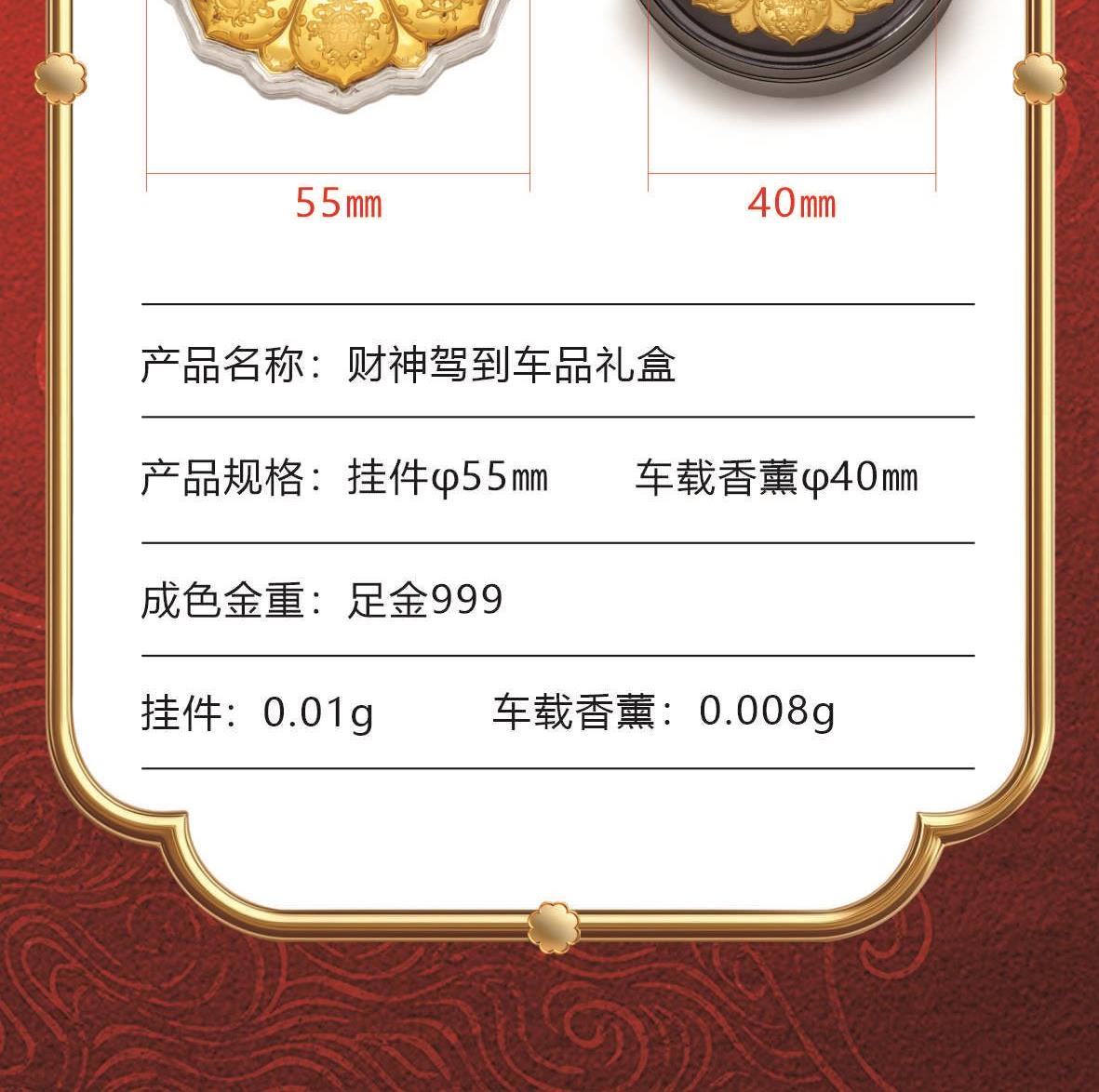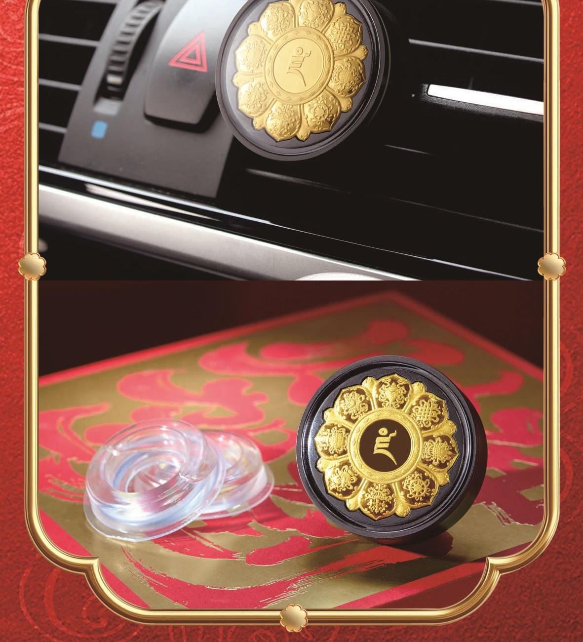 产品规格:挂件55mm车载香薰φ40mm 成色金重:足金999 挂件:0.01g车载香薰:0.008g 质检证书x2张 精美包装x1个 八宝罗盘八瑞相车挂 五色财神之首黄财神尊贵的正财加持 巨招财藏式手编绳挂件·附赠精美嘎乌盒朱砂印缘起咒·西藏甘露丸·五色法米 黄金车载香薰座驾熠熠生辉 高分子透气膜1秒扩香,留香70天看得见的真精油,闻得到的植物香大师亲调,木质香调。 前调:柏树 桃金娘 玫瑰中调:檀木香 雪松后调:巴西红木 辛香料 琥珀 麝香