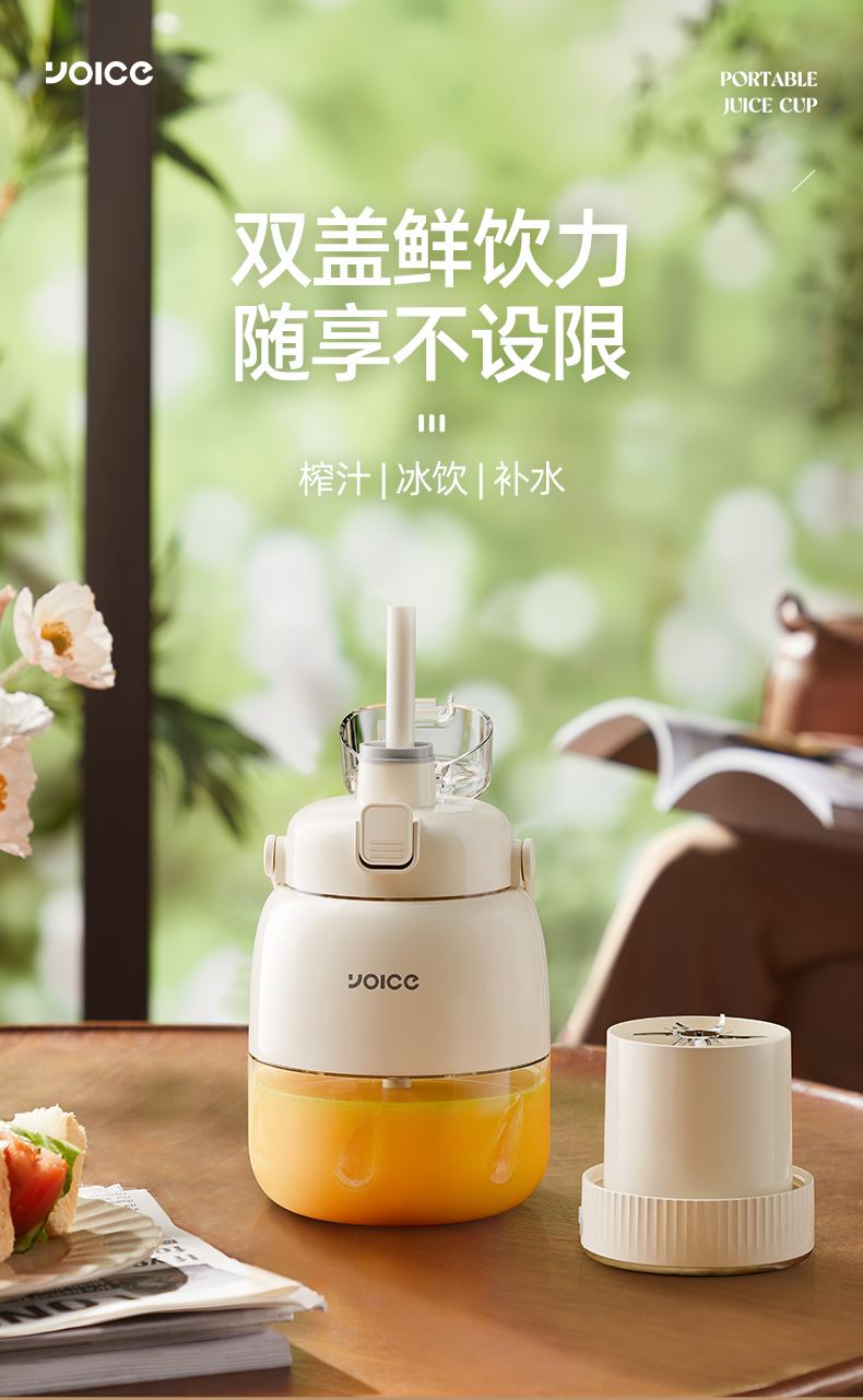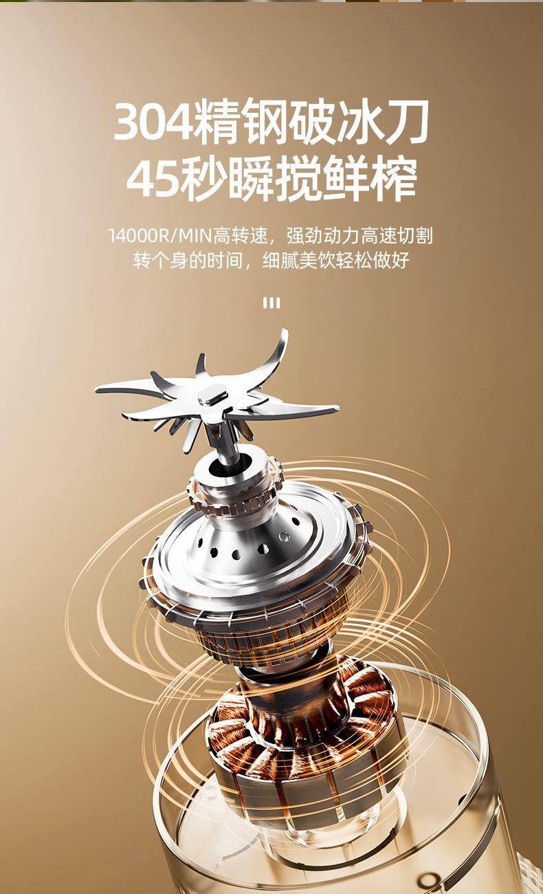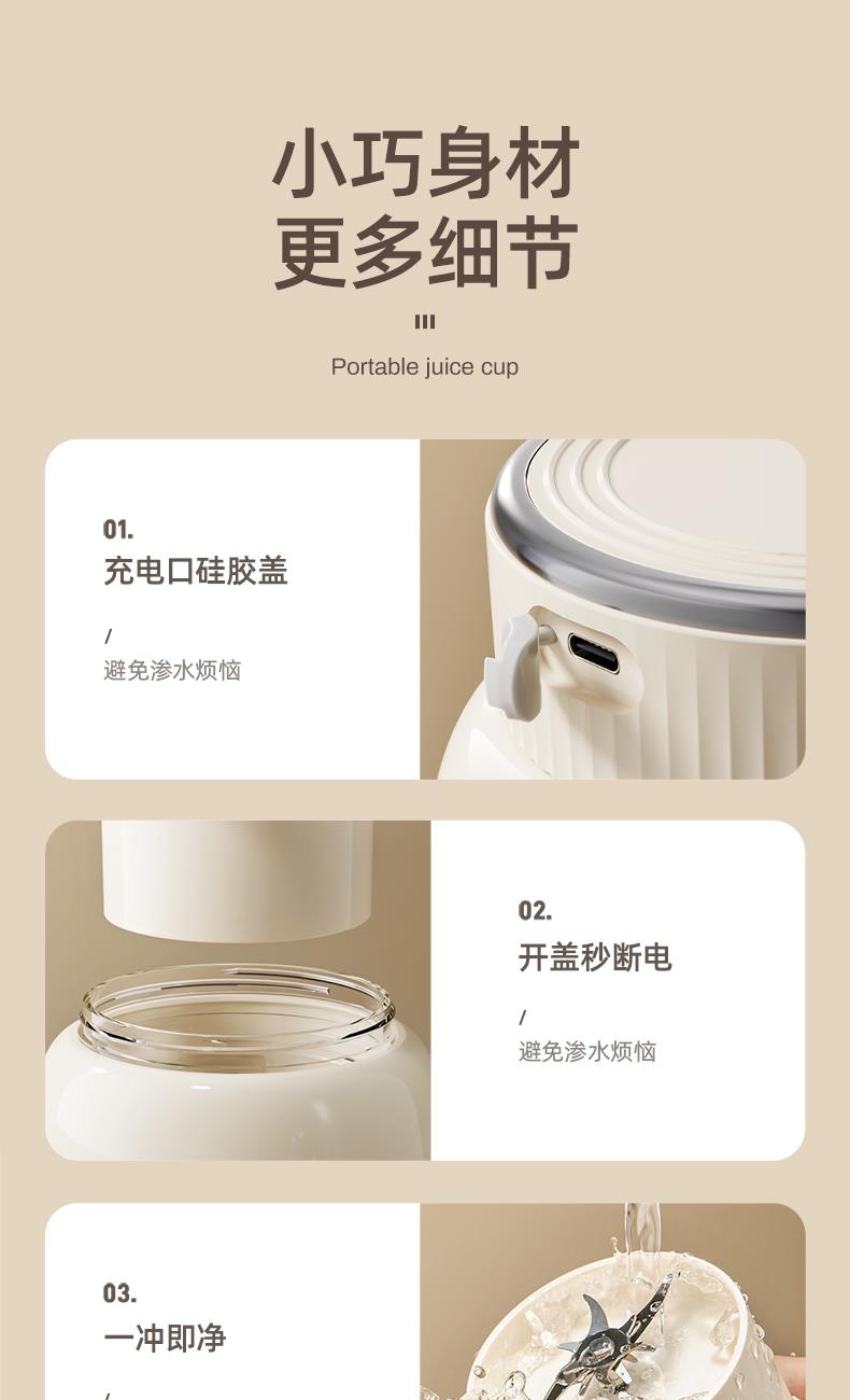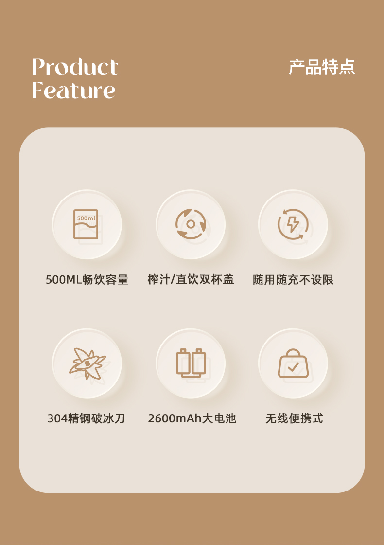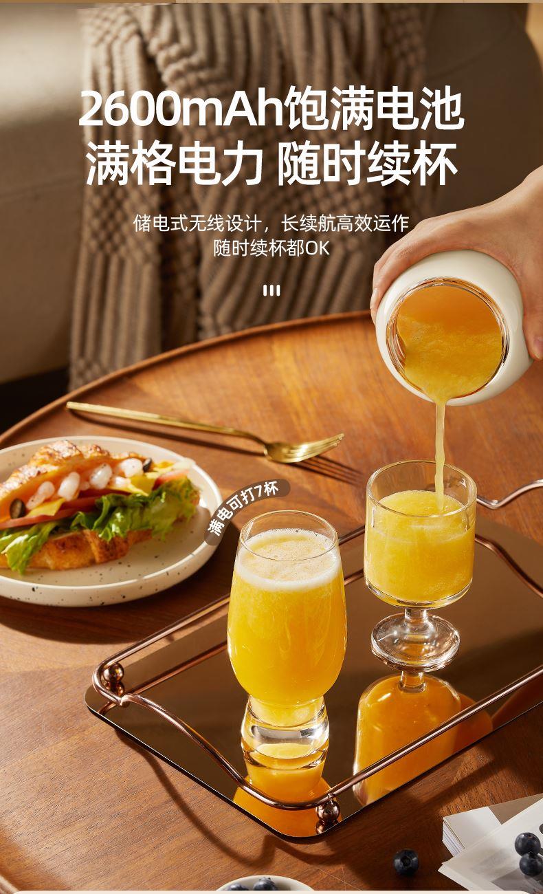 1.无线便携、轻松随行 2.2600mAh电池超长续航、动力持久 3.500ml鲜榨大容量 4.双盖设计、灵活百搭 5.304不锈钢刀刃 主要材质:PP+PC+304不锈钢 功率:70W 电池容量:2600mAh 容量:500ML 颜色:亚米白