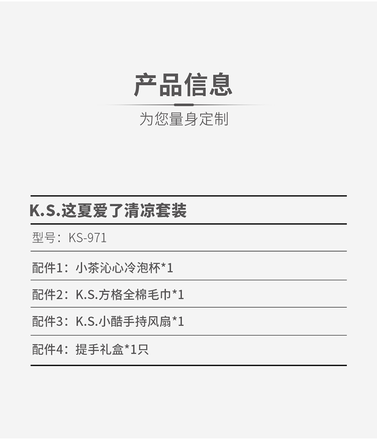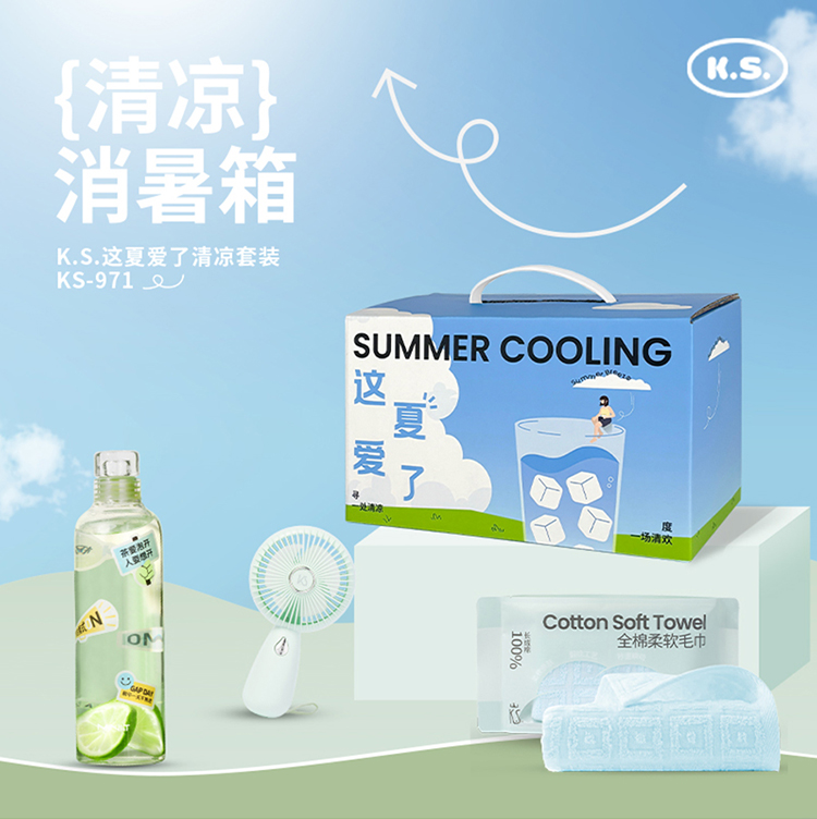 材质:冷泡杯/杯体(高硼硅玻璃)密封圈(硅胶) 上盖(TPE) 全棉毛巾/99.99%棉 风扇/塑胶,电子原件 规格:冷泡杯/6.5*22.7CM/500ml 全棉毛巾/34x74CM/90克 风扇/16*4.5*8cm 包装:手提彩盒 以蓝天白云草地为底,手绘人物惬意倚坐巨型冰饮杯,翻涌的碳酸气泡与草叶摇曳交织,开启夏日沁凉遐想。开盒瞬间冰爽感扑面而来。更适用于高温关怀员工福利/商务合作伴手礼、夏日快闪、亲子露营、音乐节伴手礼等等。 套装内配有:冷泡杯、全棉毛巾、手持风扇。 小批量灵活定制企业LOGO,可自由组合套装内容,夏日的热浪,挡不住心动的理由。