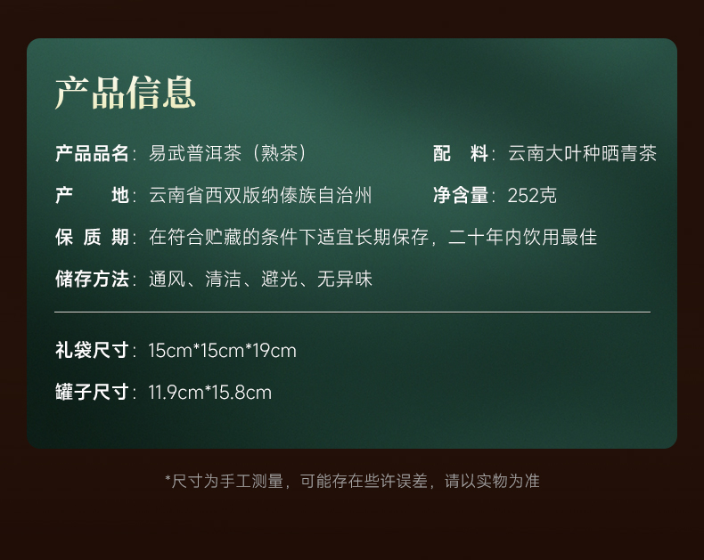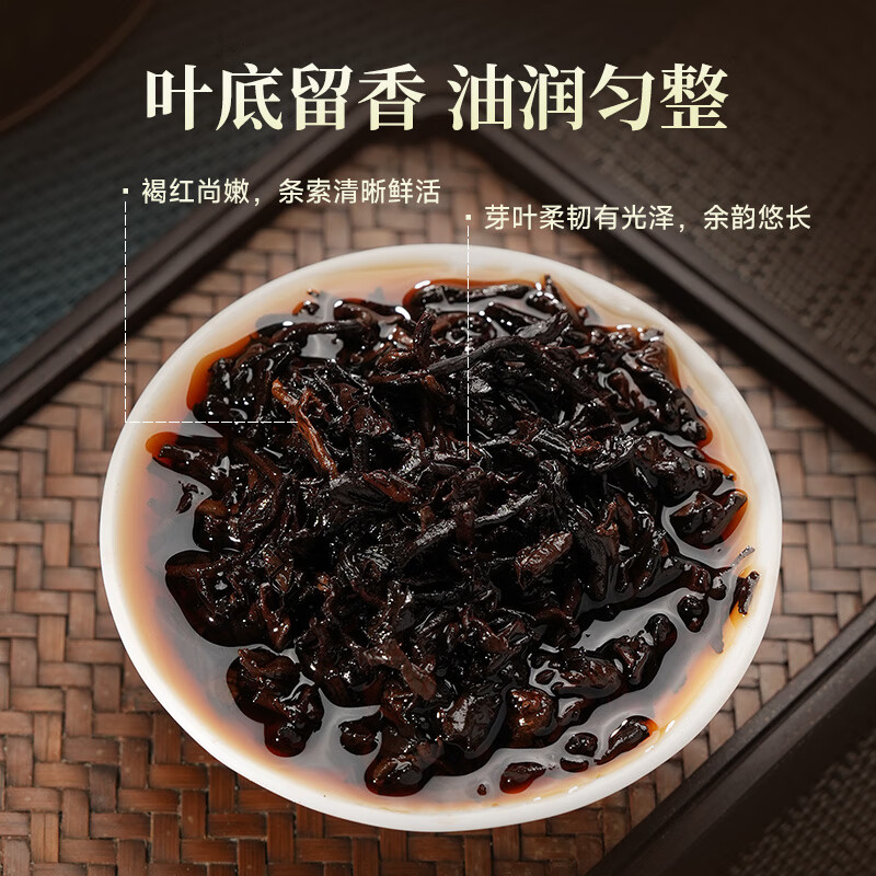 《品质特征》匀整肥硕 珠圆叶润 10年优质原料才能入选 陈韵熟普,芽头粗大 红褐油润,内外一口料 香气高扬 甜滑香糯到手 就是年份茶 入口润滑甜柔,过喉舒适 水路细腻,无堆味杂味 叶底留香 油润匀整 适合大多数人饮用的熟茶 褐红尚嫩,条索清晰鲜活 芽叶柔韧有光泽,余韵悠长。