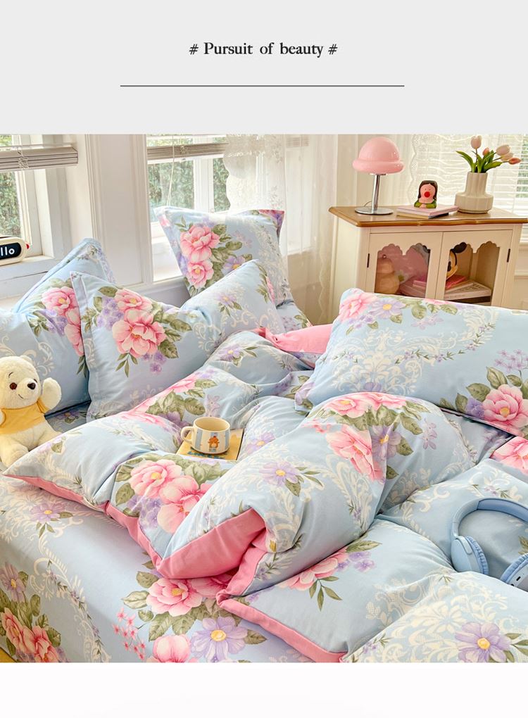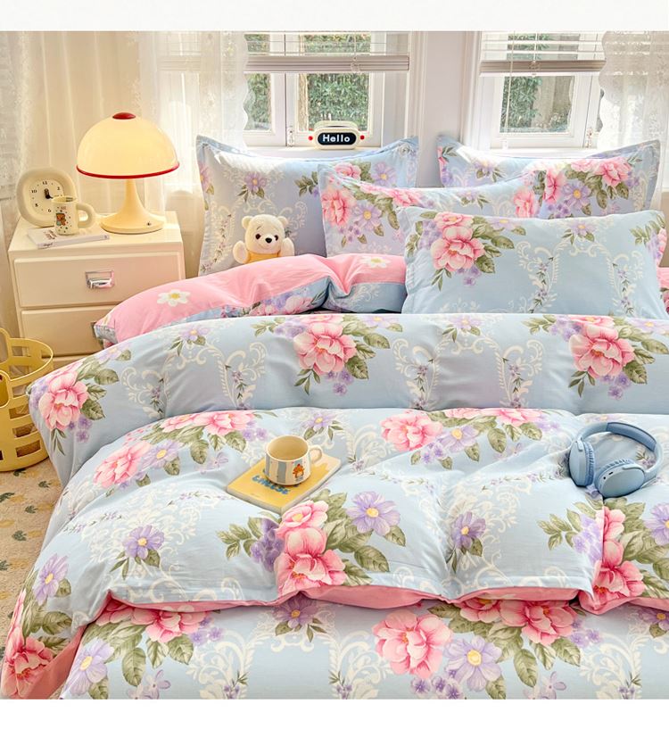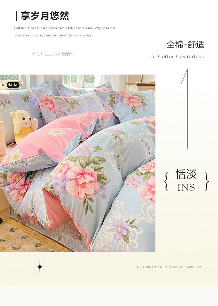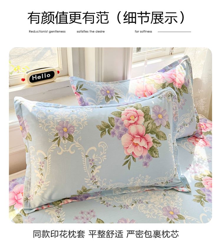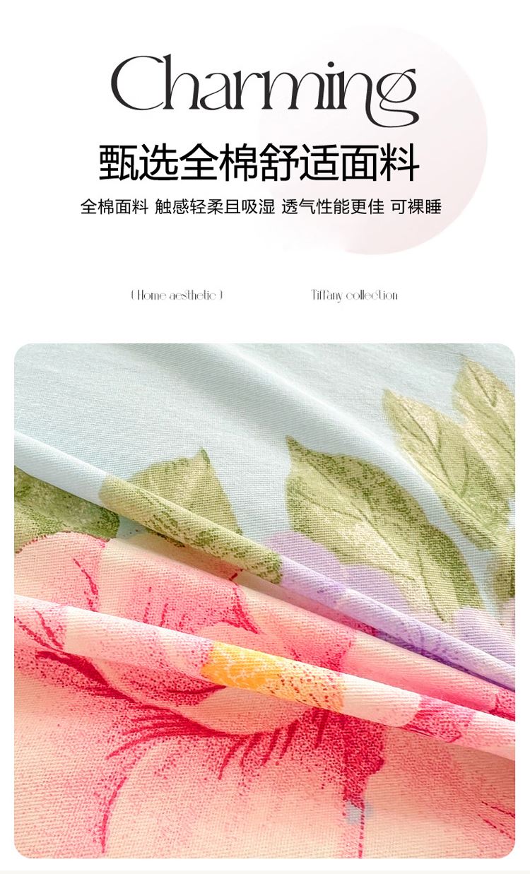 品 名:花叶倾城 规 格:1.5米/1.8米床通用 被 套:200*230cm 床 单:230*245cm 枕 套:48*74cm*2 克 重:1.86KG 面 料:纯棉 40S