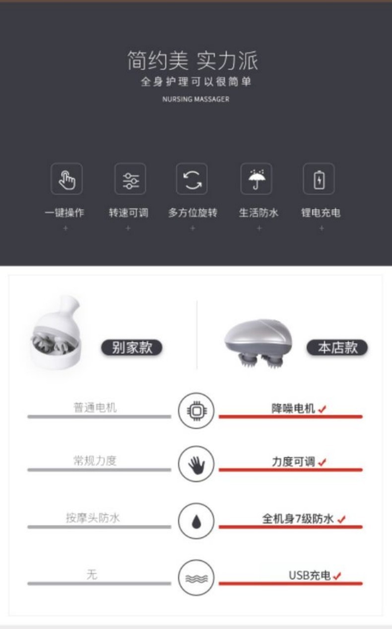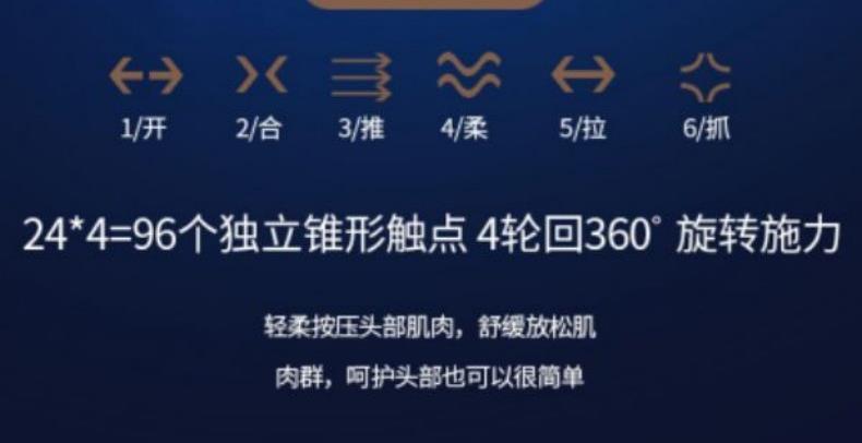 头痛无法忍受?学习压力大记忆力下降?工作紧张头晕脑胀?年纪增大容易失眠 试试米狗智能头部按摩仪 1、舒适仿真按摩;3D硅胶软按摩头,立体触摸头皮解压醒神,不伤头皮不缠头发 2、一机多用哪酸按哪,全身舒适按摩(头部、肩颈、手臂、腿部、腰腹) 3、降噪电机,3档位自由切换,一键操作、简单方便,可根据按摩需求自由调节,保证头皮舒适的按摩力度 4、无线便于携带;简单一键操作;USB充电;正转反转抓揉 5、干湿两用;7级防水、按摩头可拆卸清洗 6、超长续航 持久耐用;充满电2小时,续航6小时