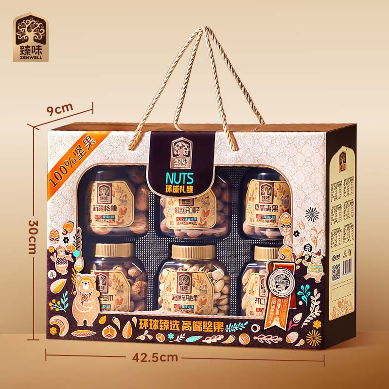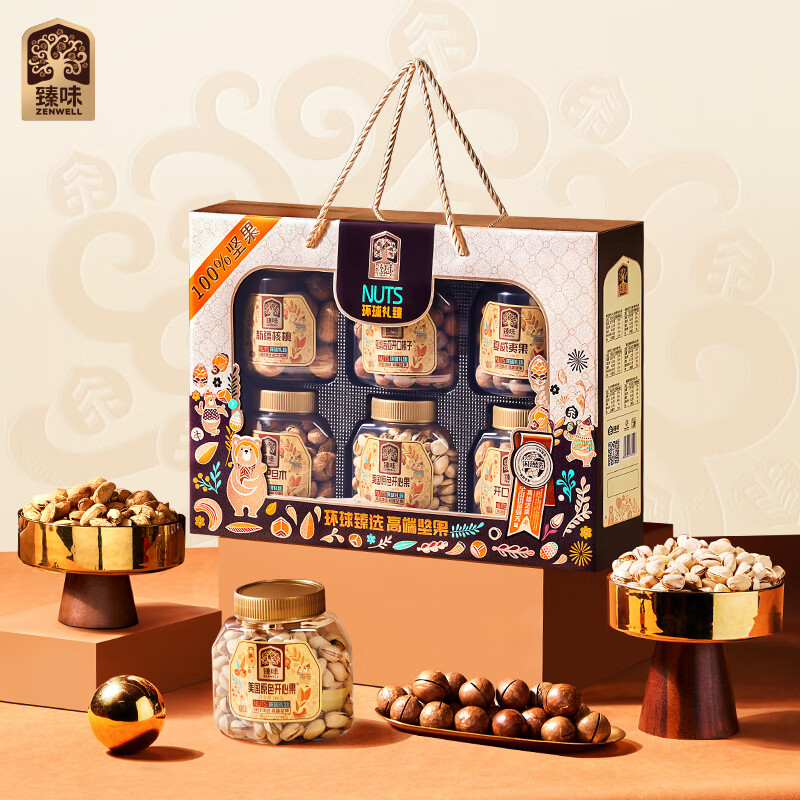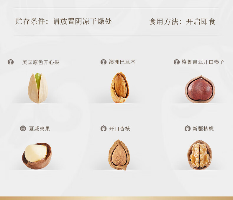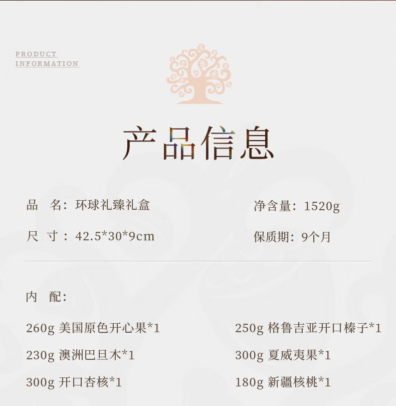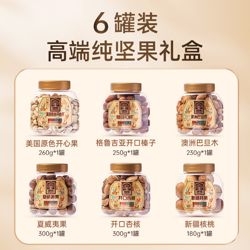 260g美国原色开心果 *1 250g格鲁吉亚开口榛子*1 230g澳洲巴旦木*1 300g夏威夷果*1 300g开口杏核*1 180g新疆核桃*1 环球礼臻,臻选全球每一颗果粒。礼盒采用传统金咖配色,烫金工艺配以反差的色彩元素 ,彰显时尚、典雅的风格、净含量:1520g,内配6种坚果,纯坚果礼盒;内配丰富齐全