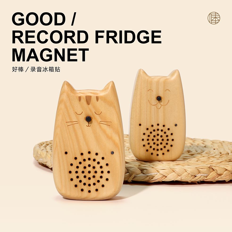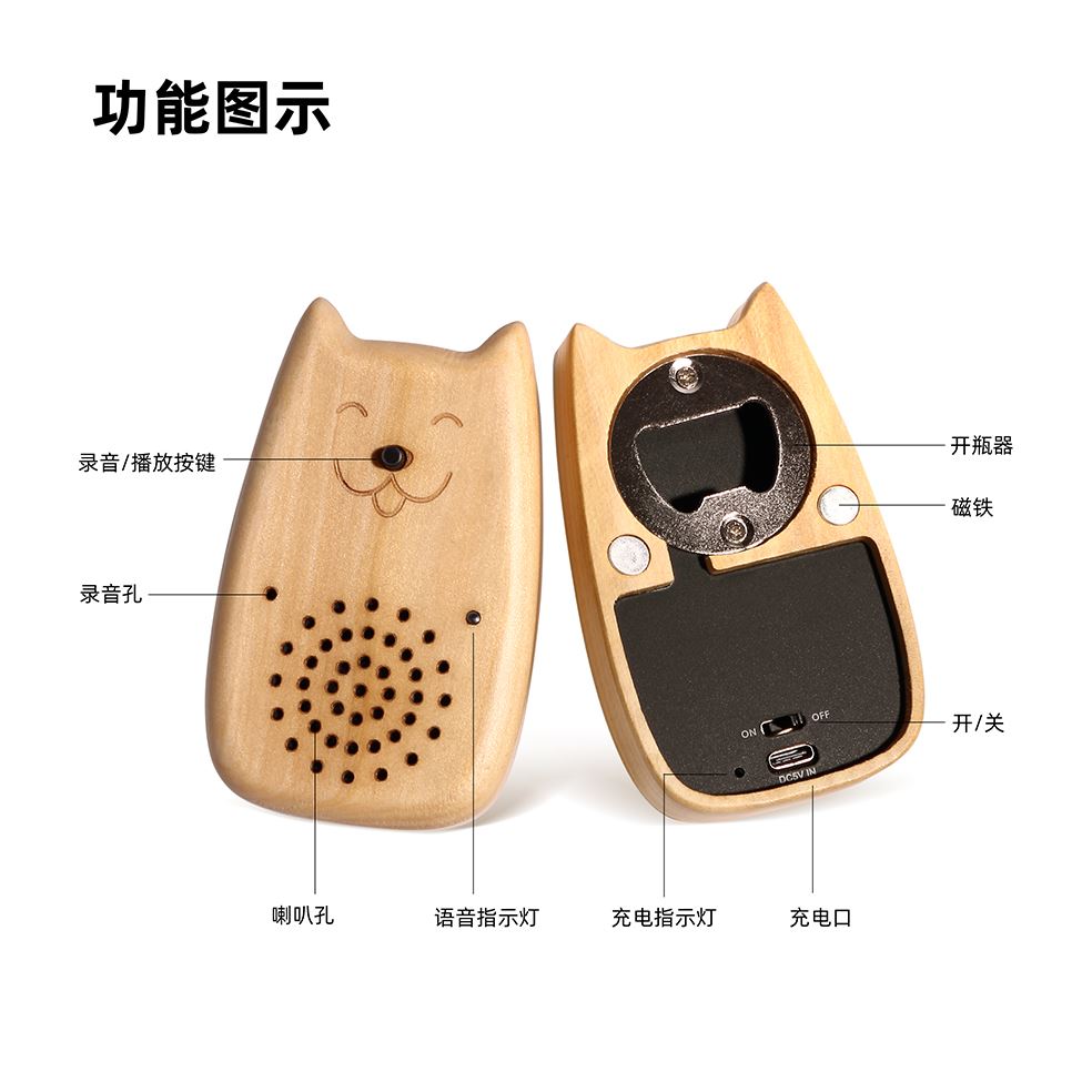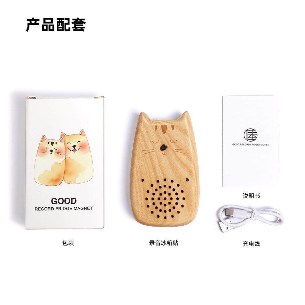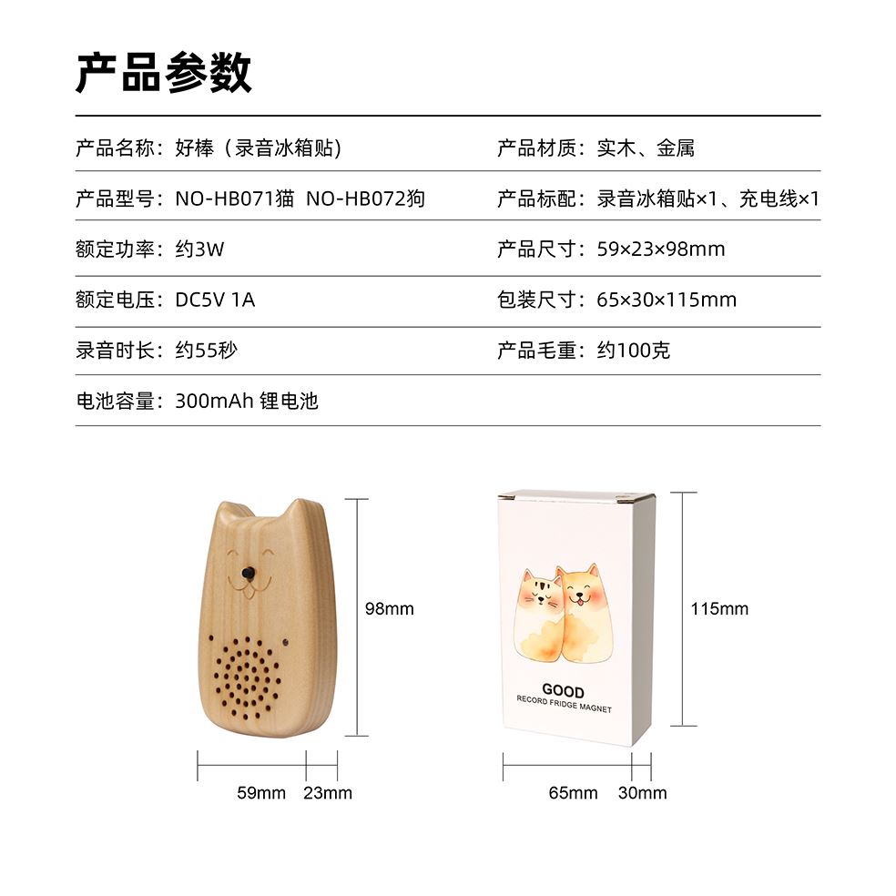 录音冰箱贴 产品型号:NO-HB071猫 NO-HB072狗 额定功率:约3W 额定电压:DC5V1A 录音时长:约55秒 产品材质:实木、金属 产品标配:录音冰箱贴*1、充电线*1 产品尺寸:59*23*98mm 包装尺寸:65*30*115mm 产品毛重:约100g 电池容量:300mAh 锂电池