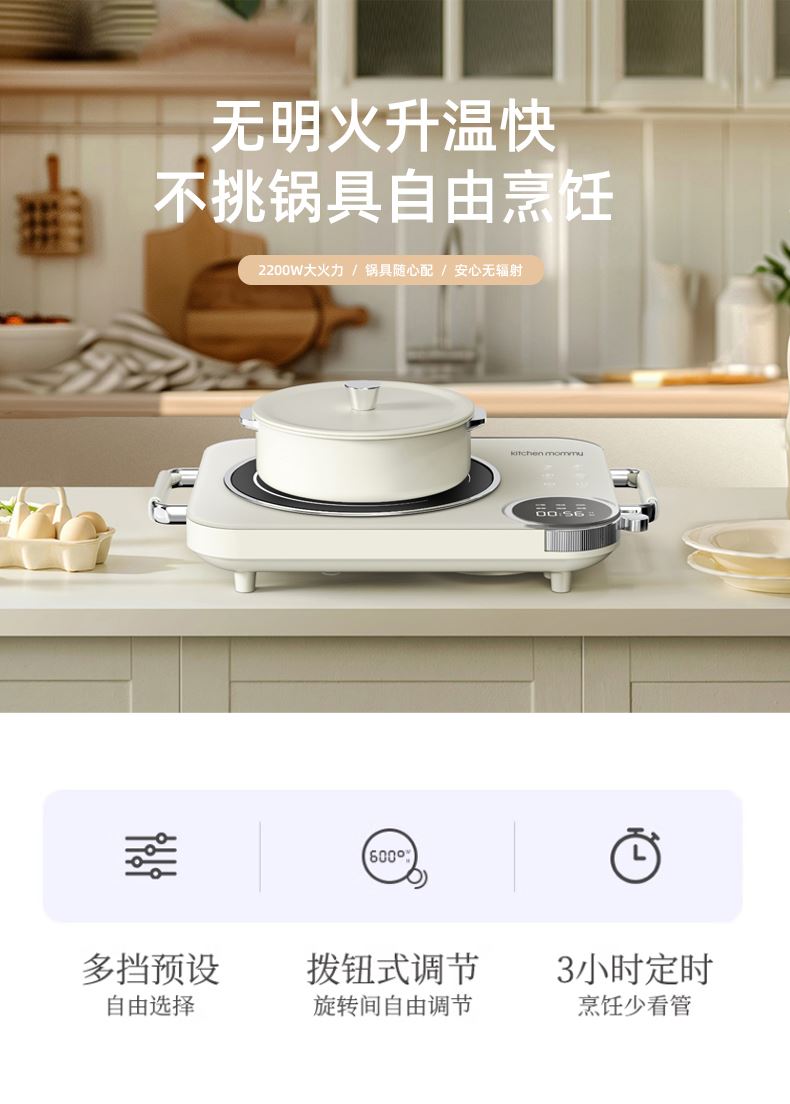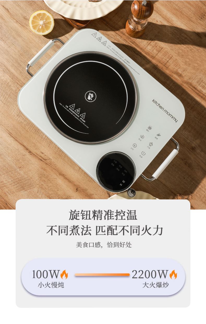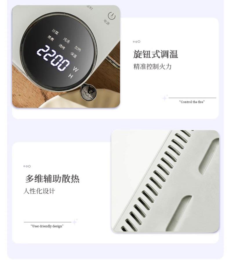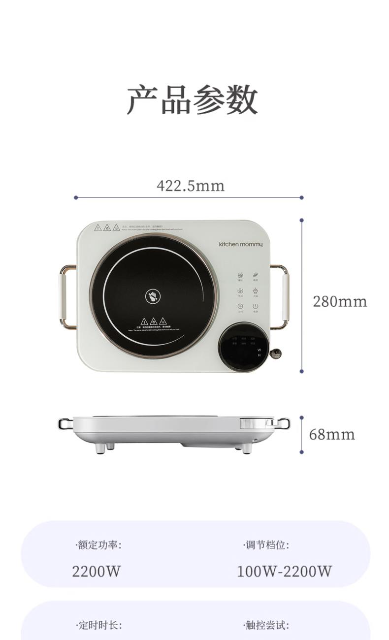 功率:2200W 电压:220V 产品颜色:白色 单台毛重:2.6Kg 整箱毛重17KG 材质:外壳PP+玻璃面板 彩盒包装尺寸:445*100*335mm 外箱包装尺寸:550*350*475mm 推荐理由: 1、不挑锅具,陶瓷锅,砂锅,珐琅锅,铁锅,高硼硅玻璃锅都可以用 2、手动旋钮100-2200W火力无极调节,解决湿手按键失灵的问题 3、2200W大功率,火力猛,预热快 4、微晶面板不怕骤冷骤热防爆,不横向导热 5、拥有防爆,高温断电,漏电保护等多重安全保护机制 无明火,无辐射,更安全