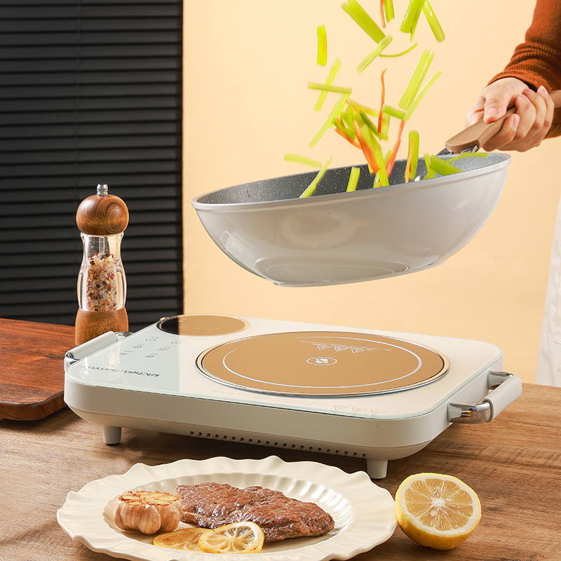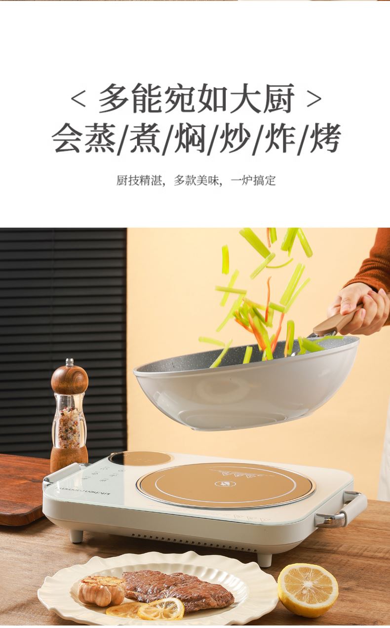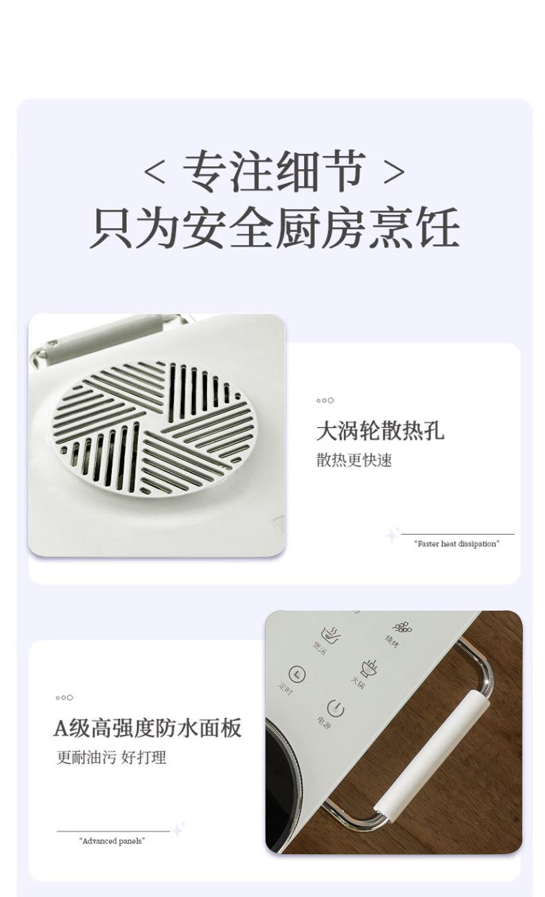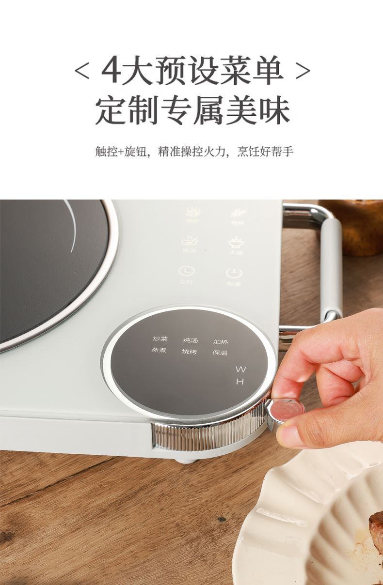 功率:2200W 电压:220V 产品颜色:白色 单台毛重:2.6Kg 整箱毛重17KG 材质:外壳PP+玻璃面板 彩盒包装尺寸:445*100*335mm 外箱包装尺寸:550*350*475mm 推荐理由: 1、不挑锅具,陶瓷锅,砂锅,珐琅锅,铁锅,高硼硅玻璃锅都可以用 2、手动旋钮100-2200W火力无极调节,解决湿手按键失灵的问题 3、2200W大功率,火力猛,预热快 4、微晶面板不怕骤冷骤热防爆,不横向导热 5、拥有防爆,高温断电,漏电保护等多重安全保护机制 无明火,无辐射,更安全