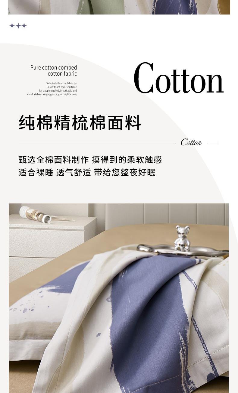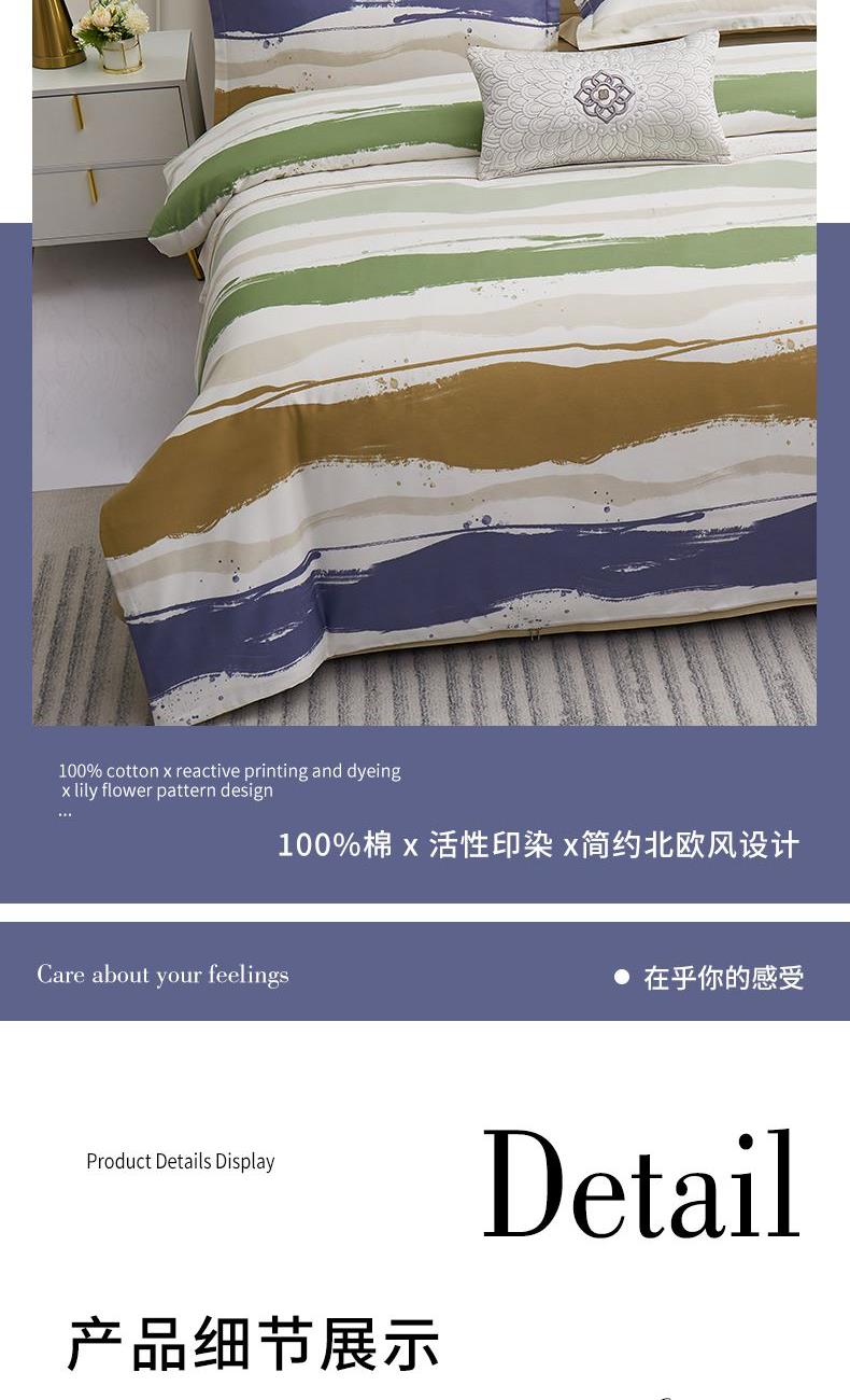 产品型号:S02025003 被 套:200*230cm 床 单:230*245cm 枕 套:48*74cm*2 面 料:棉 装 箱 数:7 纯棉精梳棉面料,活性印染,手感细腻、亲肤透气; 花型设计采用简约北欧风,不挑家装风格; 天地盖礼盒包装,自用送礼两相宜。