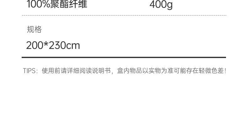 产品型号:Q01025001 规 格:200*230cm 填 充:聚酯纤维 填充物重量:400g 面 料:聚酯纤维 装 箱 数:12条/箱 超柔水洗棉面料,触感柔软,吸湿透气; 整张3D卷曲绵填充,机洗不空边;机包边工艺,长期使用不板结; 精美礼盒包装,自用送礼两相宜。