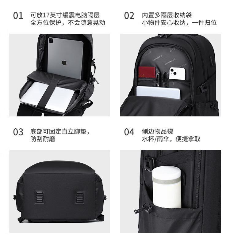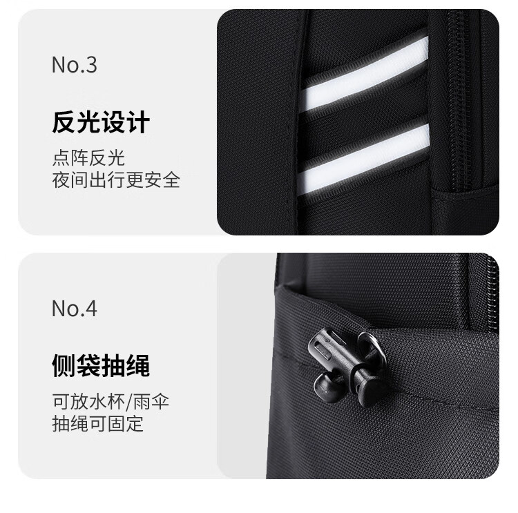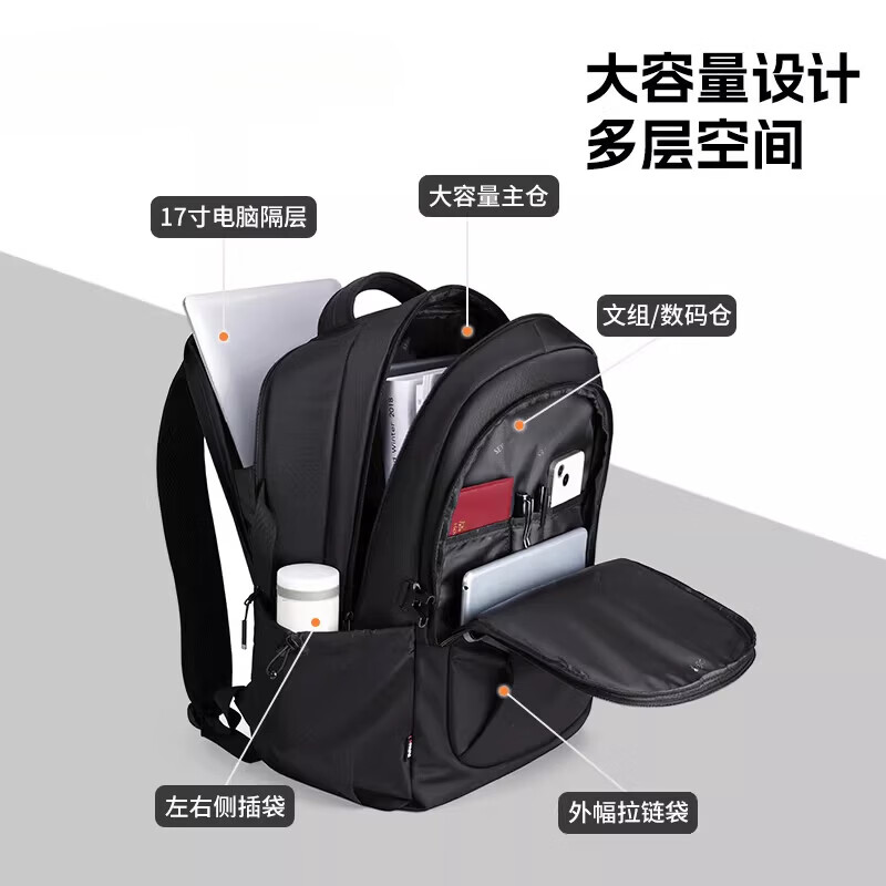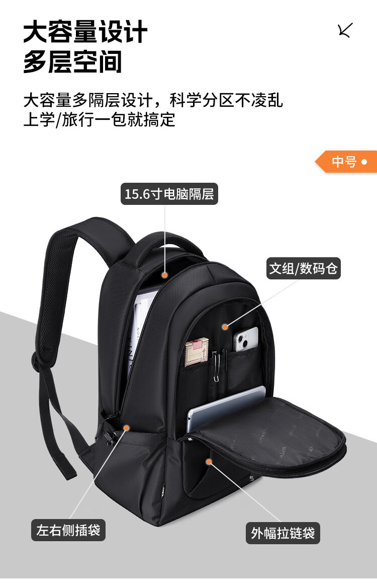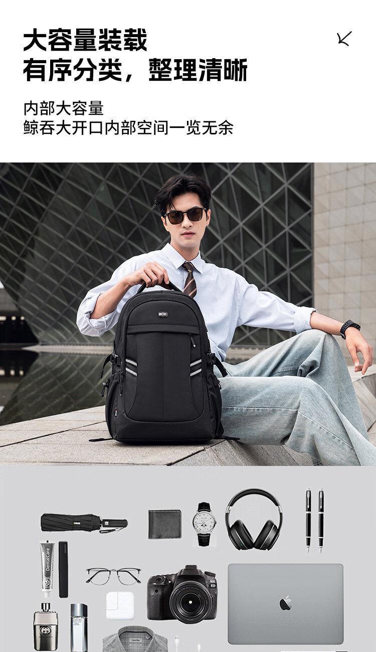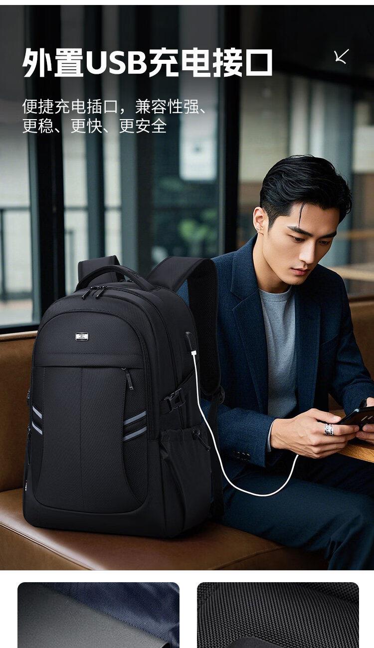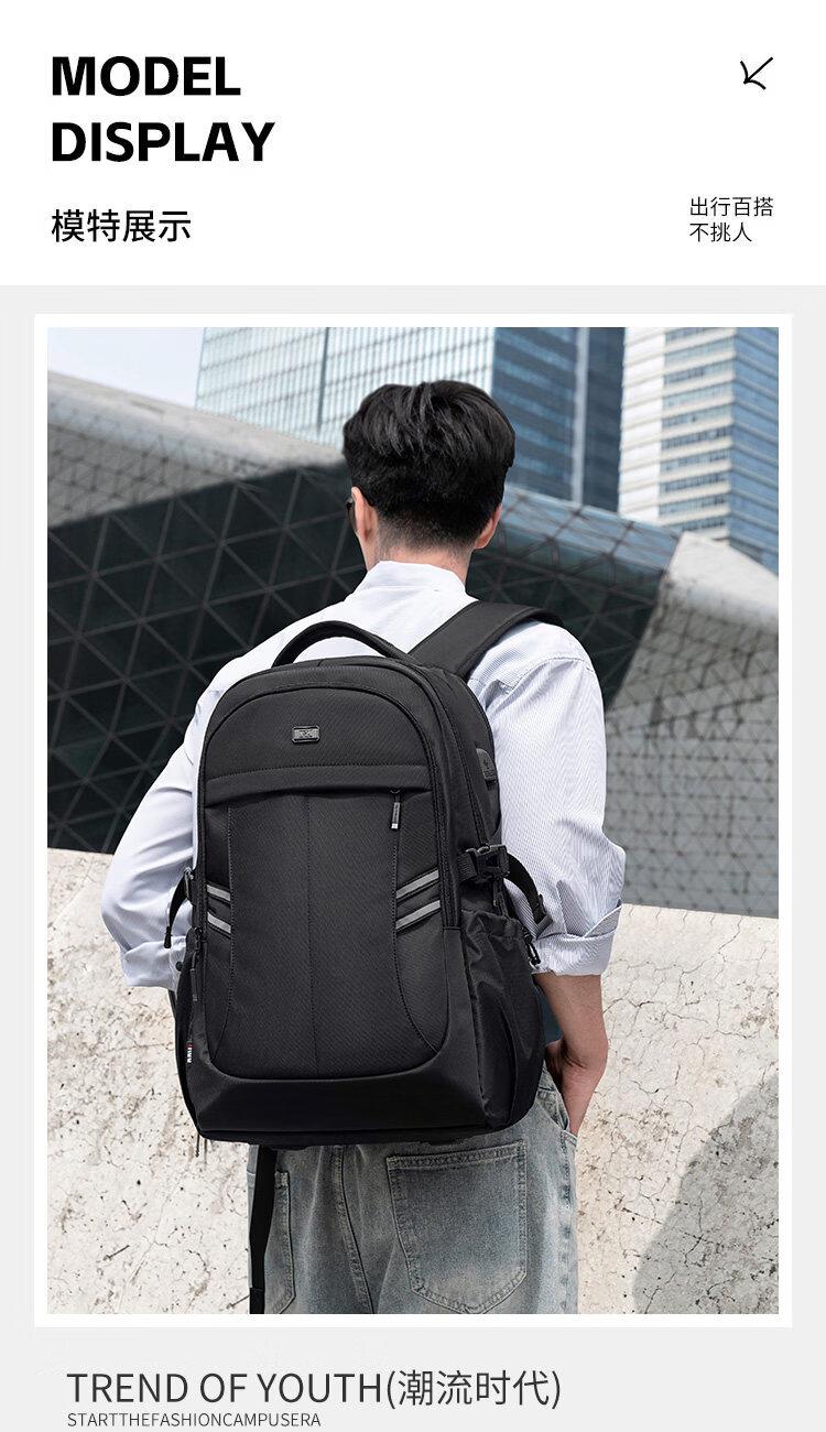 类别:背包 外部材质:织物 闭合方式:拉链 规格:300x180x440mm 容纳电脑尺寸:15.6英寸 风格:通勤风 商务风 携包出行,旅途无忧,立体挺括包型兼顾时尚外观与功能性,轻松驾驭多种都市出行场景 内里大容装载,多层收纳空间,满足多样收纳需求,轻装出行,采用高密度织物面料,防刮耐用,防泼贱,轻松应对泼水,便携外置USB充电接口,3D透气蜂窝设计,柔软减压肩带