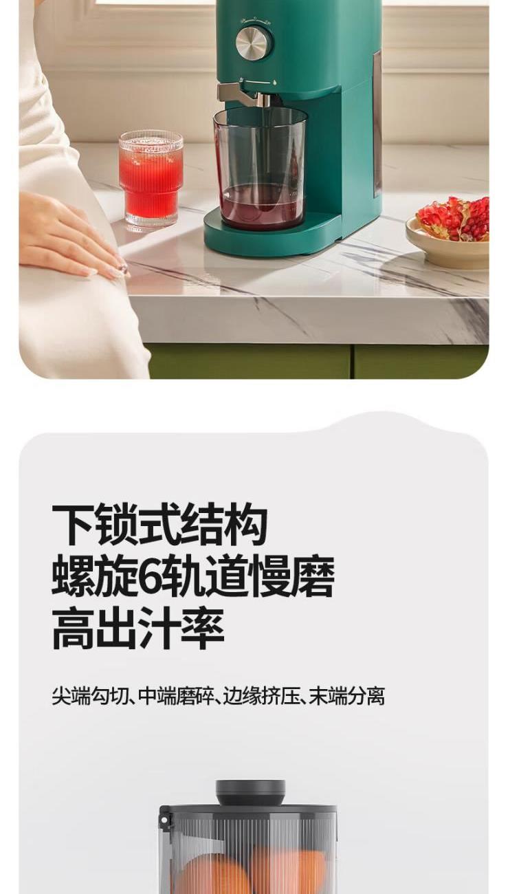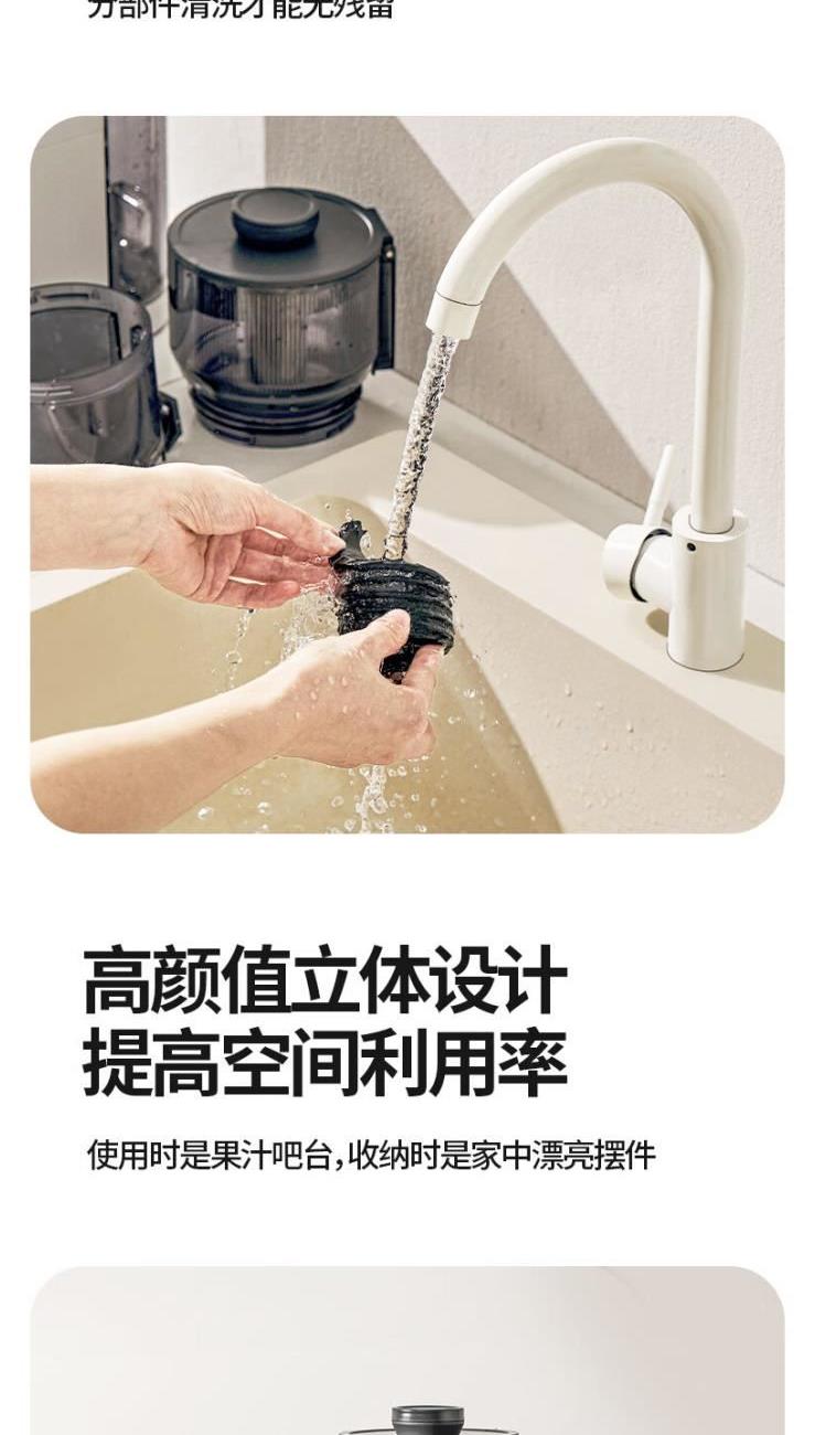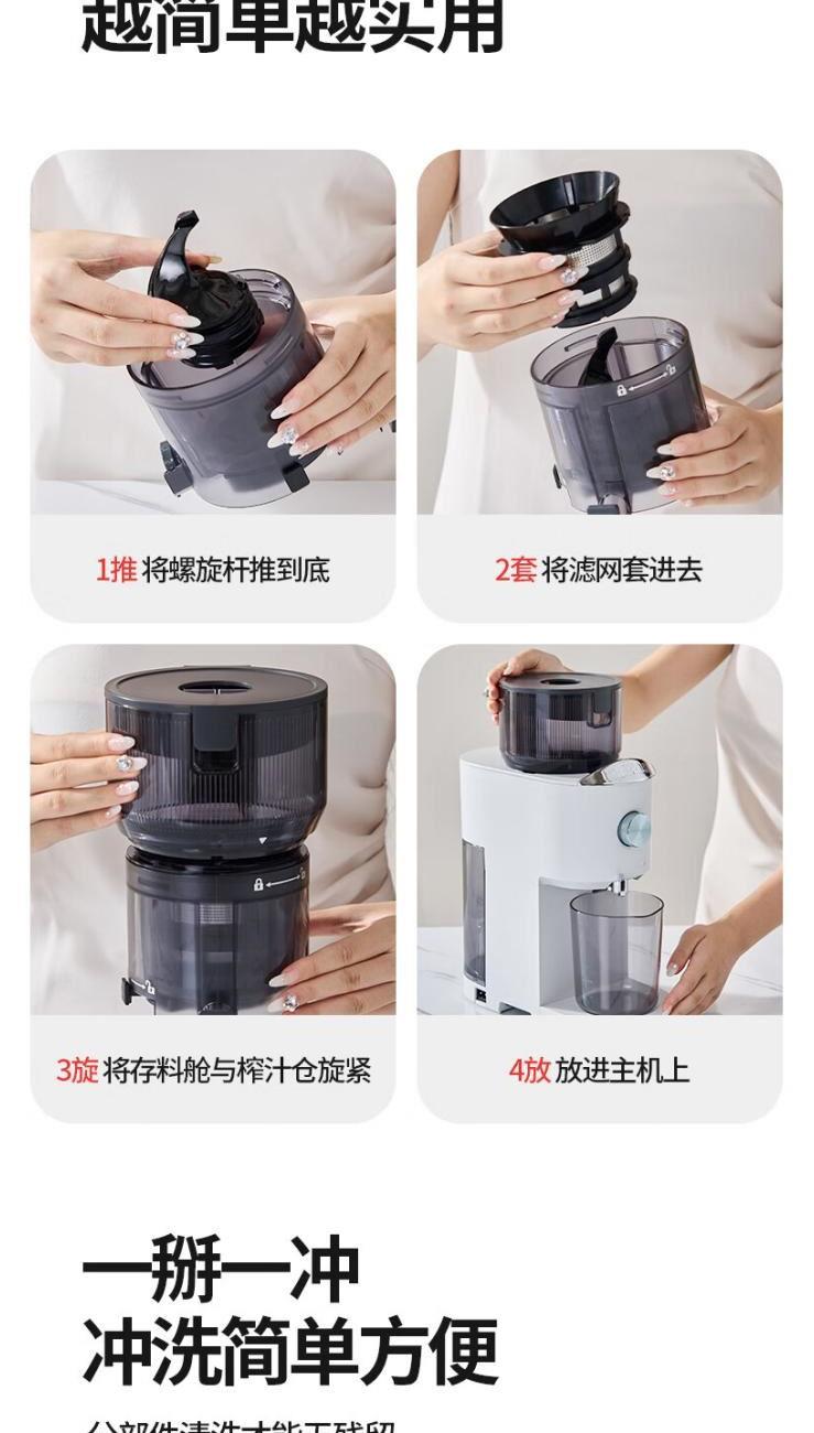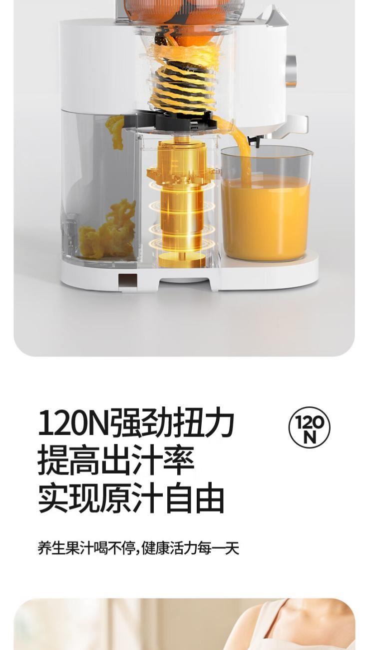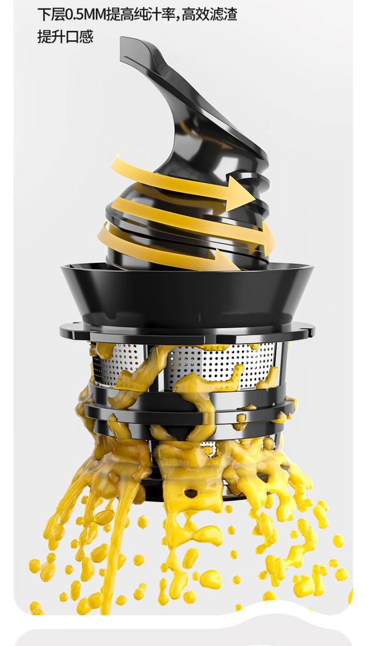 额定电源 :220V~50Hz 额定功率 :100W 接汁杯容量:1.5L 接渣桶容量:0.9L 净 重 : 2.8kg 产品尺寸 :275mmx140mm x383mm (含推进杆) 多功能:一机多用,蔬果汁、豆浆、辅食、厨房佐料、水果冰淇淋等一机搞定! 安全&健康:无刀片低温慢速压榨,使用安全,减少破坏纤维和VC更健康; 榨汁方便:130mm升级大口径,外部下锁式螺旋,进料面积大,果蔬免切混合一次榨,不用老投料,食材易搅打不打转,连皮都能榨; 清洁优势:结构简单,5秒拆装清洗方便,主机创新干湿分离设计,主机免洗更耐用; 细腻无渣:微孔过滤隔渣,汁渣分离,果汁细腻口感好,孩子喜欢,家长放心; 材质安全:食品级材质,接触各种酸碱食材都能放心; 技术优势:直流电机,动力强劲,耐用不卡机,西芹整根榨,更抗造更降噪; 贴心设计:防卡机感应、自动反转设计、榨汁无需看管更省心。