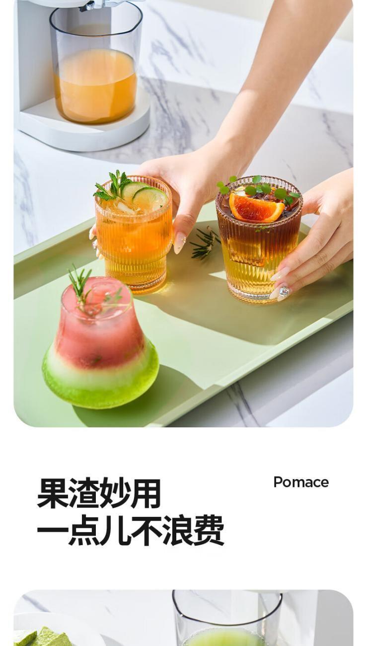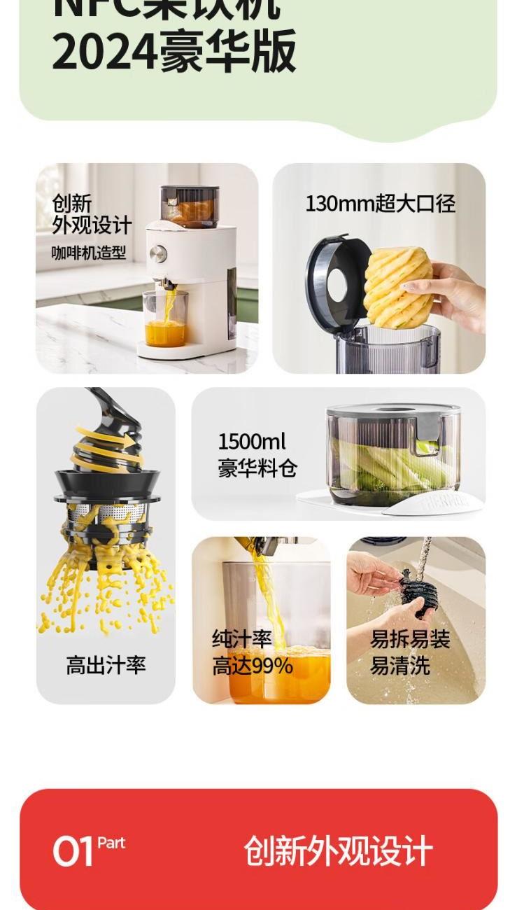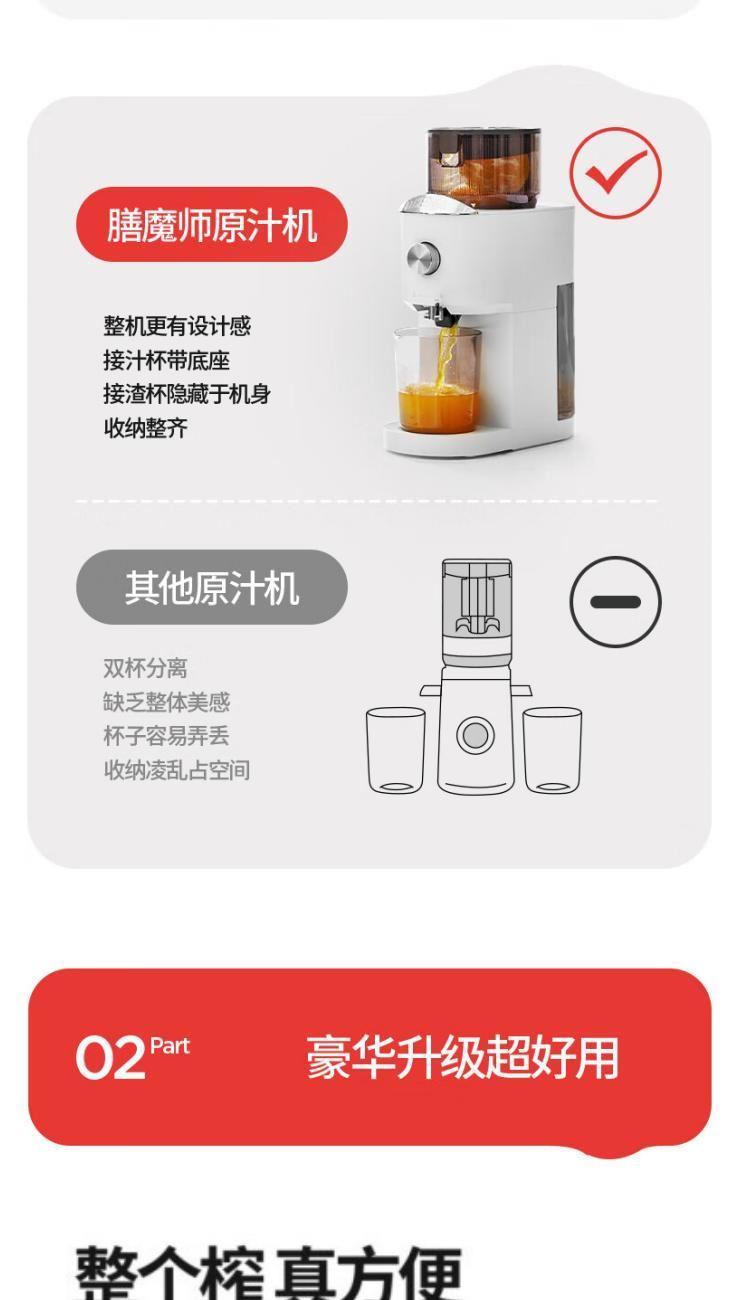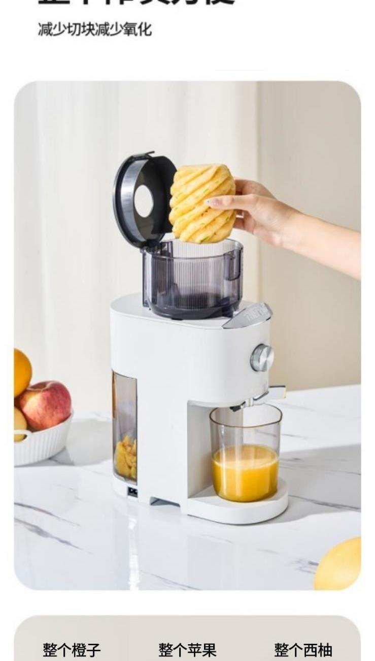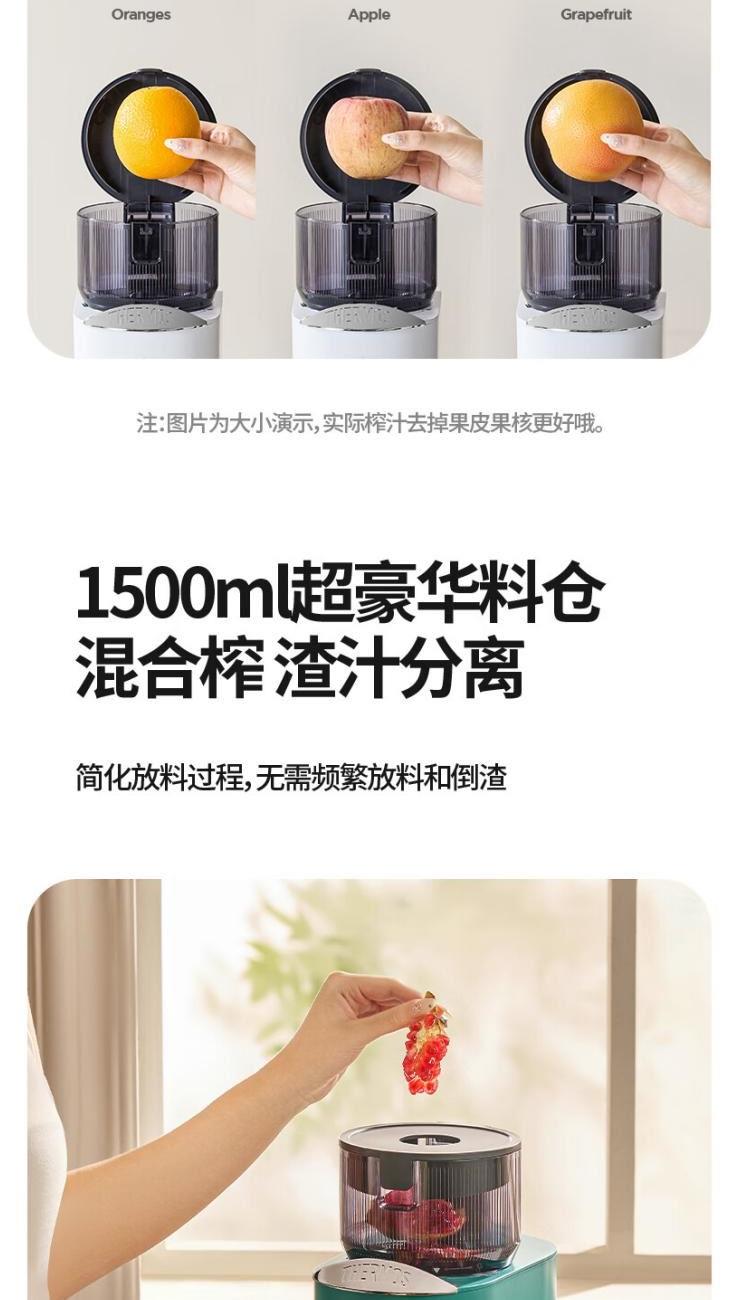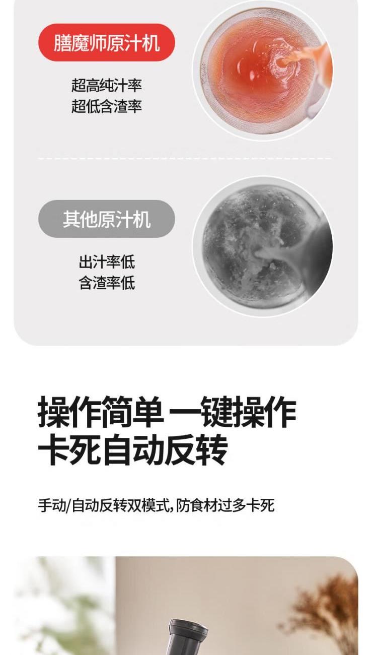 额定电源 :220V~50Hz 额定功率 :100W 接汁杯容量:1.5L 接渣桶容量:0.9L 净 重 : 2.8kg 产品尺寸 :275mmx140mm x383mm (含推进杆) 多功能:一机多用,蔬果汁、豆浆、辅食、厨房佐料、水果冰淇淋等一机搞定! 安全&健康:无刀片低温慢速压榨,使用安全,减少破坏纤维和VC更健康; 榨汁方便:130mm升级大口径,外部下锁式螺旋,进料面积大,果蔬免切混合一次榨,不用老投料,食材易搅打不打转,连皮都能榨; 清洁优势:结构简单,5秒拆装清洗方便,主机创新干湿分离设计,主机免洗更耐用; 细腻无渣:微孔过滤隔渣,汁渣分离,果汁细腻口感好,孩子喜欢,家长放心; 材质安全:食品级材质,接触各种酸碱食材都能放心; 技术优势:直流电机,动力强劲,耐用不卡机,西芹整根榨,更抗造更降噪; 贴心设计:防卡机感应、自动反转设计、榨汁无需看管更省心。