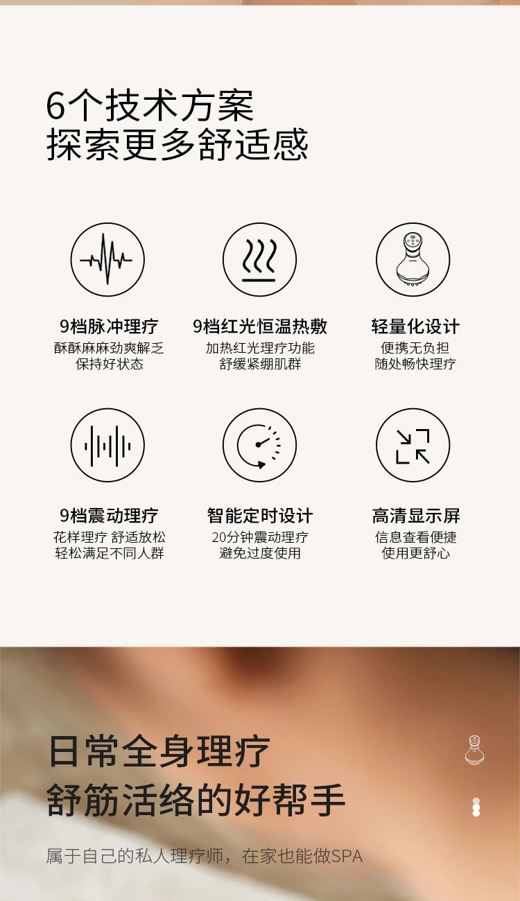 产品尺寸:90*90*150mm 彩盒尺寸:186*152*102mm 外箱尺寸; 480*390*510mm 单台净重:203g 单台毛重:572g 包装材料:彩盒+大外箱 额定电压:5V= 额定功率:15W 额定频率:50/60Hz 材质:ABS 电池容量:1200毫安 1、9档脉冲理疗、9档红光恒温热敷 2、20分钟震动理疗,智能定时设计 3、轻量化设计 便携无负担,随处畅快理疗