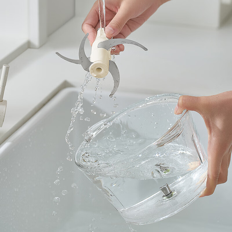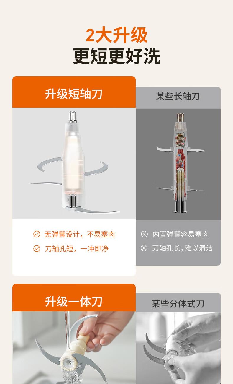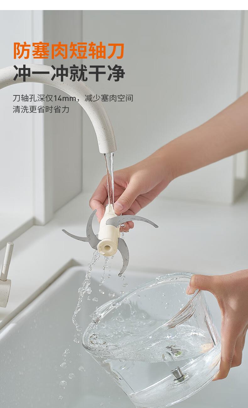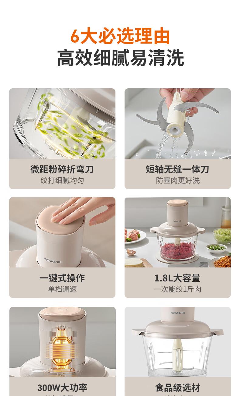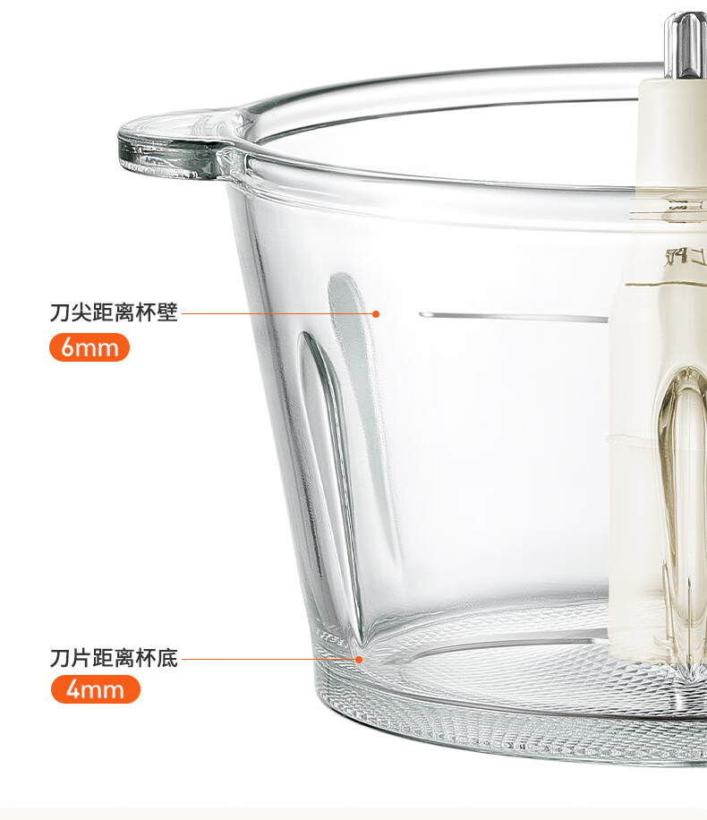 1、微距粉碎折弯刀,贴壁贴底食材绞打均匀不结块; 2、更好洗:底部短轴&无弹簧刀轴,防止塞肉更好清洗; 3、更贴心:1.8L玻璃杯,一次绞打1斤肉(效果较好); 4、好操作:单档调速,一键轻松操作。