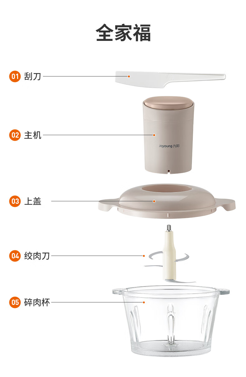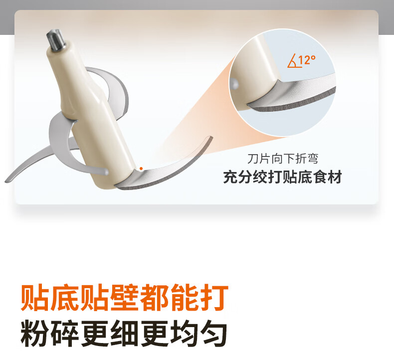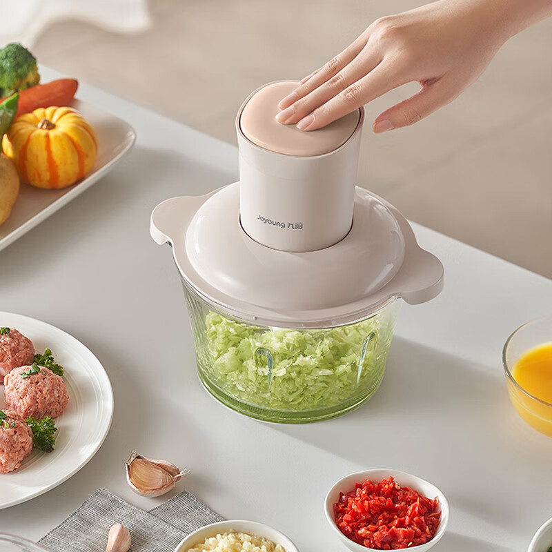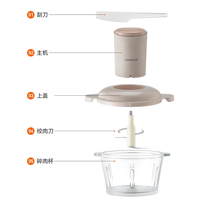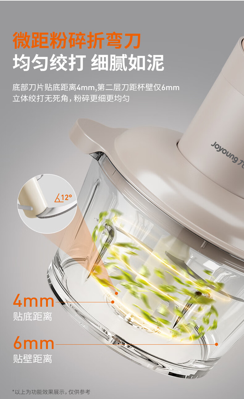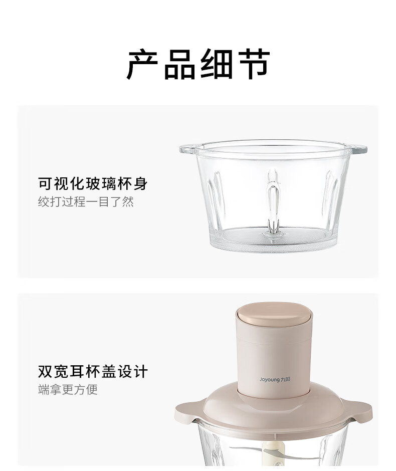 1、微距粉碎折弯刀,贴壁贴底食材绞打均匀不结块; 2、更好洗:底部短轴&无弹簧刀轴,防止塞肉更好清洗; 3、更贴心:1.8L玻璃杯,一次绞打1斤肉(效果较好); 4、好操作:单档调速,一键轻松操作。
