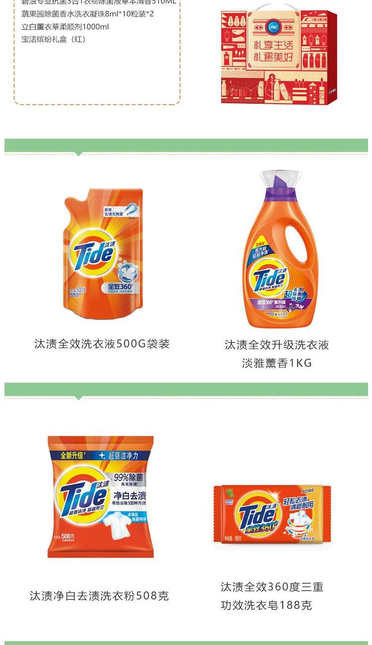 汰渍全效升级洗衣液淡雅薰香1KG 汰渍全效洗衣液500G袋装 汰渍净白去渍洗衣粉508克 汰渍全效360度三重功效洗衣皂188克 碧浪专业3合1衣物液草本清香510ML 蔬果园香水洗衣凝珠8ml*10粒装*2 立白薰衣草柔顺剂1000ml 宝洁缤纷礼盒(红)