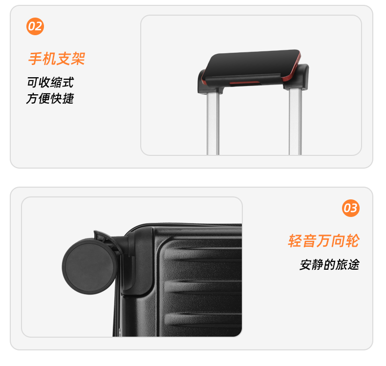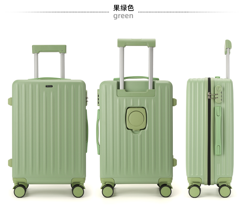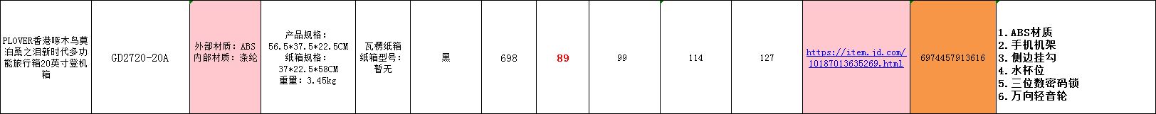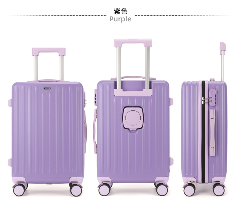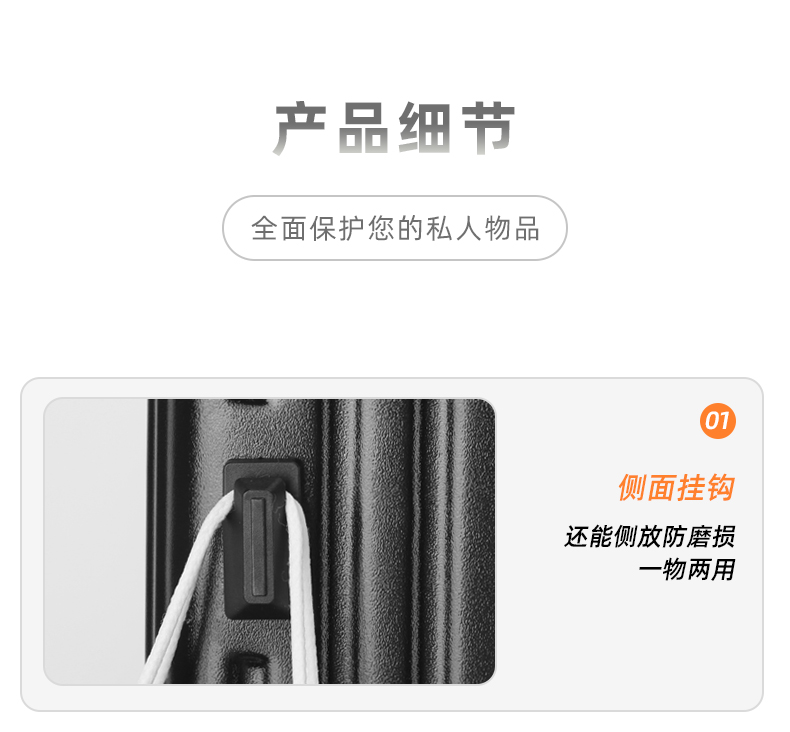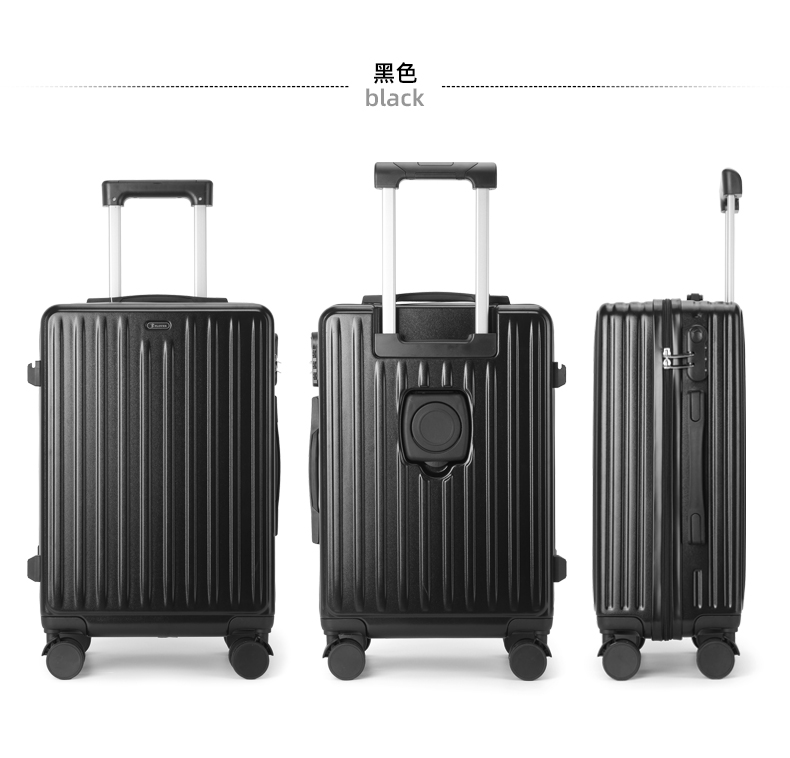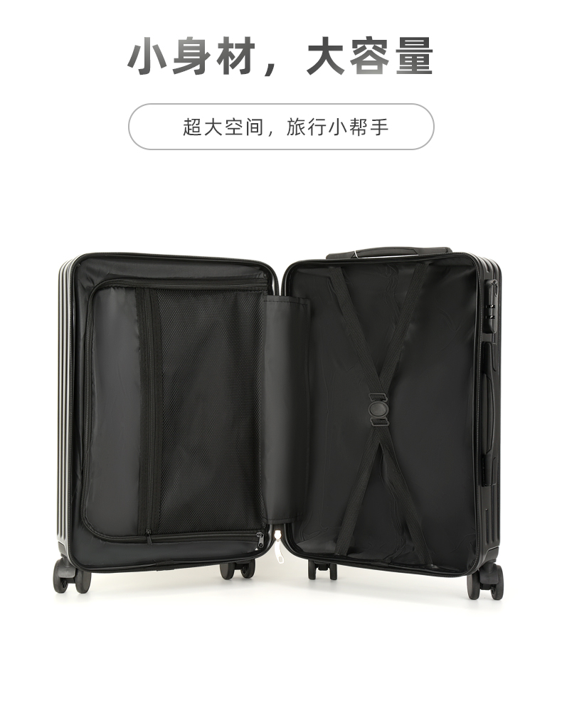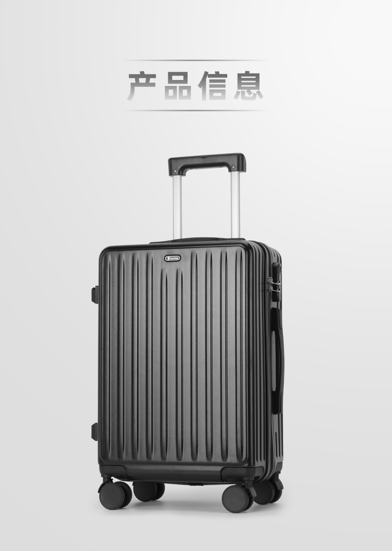外部材质:ABS 内部材质:涤纶 产品规格:56.5*37.5*22.5CM 重量:3.45kg 瓦楞纸箱 1.ABS材质 2.手机机架 3.侧边挂勾 4.水杯位 5.三位数密码锁 6.万向轻音轮"