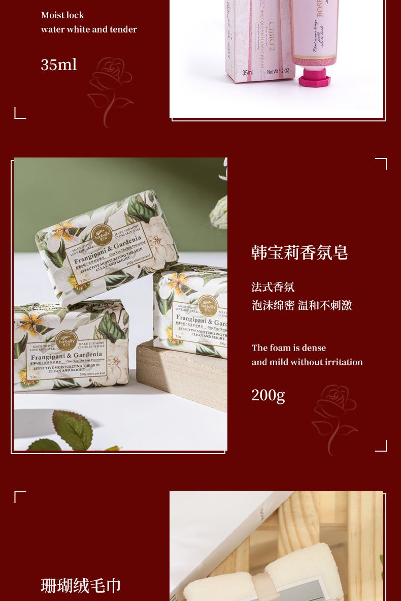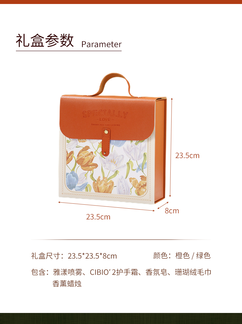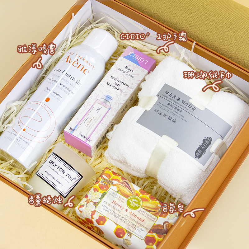 礼盒尺寸:23.5*23.5*8cm 雅漾喷雾:150ml 韩宝莉香氛皂:200g cibio护手霜:35ml 香薰蜡烛 珊瑚绒毛巾