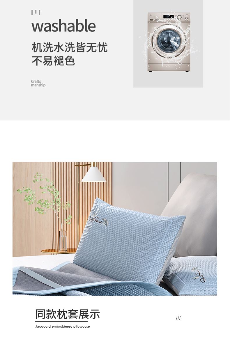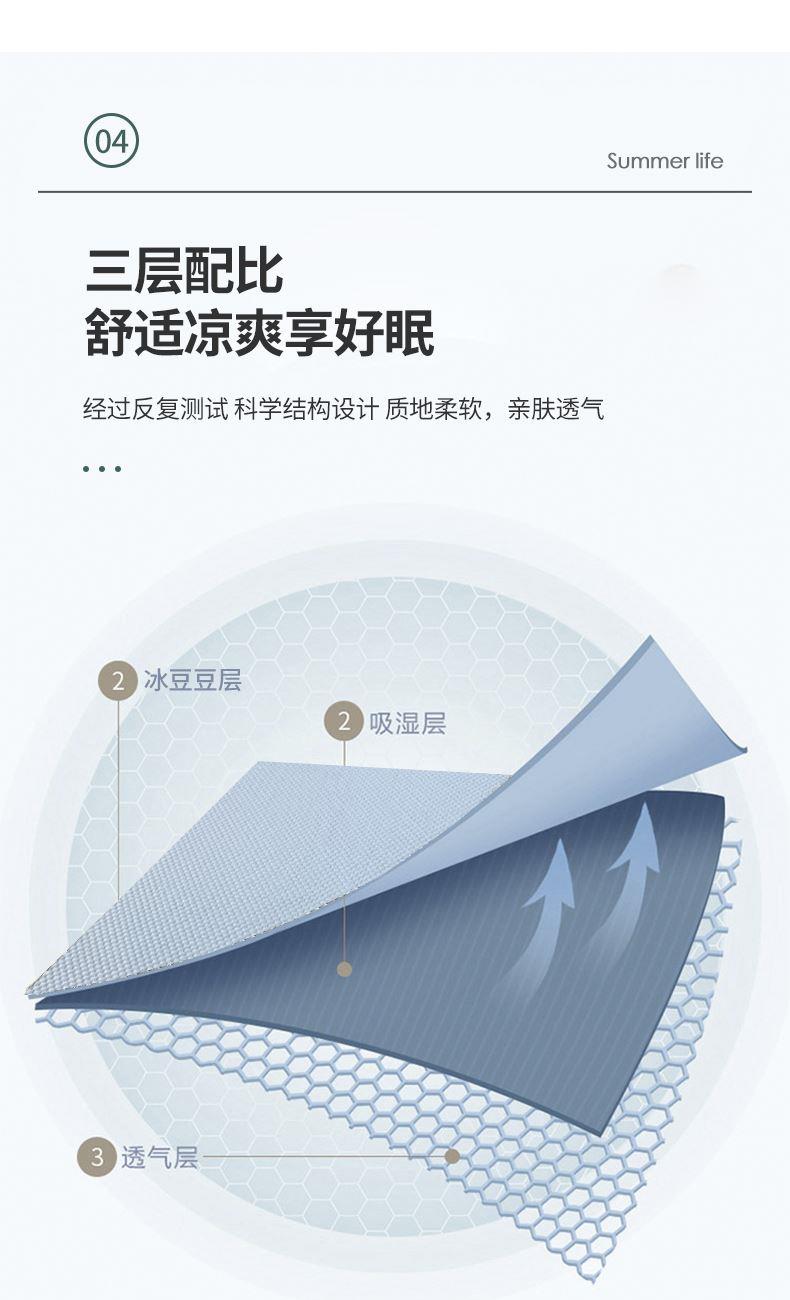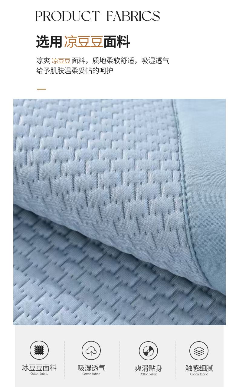 规格:180*200cm 枕套:48*74cm*2 面料:凉豆豆 复合料:华夫格 执行标准:Q/TXY01-2016 安全类别:GB18401-2010 B类 1.凉感豆按摩颗粒,微微凸起,QQ弹,让身体和席面预留更多,自由呼吸的空间 并且软到措手不及。黑科技凉感丝降温纤维、清凉透气,体感降温,杜绝出汗,无惧机洗,高密织,水洗不易变形