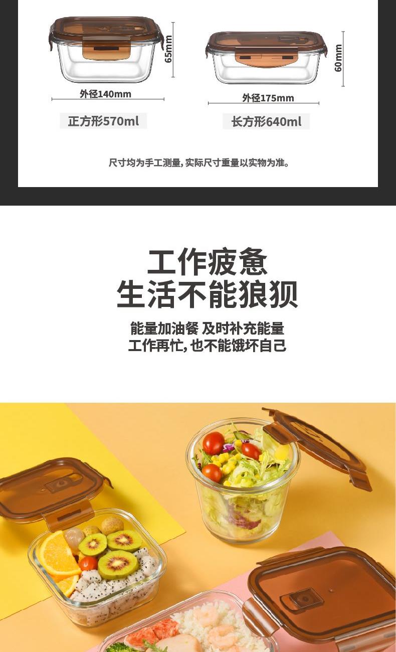 保鲜盒规格:170ml-12.5*8.8*4.8cm、400ml-13*13*6cm、570ml-14*14*6.5cm、640ml-17.5*13*6cm