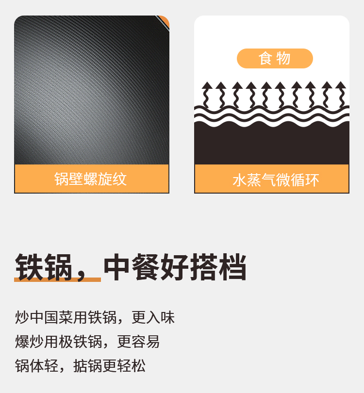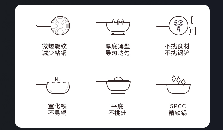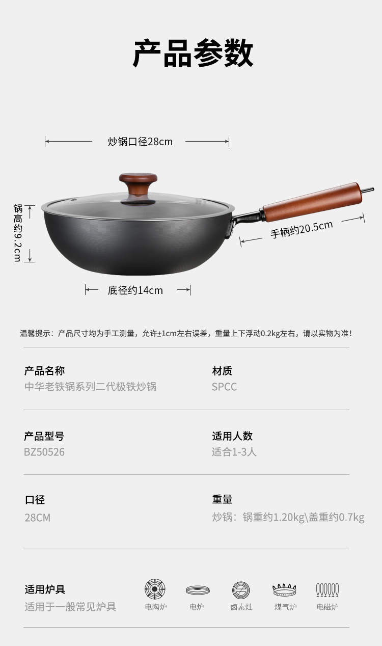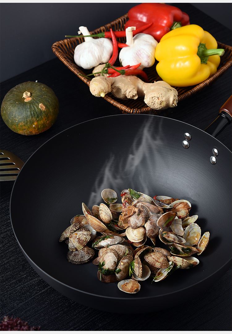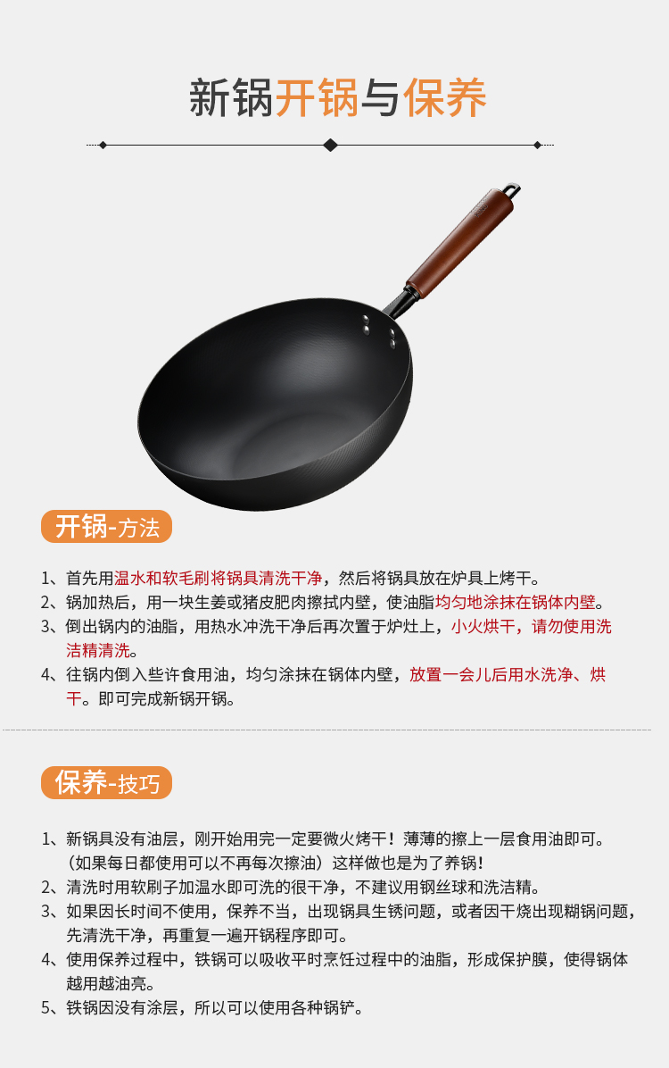 规格:口径28cm、材质:极铁 1,高纯精铁匠心铸造 氮化技术不易生锈好保养 2.锅底加厚储热性更好,锅壁薄传热快,快速升温,更适合爆炒。 3.氮化防锈处理,锅体耐磨,不易生锈洗锅也不用再小心翼翼 4.铁锅使用后,及时清洗干净,并用小火把锅身烘干,不要有水,这样可有效避免锅体生锈,延长铁锅使用寿命.