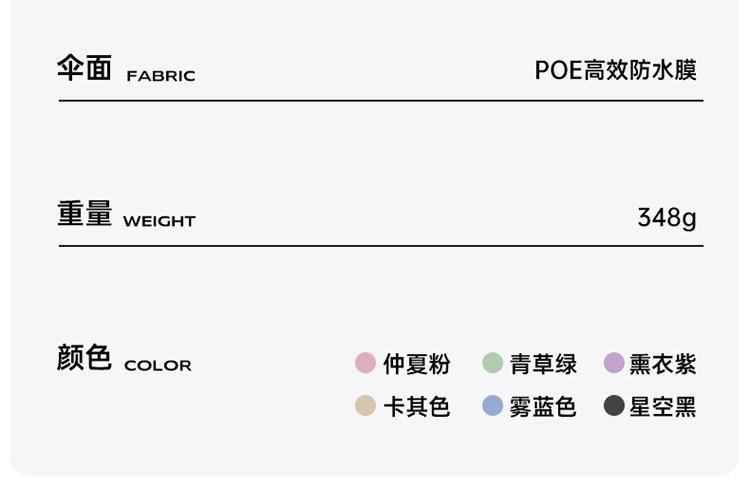 规格:21寸8骨 伞架:合金纤维骨架 面料:POE 手柄:塑胶手柄 包装:OPP 颜色:仲夏粉,青草绿,熏衣紫,卡其色,天蓝色,星空黑 数量:100支起