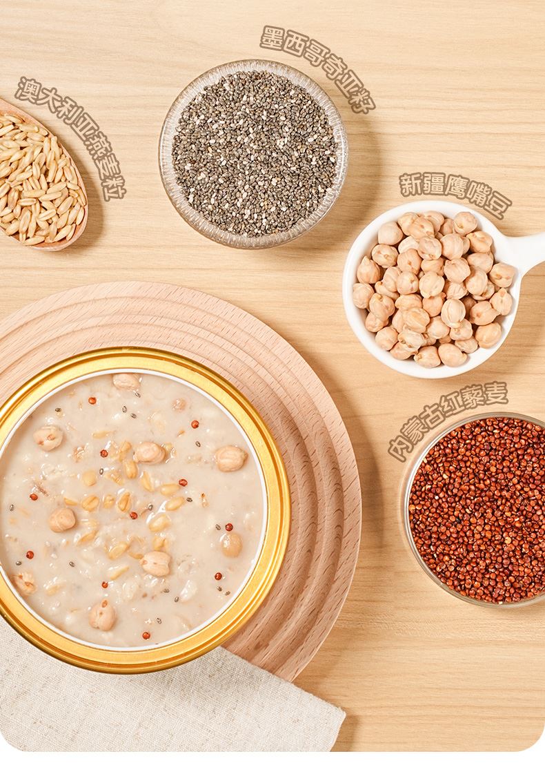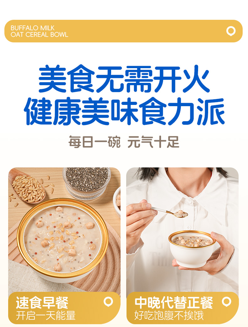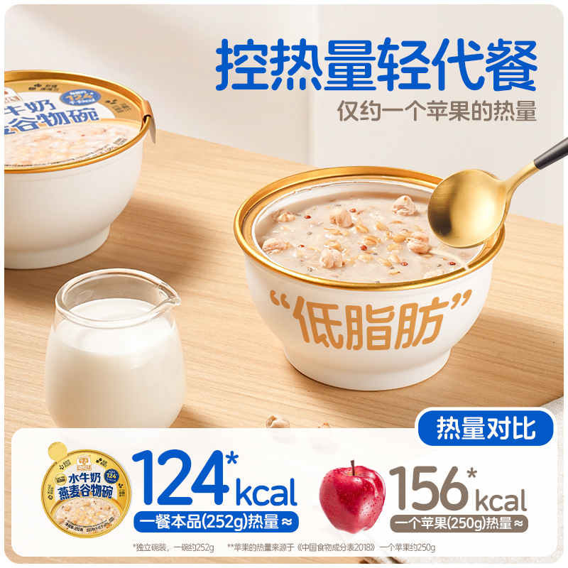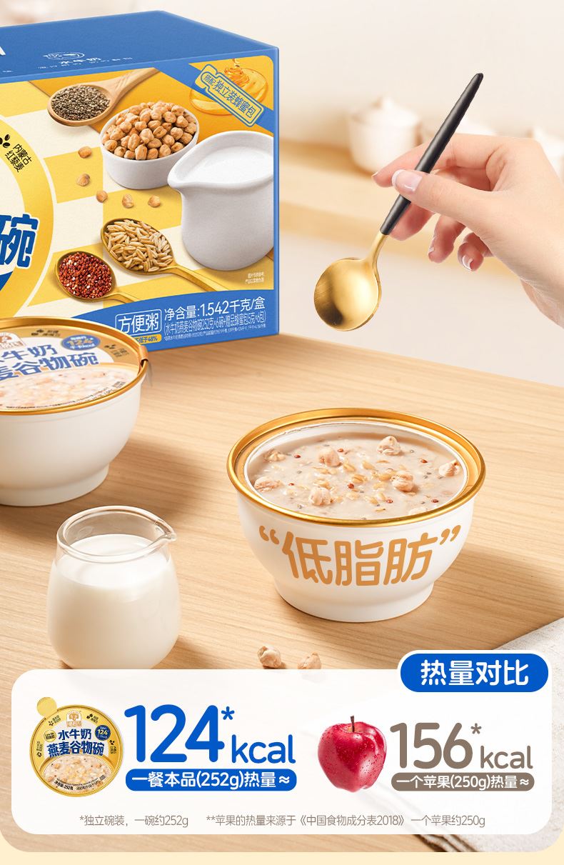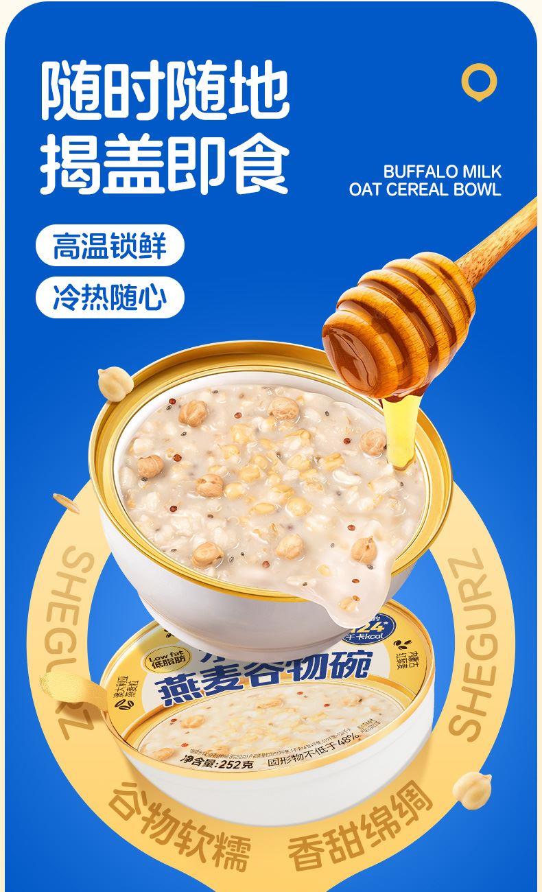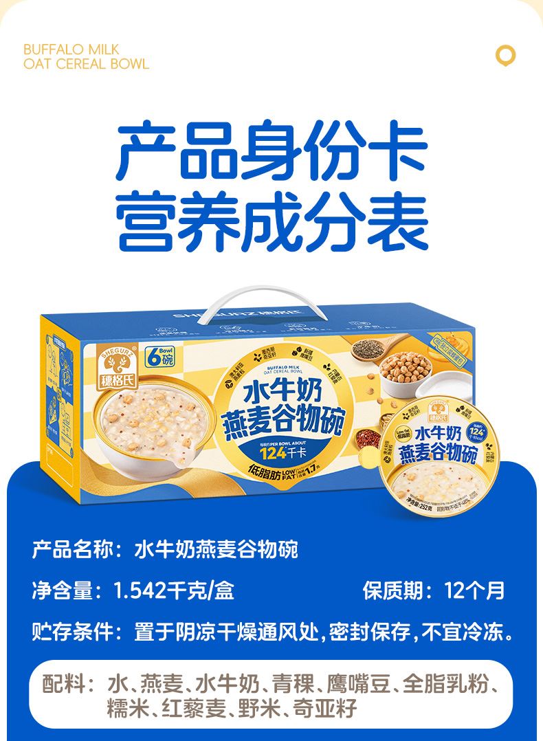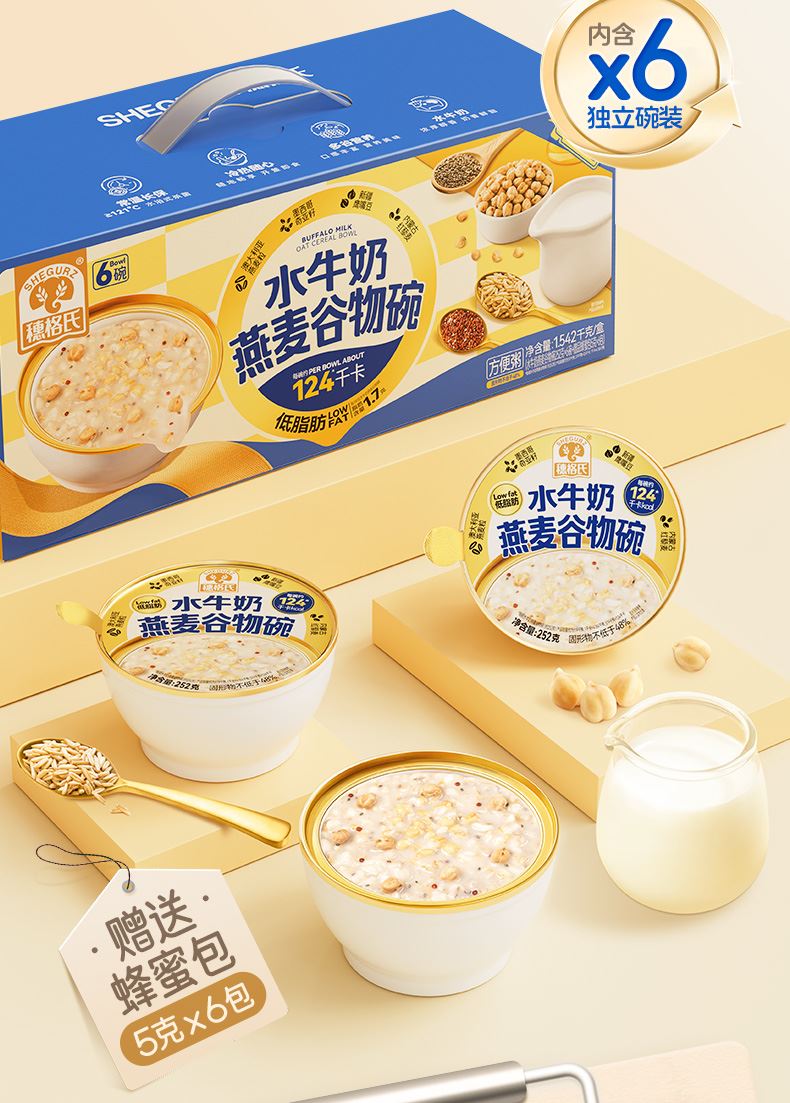 穗格氏水牛奶燕麦谷物碗1542g(252克*6碗,赠品蜂蜜包5克*6) 配料表:水、燕麦、水牛奶、青稞、鹰嘴豆、全脂乳粉、糯米、红藜麦、野米、奇亚籽。 卖点: 1,“乳中珍品”水牛奶,营养全面,不但乳脂肪和乳蛋白含量高,奶质佳,还富含锌、铁等矿物元素。 2,控热量 轻代餐,一餐本品(252g)热量≈124kcal; 3,多样谷物均衡每日膳食,9种甄选食材; 4,先进工艺高温炖煮,常温长保; 5,揭盖即食,高温锁鲜,冷热随心。