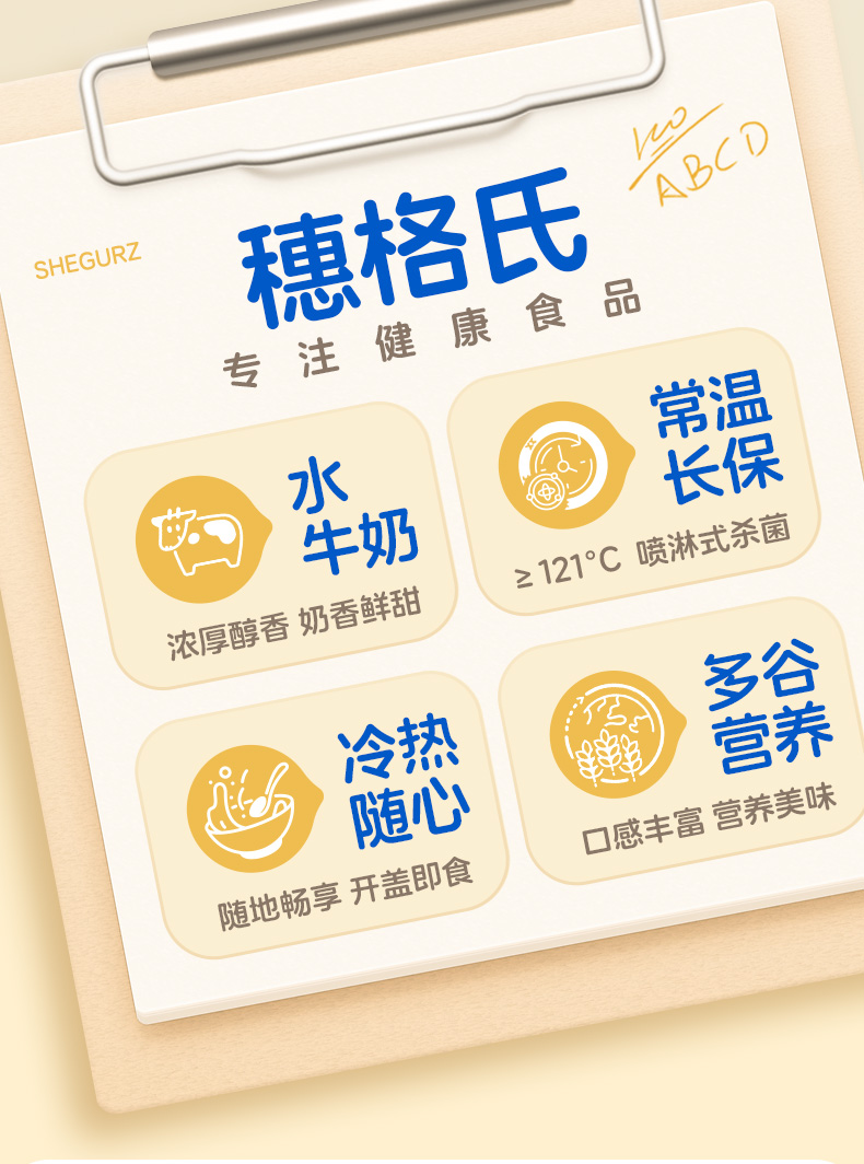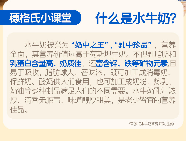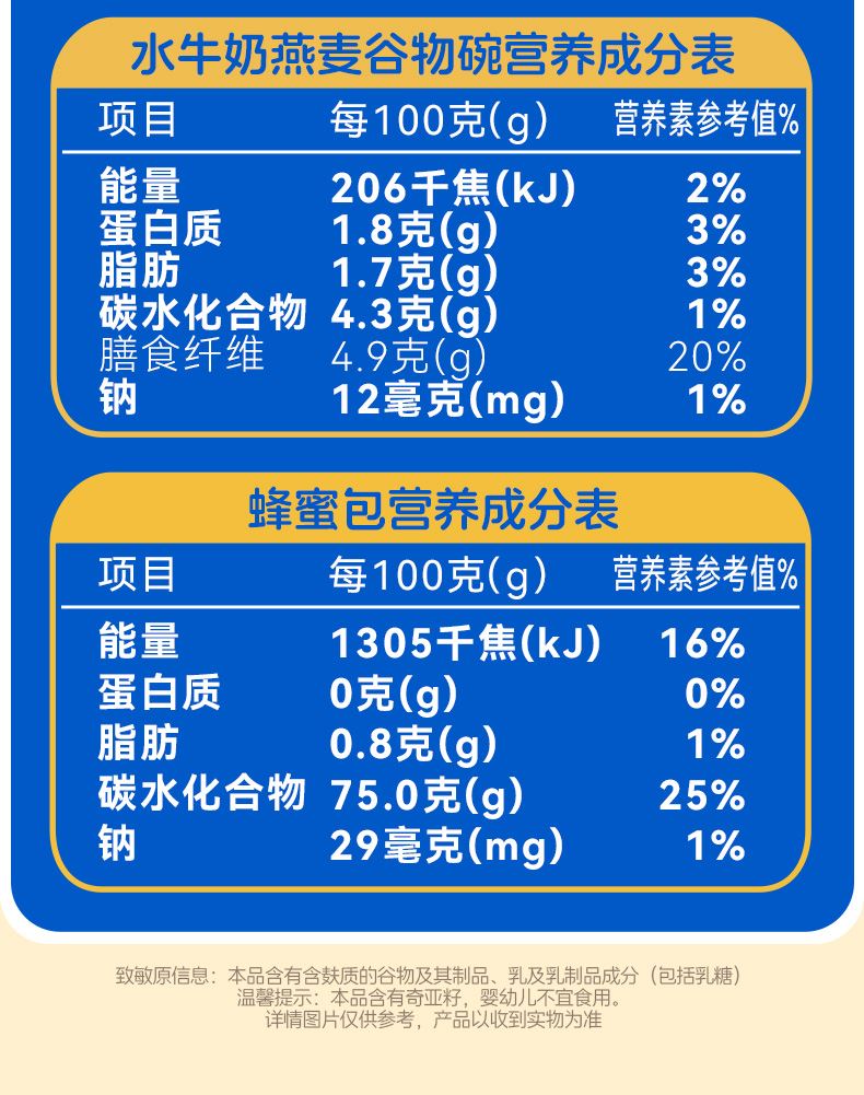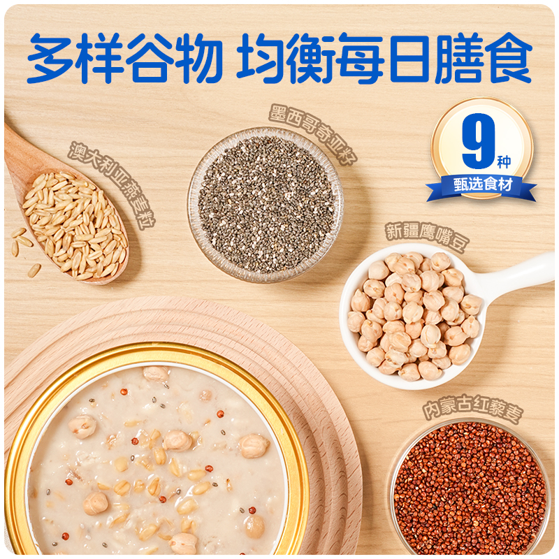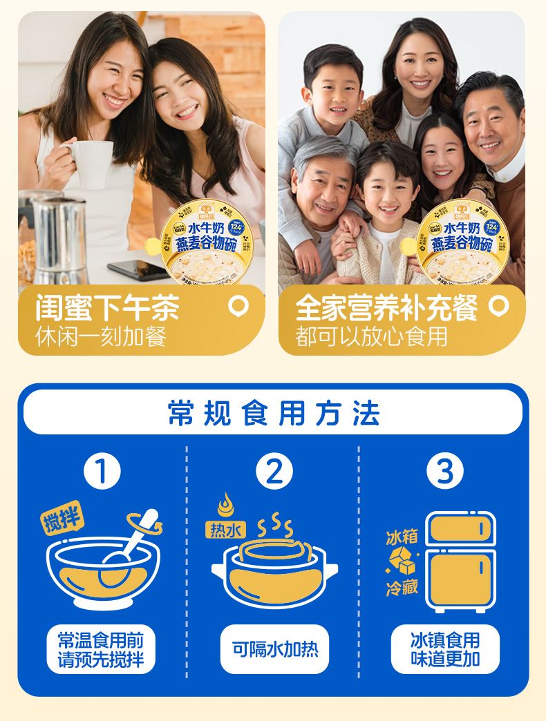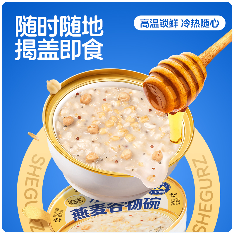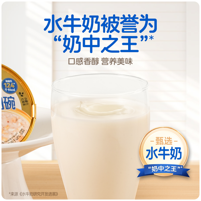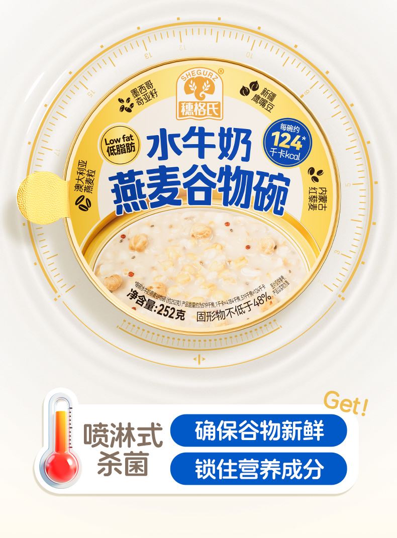 穗格氏水牛奶燕麦谷物碗1542g(252克*6碗,赠品蜂蜜包5克*6) 配料表:水、燕麦、水牛奶、青稞、鹰嘴豆、全脂乳粉、糯米、红藜麦、野米、奇亚籽。 卖点: 1,“乳中珍品”水牛奶,营养全面,不但乳脂肪和乳蛋白含量高,奶质佳,还富含锌、铁等矿物元素。 2,控热量 轻代餐,一餐本品(252g)热量≈124kcal; 3,多样谷物均衡每日膳食,9种甄选食材; 4,先进工艺高温炖煮,常温长保; 5,揭盖即食,高温锁鲜,冷热随心。