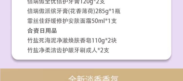 爱润丝婷香氛洗发水(春日序曲)600ml*1瓶 爱润丝婷香氛护发素(春日序曲)600ml*1瓶 安宝笛蓓缦水漾护理海盐磨砂沐浴露(静谧黑玫瑰香)600g*1瓶 安宝笛甜蜜爱恋丝绒香水身体乳400ml*1瓶 安宝笛自然薰衣草香舒柔护手霜75ml*1支 安宝笛大米米糠磨砂泡沫洁面膏150ml*1支 倍瑞傲全优倍护牙膏120g*2支 倍瑞傲派缤牙膏(花香薄荷)285g*1瓶 霏丝佳舒缓修护安肤面霜50ml*1支 竹盐死海泥净澈焕肤香皂110g*2块 竹盐净柔洁齿护龈牙刷成人*2支