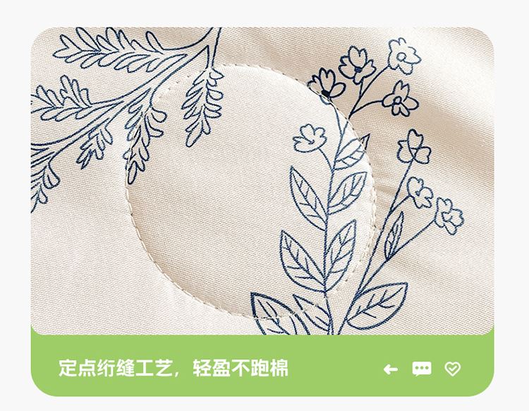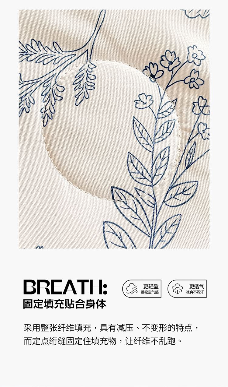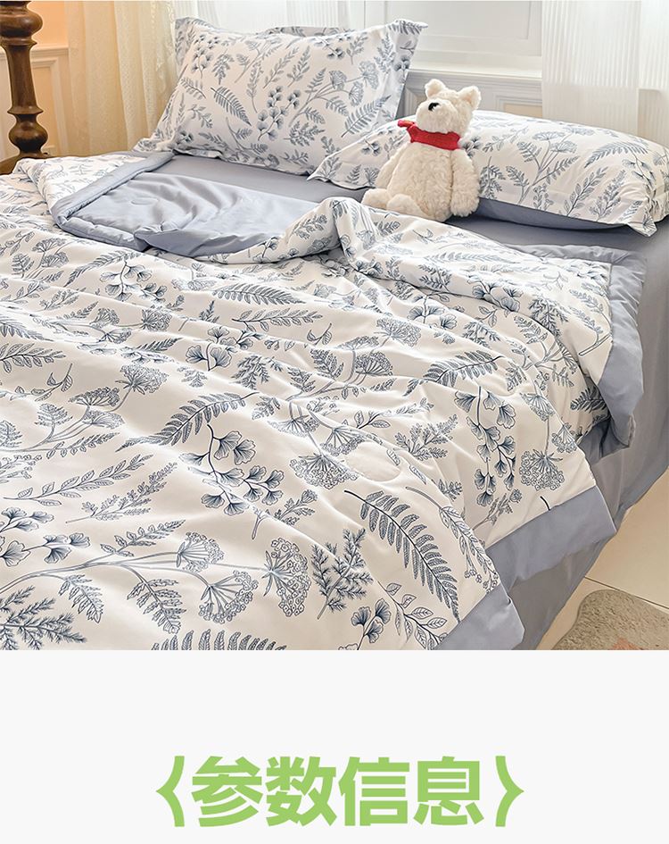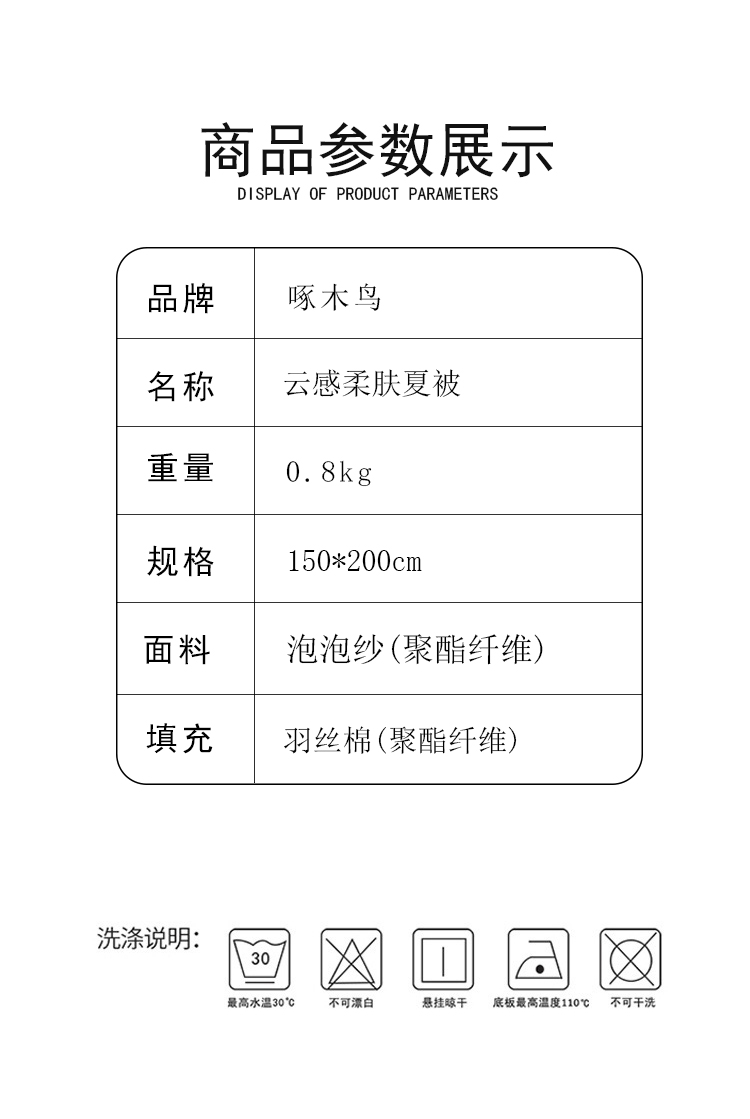 规格:150*200cm 面料:泡泡纱(聚酯纤维) 填充:羽丝棉(聚酯纤维) 重量:0.8kg 卖点: 1、云感柔软,贴身超亲肤,做工扎实,耐用好打理 2、透气不闷汗,夏天好眠,轻薄不压身,空调房必备 3、小清新颜值,卧室更清爽