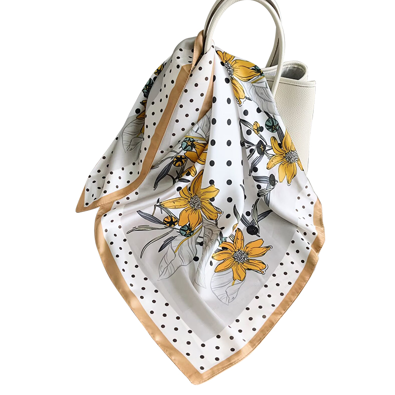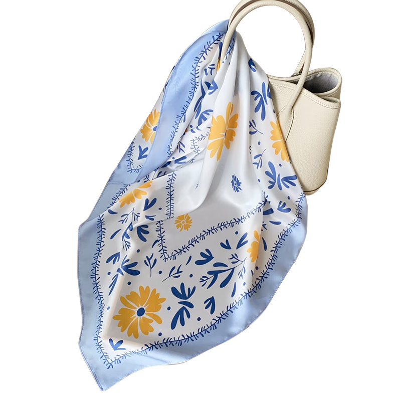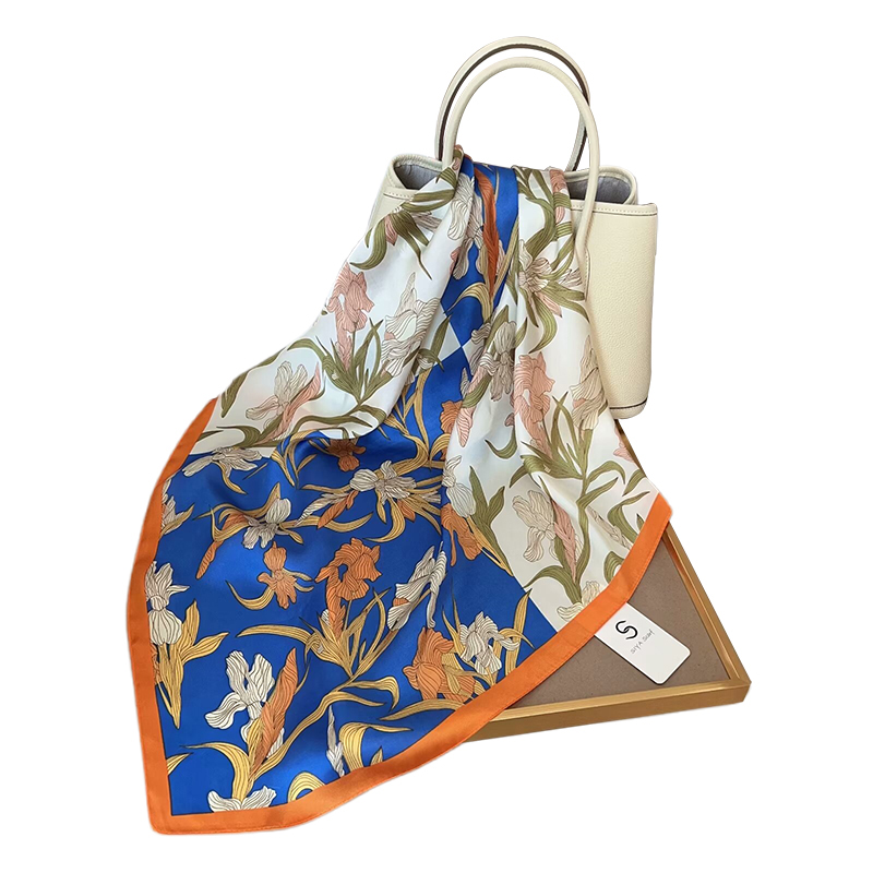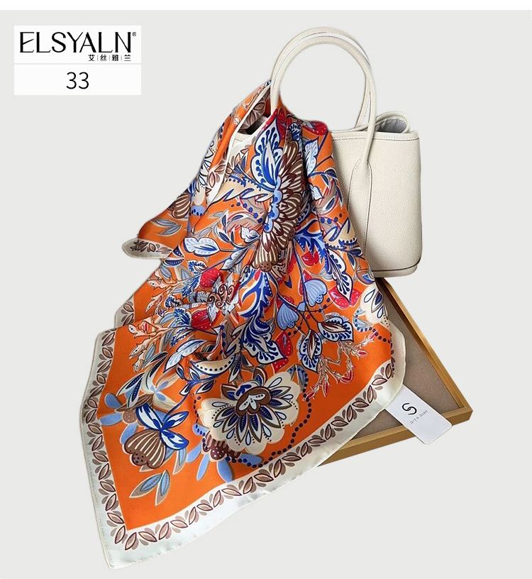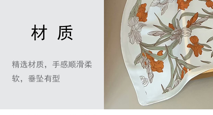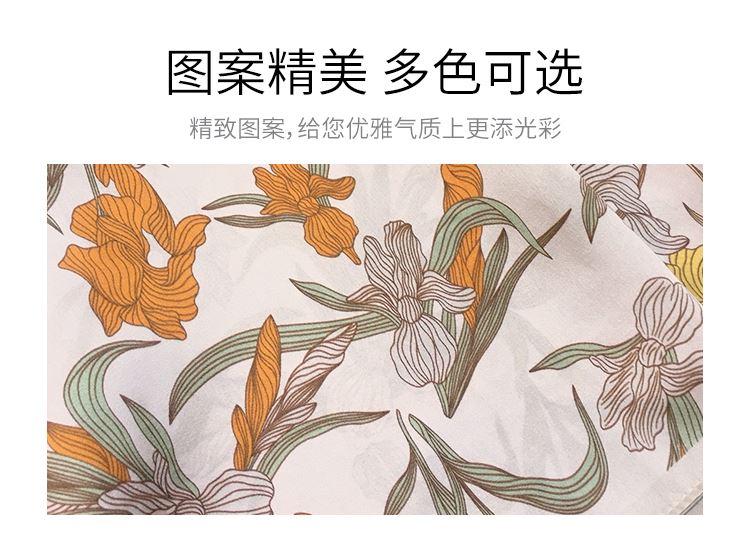 尺寸:70*70 面料:丝绸 1.时尚配色,优雅气质。 2.精挑细选的面料,舒适亲肤。 3.环保印染、色彩牢固、色泽鲜艳。 4.手感顺滑柔软,垂坠有型。 5.图案精美,多色可选。