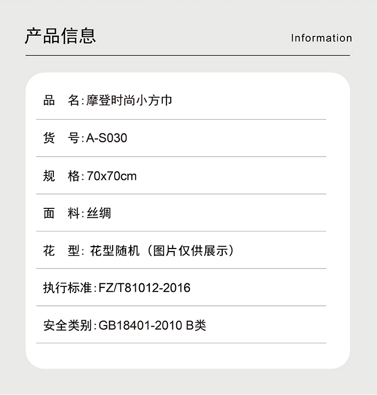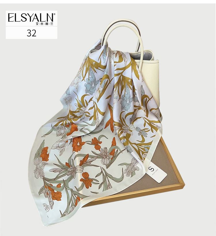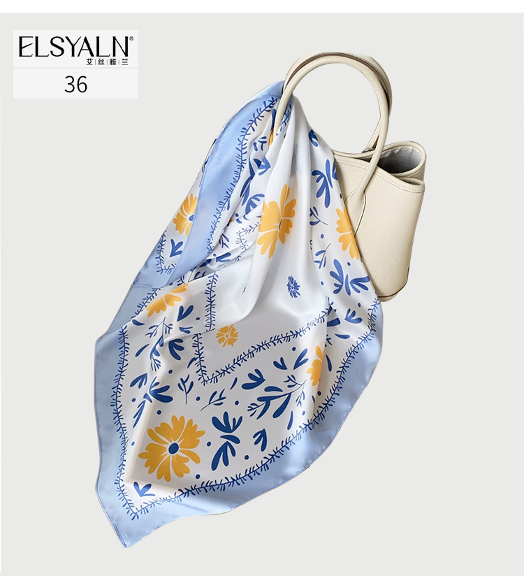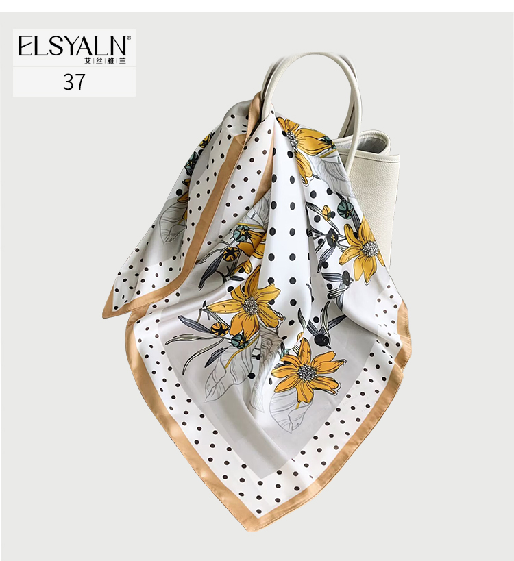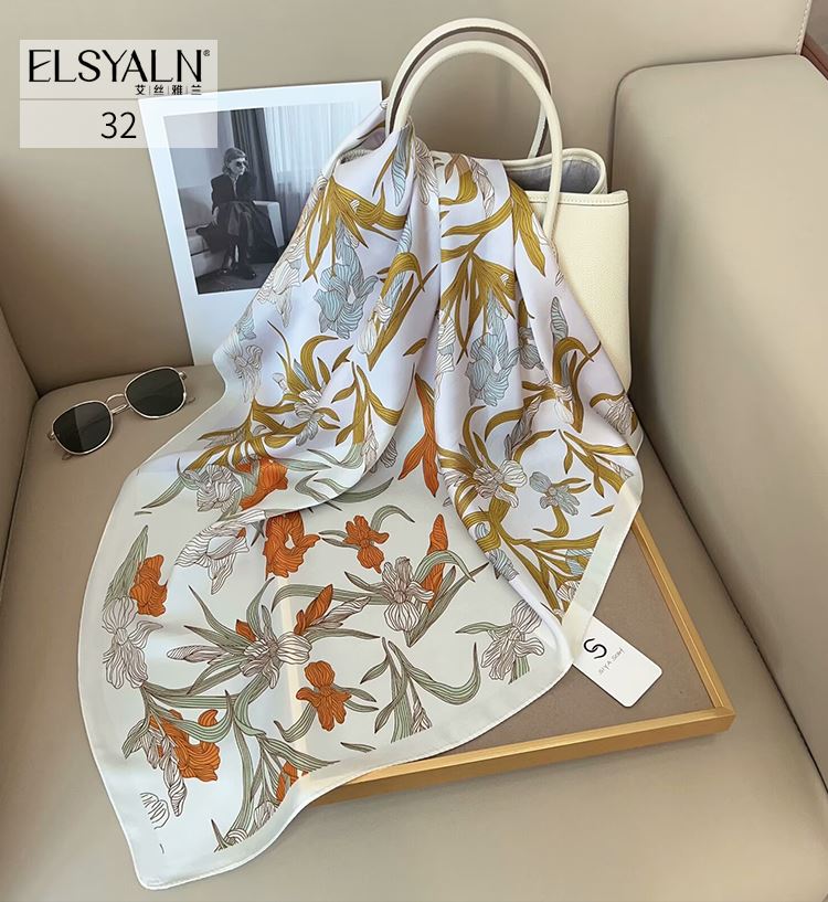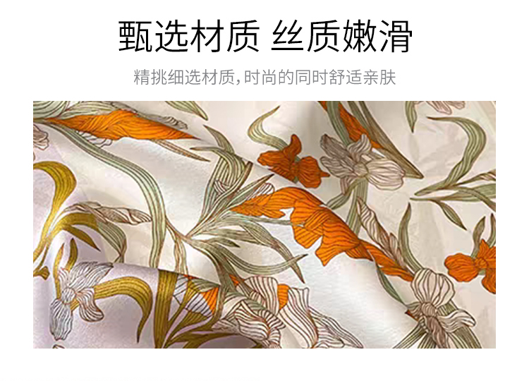 尺寸:70*70 面料:丝绸 1.时尚配色,优雅气质。 2.精挑细选的面料,舒适亲肤。 3.环保印染、色彩牢固、色泽鲜艳。 4.手感顺滑柔软,垂坠有型。 5.图案精美,多色可选。