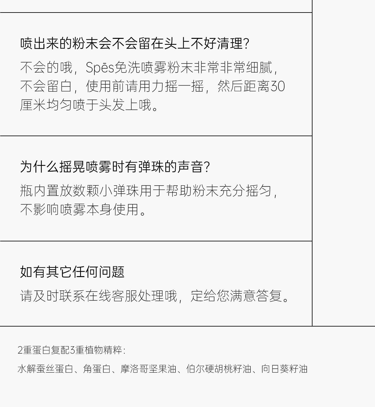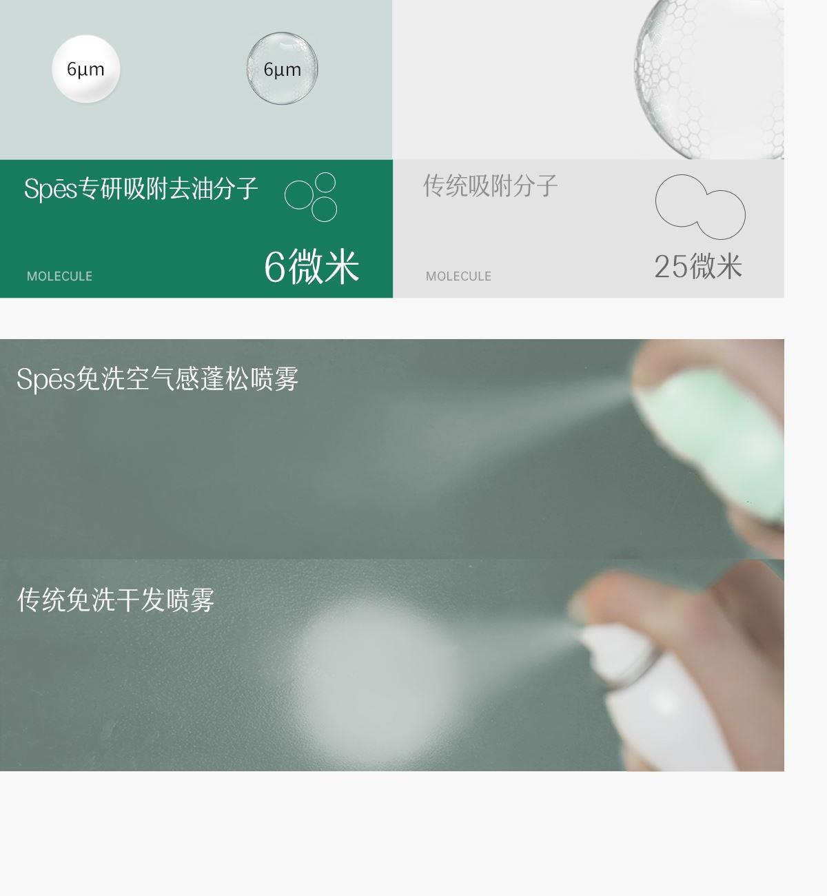 Spēs免洗空气感蓬松喷雾(清甜柚香)150ml 产品材质和设计: 专研6微米,不易留白屑 阀门设计,人体工程学设计阀门45 去油分子:Spēs专研吸附去油分子6μm(微米) 核心功效: 蓬起发根,柔顺发丝 产品卖点: 一喷去油 蓬松不留白,一秒秒变高颅顶。 视觉上更显脸小,干如无痕