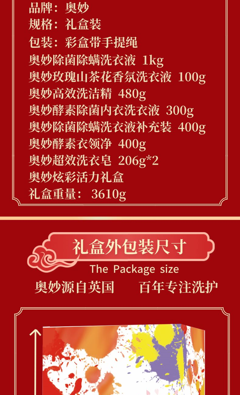 产品配置: 奥妙除螨洗衣液1kg 奥妙玫瑰山茶花香氛洗衣液100g 奥妙高效洗洁精480g 奥妙酵素内衣洗衣液300g 奥妙除螨洗衣液补充装400g 奥妙酵素衣领净400g 奥妙超效洗衣皂206g*2 奥妙炫彩活力礼盒 礼盒重量: 3610g 礼盒尺寸:26*15*28cm