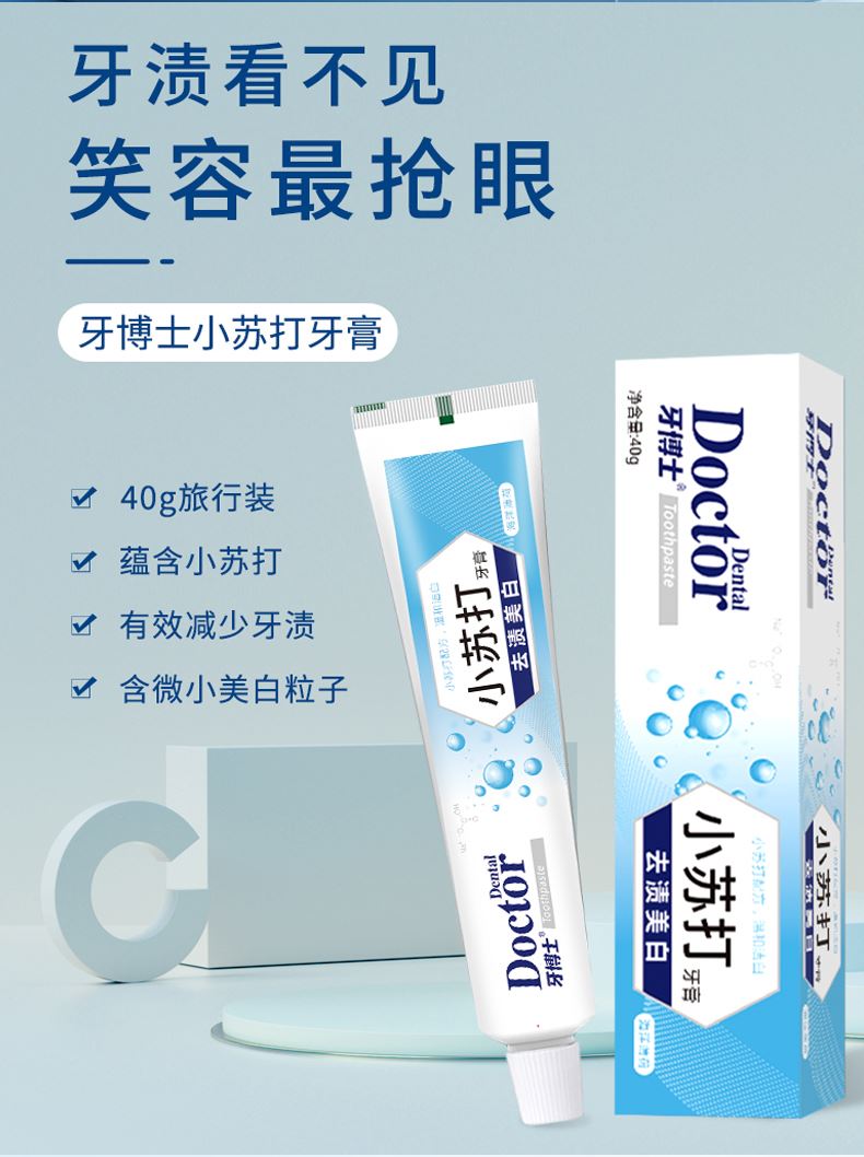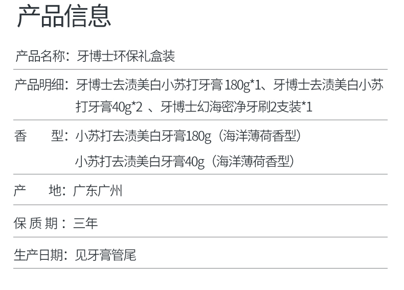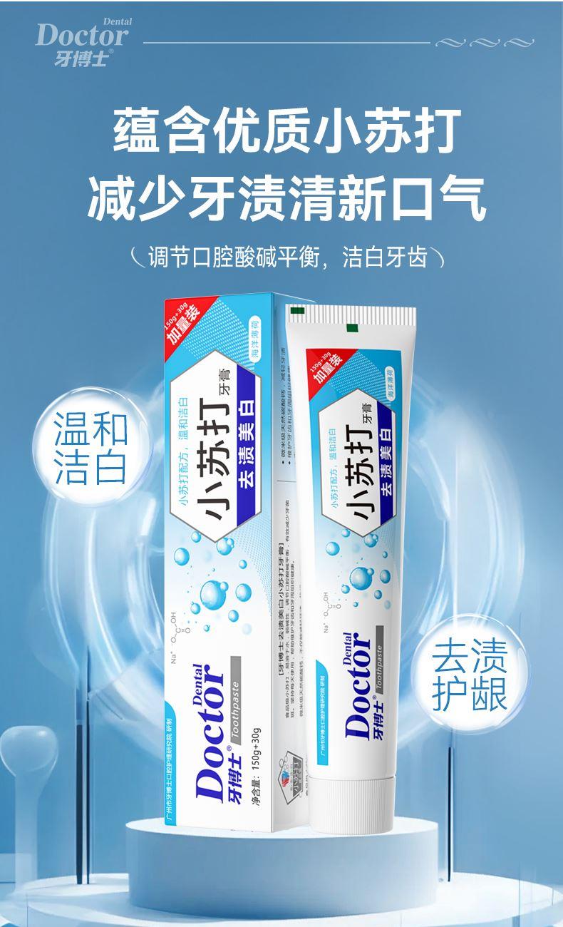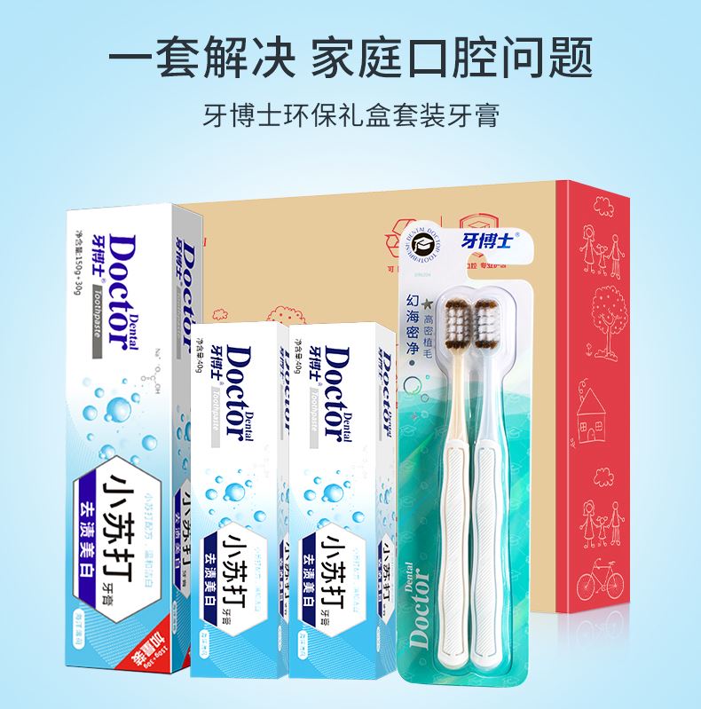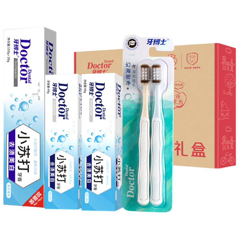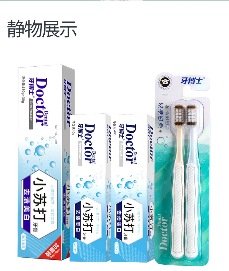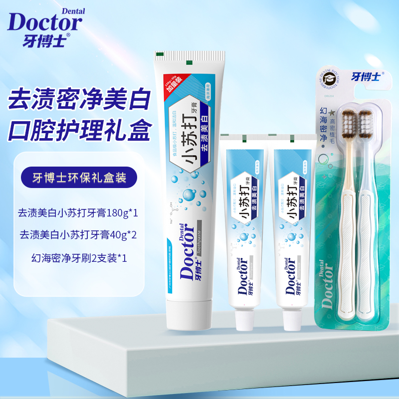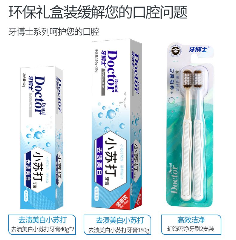 产品参数: 牙博士去渍美白小苏打牙膏150+30g*1 牙博士去渍美白小苏打牙膏40g*2 牙博士DR6204幻海密净牙刷两支装 礼盒