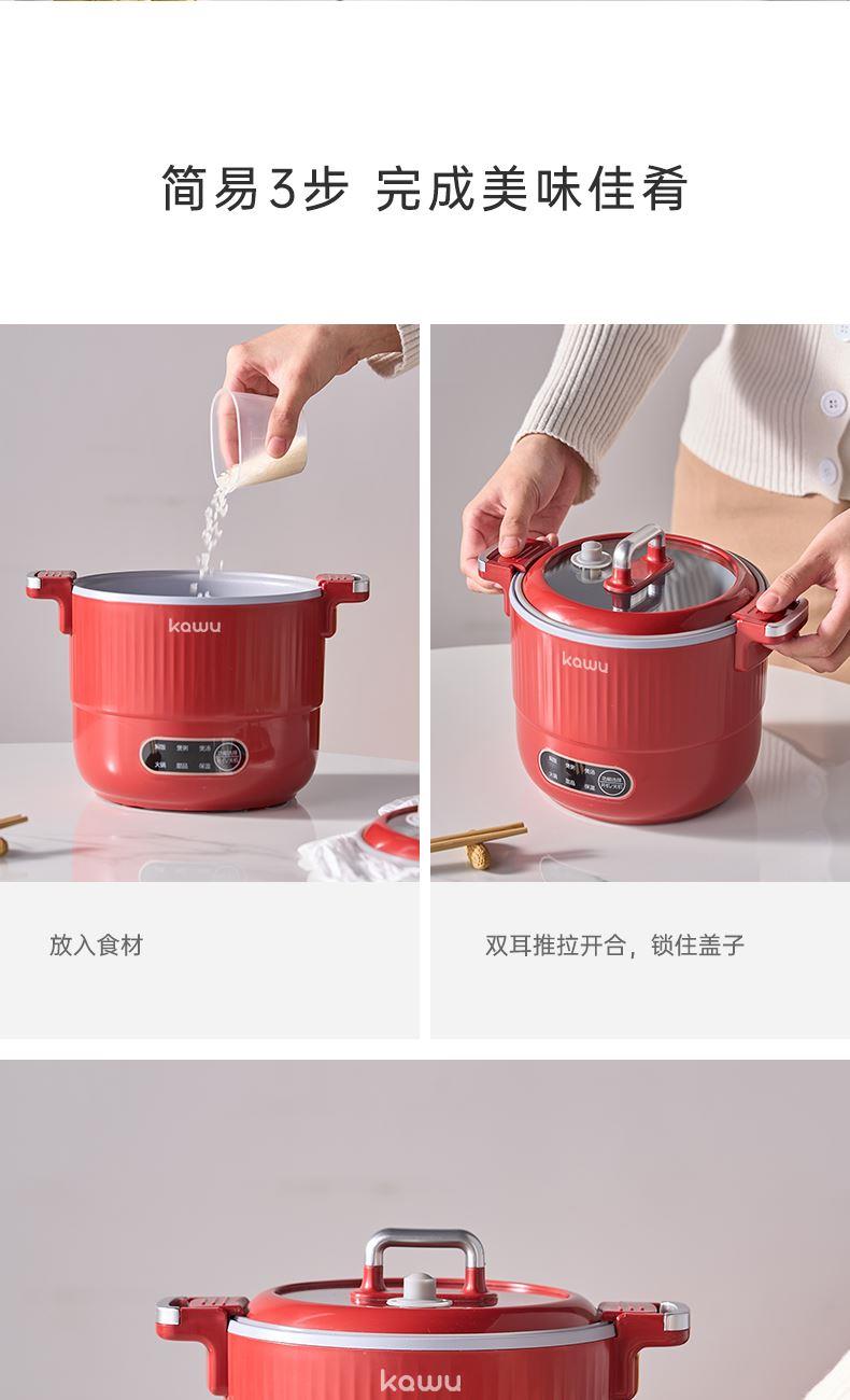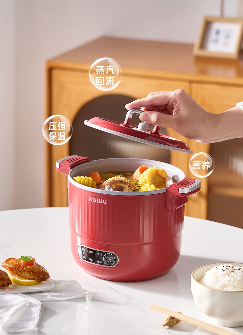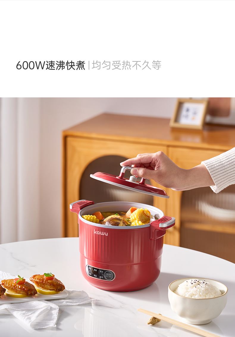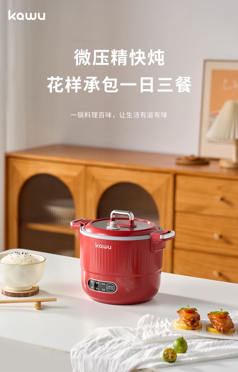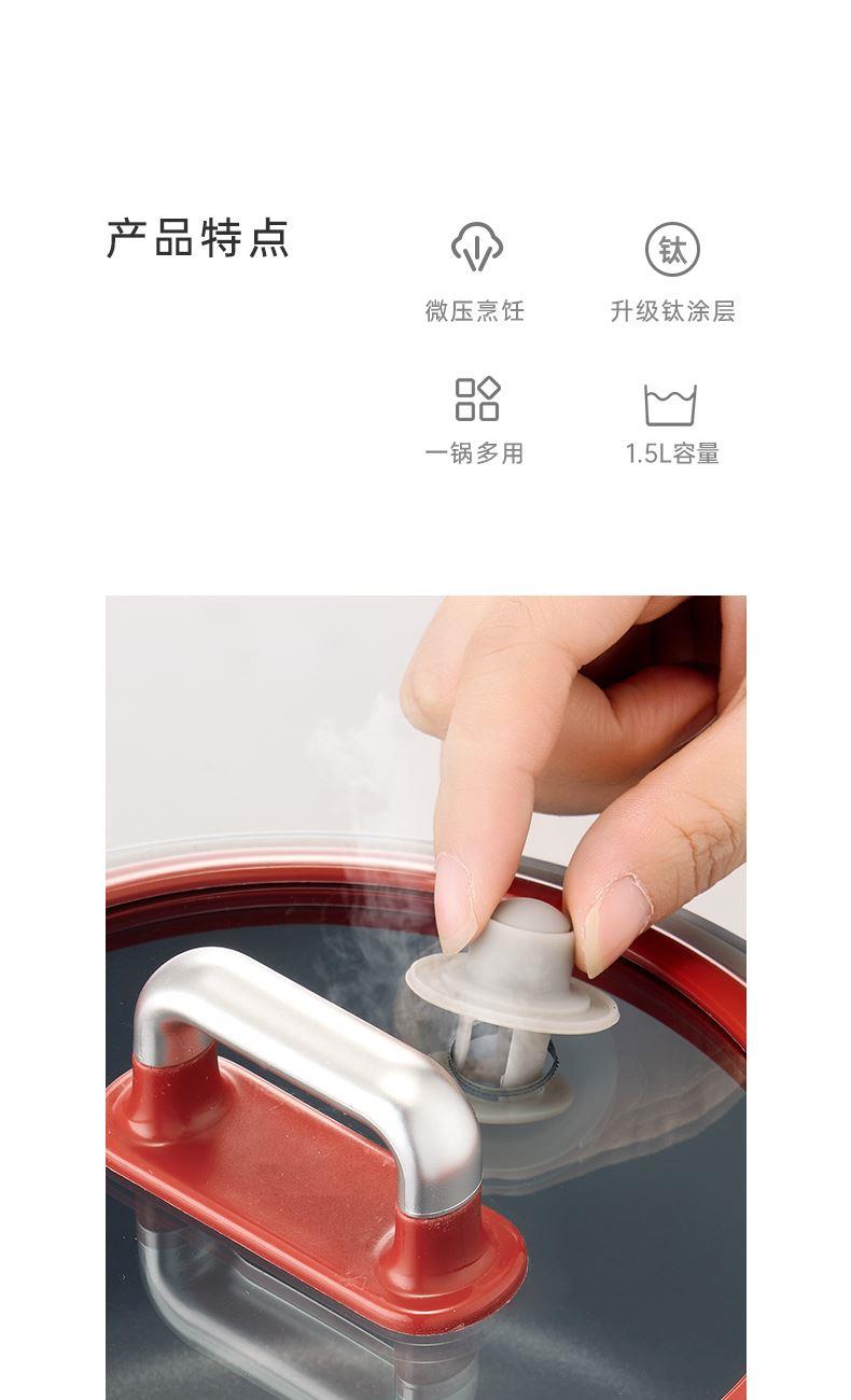 产品型号:RC-D615A 额定电压:220V 额定功率:600W 额定容量:1.5L 单台净重:1KG 单台毛重:1.2KG 包 装:邮购箱 商品条码:6977256045038 产品尺寸:242*180*185mm 包装尺寸:219**219*183mm 清单:主机,电源线,说明书 1. 采用特殊工艺处理,即使没有传统涂层,也能实现出色的不粘效果。 无论是煎蛋、煎鱼还是炒菜,食物都不易粘锅,清洗方便,节省时间和精力。 2. 微压环境下,水的沸点升高,热量传递更高效,加快食物煮熟速度。 3.钛金属对人体无毒无害,耐腐蚀、抗刮擦,表面自然生成的氧化膜具有抑jun作用。 即使锅具被划伤,氧化膜会自然再生,无需担心涂层脱落影响健康。 4. 微压适用于煎炒、炖煮、焖饭、煮粥等多种烹饪方式。 良好的导热性能确保食物均匀受热,中小火即可达到普通炒锅大火的火候,环保节能。 5. 锅盖采用防爆钢化材质,透明玻璃设计便于观察食材变化
