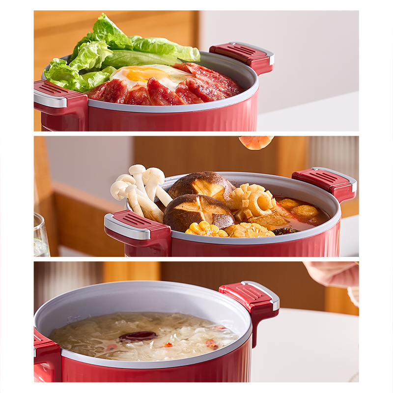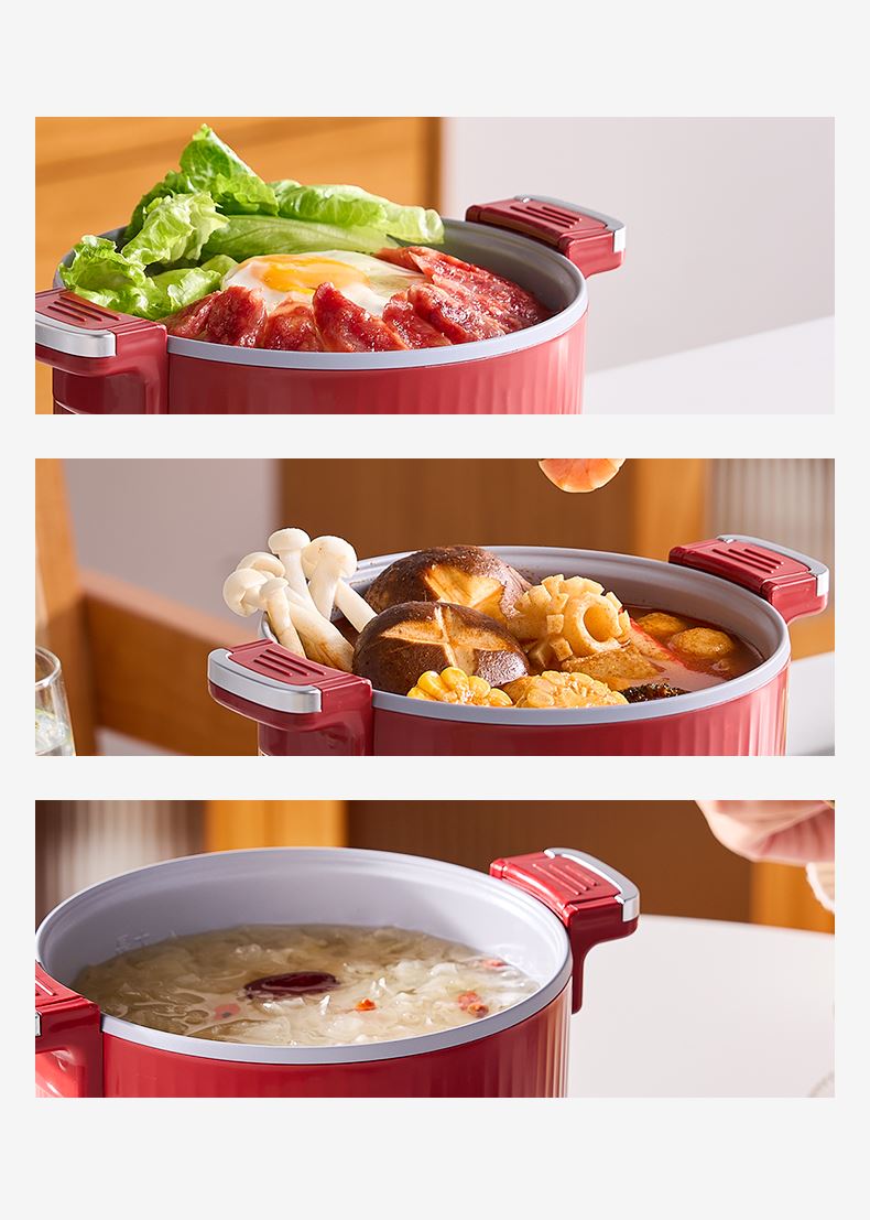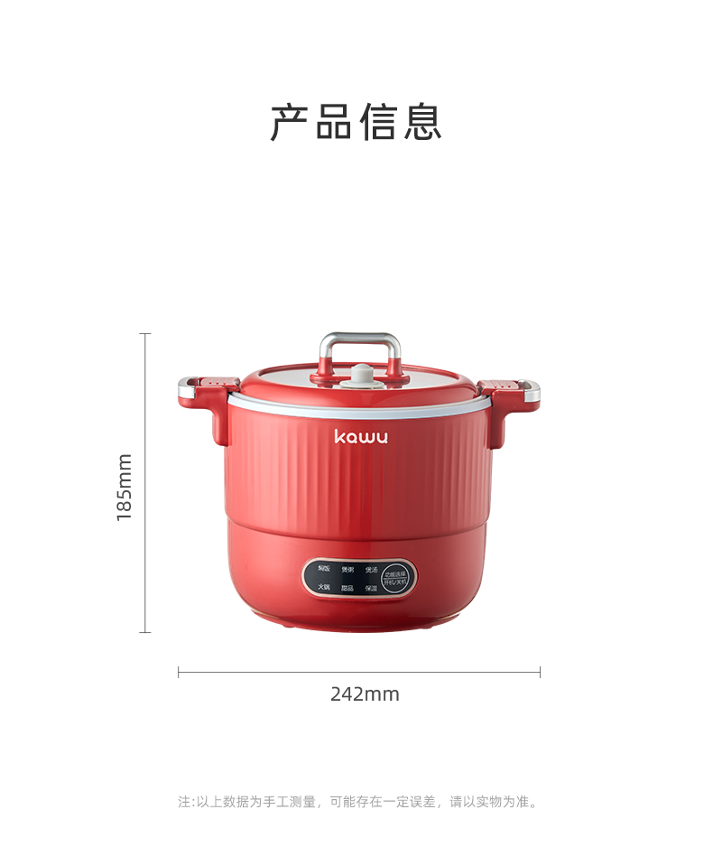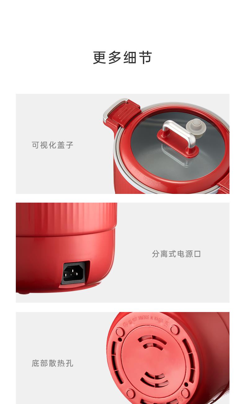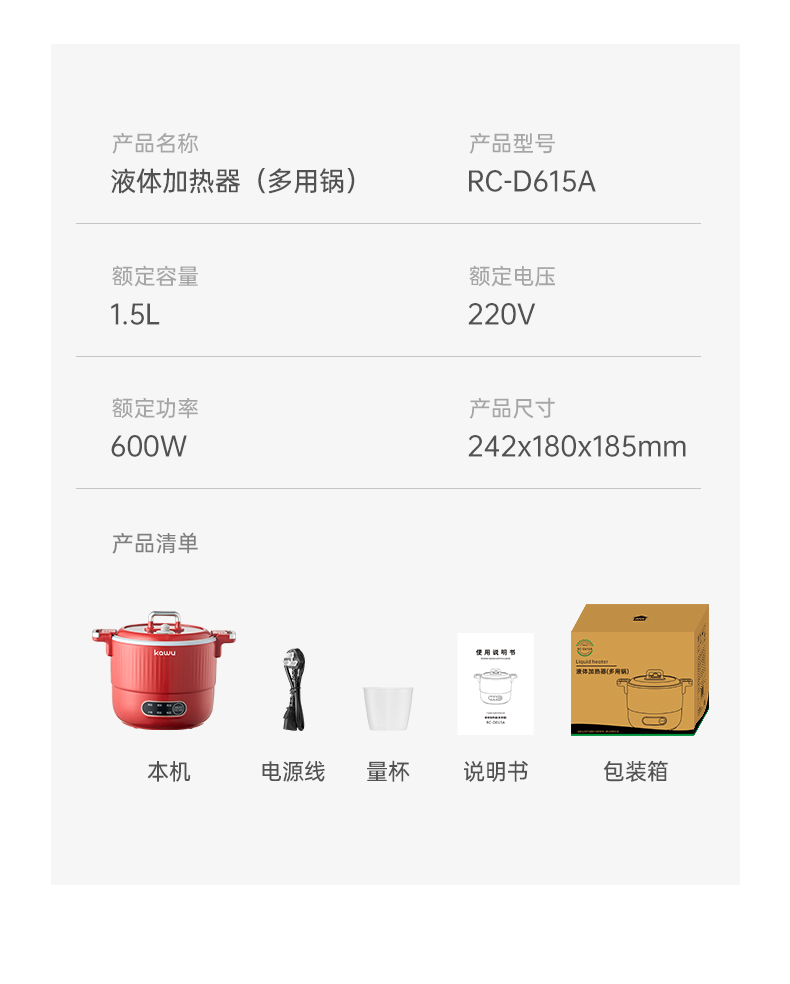 产品型号:RC-D615A 额定电压:220V 额定功率:600W 额定容量:1.5L 单台净重:1KG 单台毛重:1.2KG 包 装:邮购箱 商品条码:6977256045038 产品尺寸:242*180*185mm 包装尺寸:219**219*183mm 清单:主机,电源线,说明书 1. 采用特殊工艺处理,即使没有传统涂层,也能实现出色的不粘效果。 无论是煎蛋、煎鱼还是炒菜,食物都不易粘锅,清洗方便,节省时间和精力。 2. 微压环境下,水的沸点升高,热量传递更高效,加快食物煮熟速度。 3.钛金属对人体无毒无害,耐腐蚀、抗刮擦,表面自然生成的氧化膜具有抑jun作用。 即使锅具被划伤,氧化膜会自然再生,无需担心涂层脱落影响健康。 4. 微压适用于煎炒、炖煮、焖饭、煮粥等多种烹饪方式。 良好的导热性能确保食物均匀受热,中小火即可达到普通炒锅大火的火候,环保节能。 5. 锅盖采用防爆钢化材质,透明玻璃设计便于观察食材变化