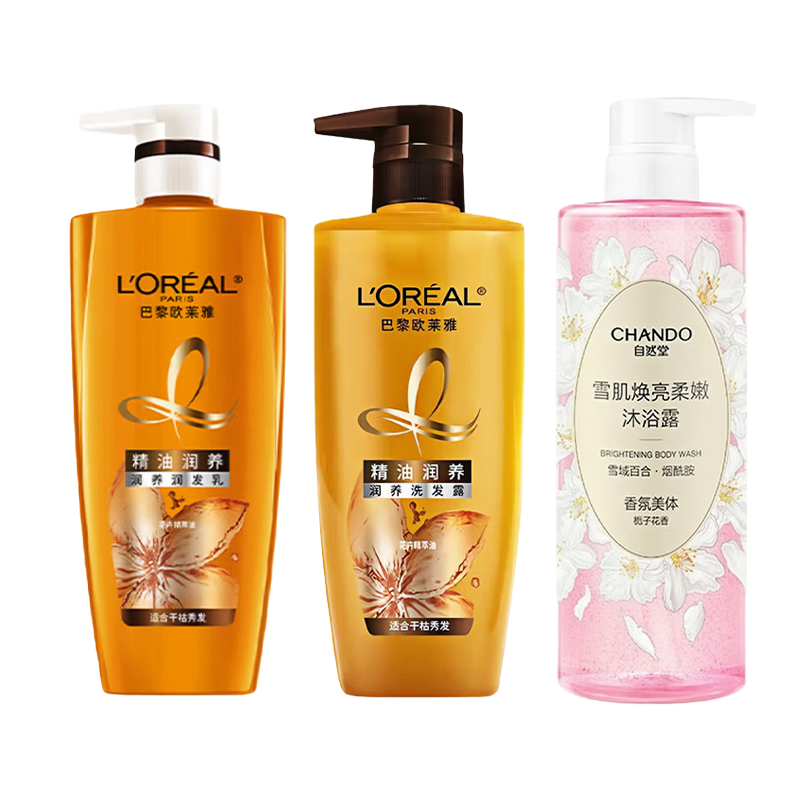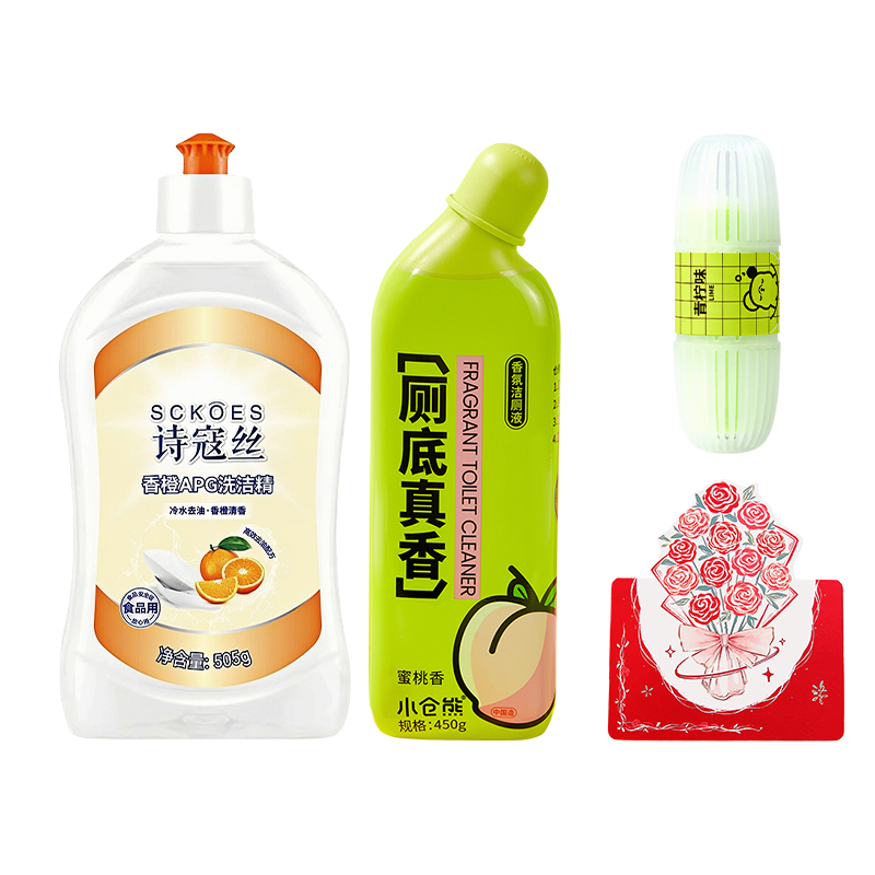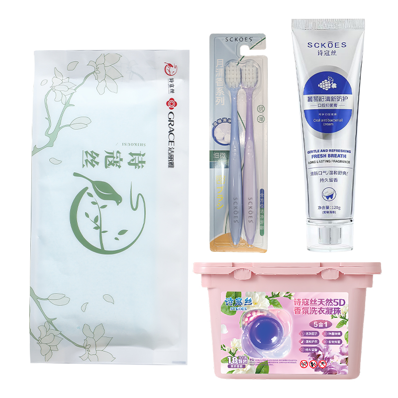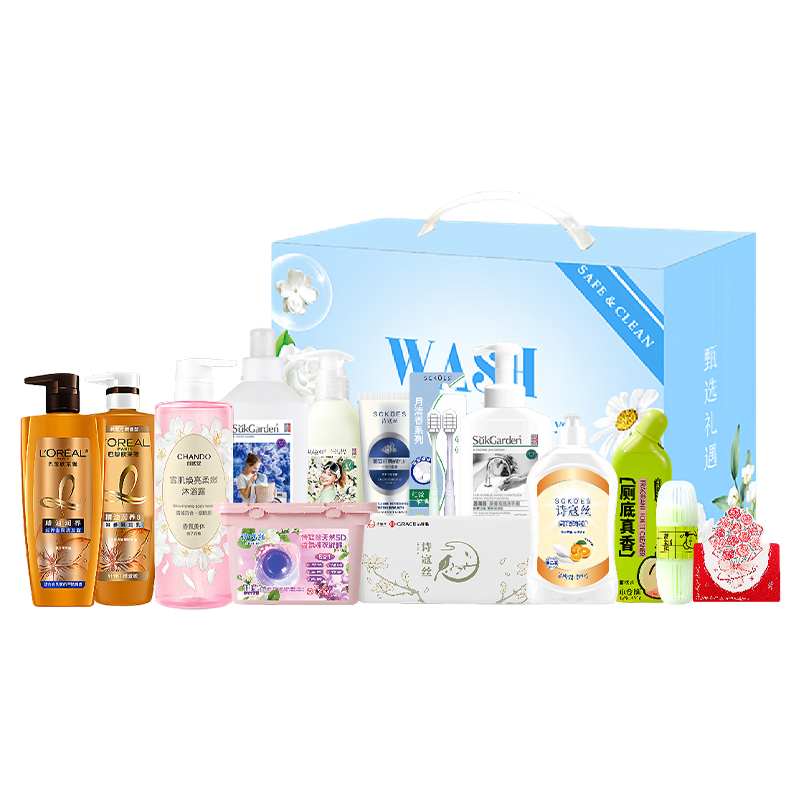 1. 欧莱雅精油润养丰盈洗发水700ml 2. 欧莱雅精油润养顺滑护发素700ml 3. 自然堂焕亮雪肌沐浴露600ml 4. 洁丽雅&诗寇丝臻品长绒棉毛巾(颜色随机)70g 5. Sckoes诗寇丝细毛牙刷双支装 6. Sckoes诗寇丝葡萄籽清新防护牙膏120g 7. Sckoes诗寇丝天然5D香氛洗衣凝珠18颗 8. Sckoes诗寇丝APG超浓缩洗洁精505g 9. SukGarden蔬果园蓝风软洗衣液1kg 10. 蔬果园茉莉白山茶香氛内衣洗衣液300g 11. SukGarden蔬果园茶香泡泡洗手液500ml 12. 小仓熊香氛洁厕液(蜜桃香)450g 13. 小仓熊马桶挂篮(单个装)50g 14. 立体玫瑰花贺卡(赠) 15. 精选精美礼盒-LH004