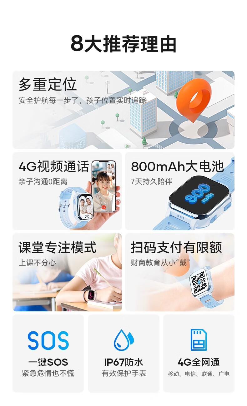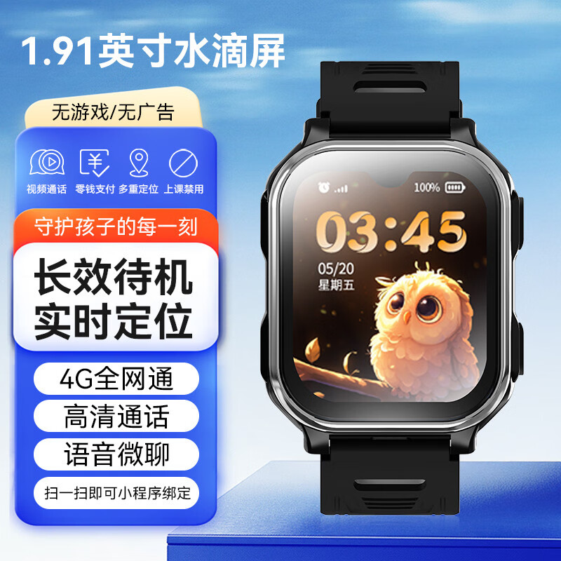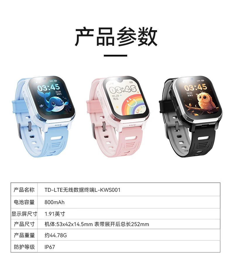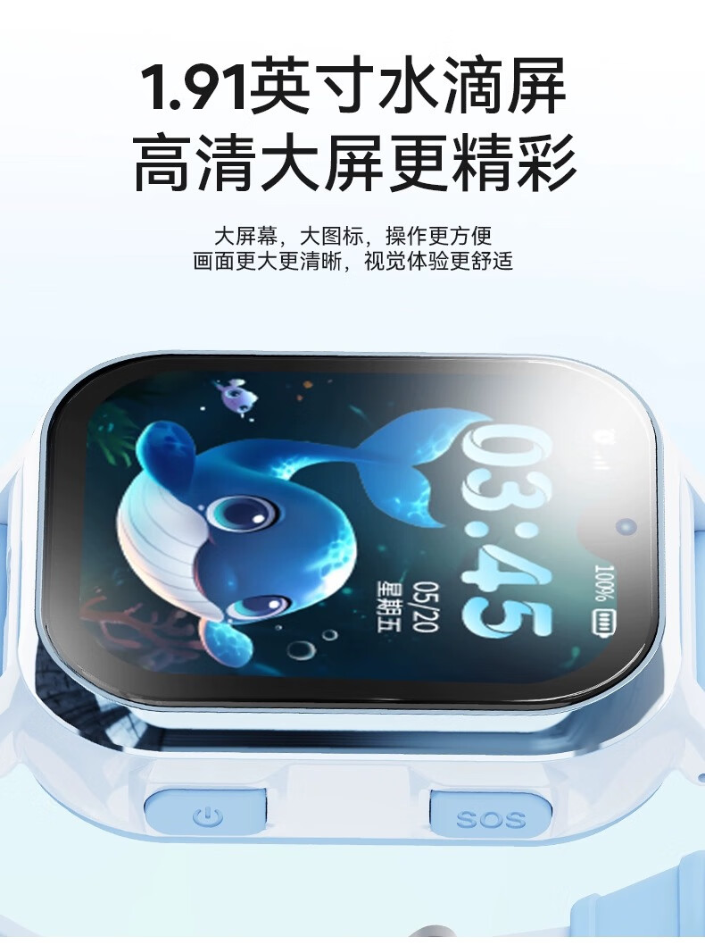 屏幕尺寸:1.91英寸LCD 240*280 使用时间:1-3天 充电方式:磁吸充电 电池容量:800mAh 智能手表尺寸(mm):53*42*14.5mm,表带展开后总长252mm 产品净重:44.78g 裸机 APP:联享守护 防水等级:IP67 像素:前置摄像头8万像素 产品清单:手表+充电线+说明书+包装盒 多重AI定位(支持GPS/北斗/WIFI/GBL等多重定位)上下学守护,实时追踪并掌握孩子的行动轨迹;800mAh大电池,长续航陪伴孩子更久;食品级气橡胶表带,报备使用更安心;1.52英寸高清大屏,屏幕画面更宽阔,色彩更绚丽;一键SOS,紧急危情也不慌;IP67防水,有效保护手表;4G全网通(支持移动、电信、联通、广电);后台禁用功能,价值智能管理,方便又省心;手表微信双向视频通话,拉近亲子距离;碰碰交好友,拓展社交圈;支持支付宝离线支付,孩子出门无需带现金,支付时向商家展示付款二维码即可;