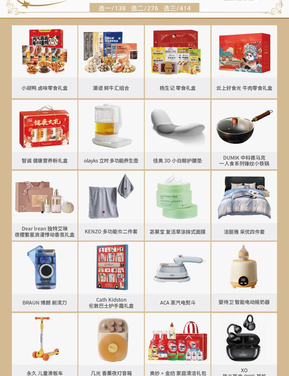 选项1 小胡鸭 活力快充鸭卤味零食礼盒 选项2 潮迹 鲜牛汇组合 选项3 杨生记 零食总动员礼盒 选项4 云上好食光 牛肉零食礼盒 选项5 智诚 健康营养粉礼盒 选项6 olayks立时 多功能养生壶 选项7 佳奥 3D小白鲸护腰垫 选项8 DUMIK中科德马克 一人食系列锤纹小铁锅 选项9 Dear lrean独特艾琳 夜櫻繁星浪漫悸动香氛礼盒 选项10 KENZO 多功能巾二件套 选项11 苾莱宝 复活草涂抹式面膜 选项12 洁丽雅 采优四件套 选项13 BRAUN博朗 剃须刀 选项14 Cath Kidston 伦敦巴士护手霜礼盒 选项15 ACA 蒸汽电熨斗 选项16 婴侍卫 智能电动摇奶器 选项17 儿童滑板车 选项18 几光 香薰夜灯音箱 选项19 奥妙+金纺 家庭清洁礼包 选项20 XO 珠光不分左右耳夹OWS耳机