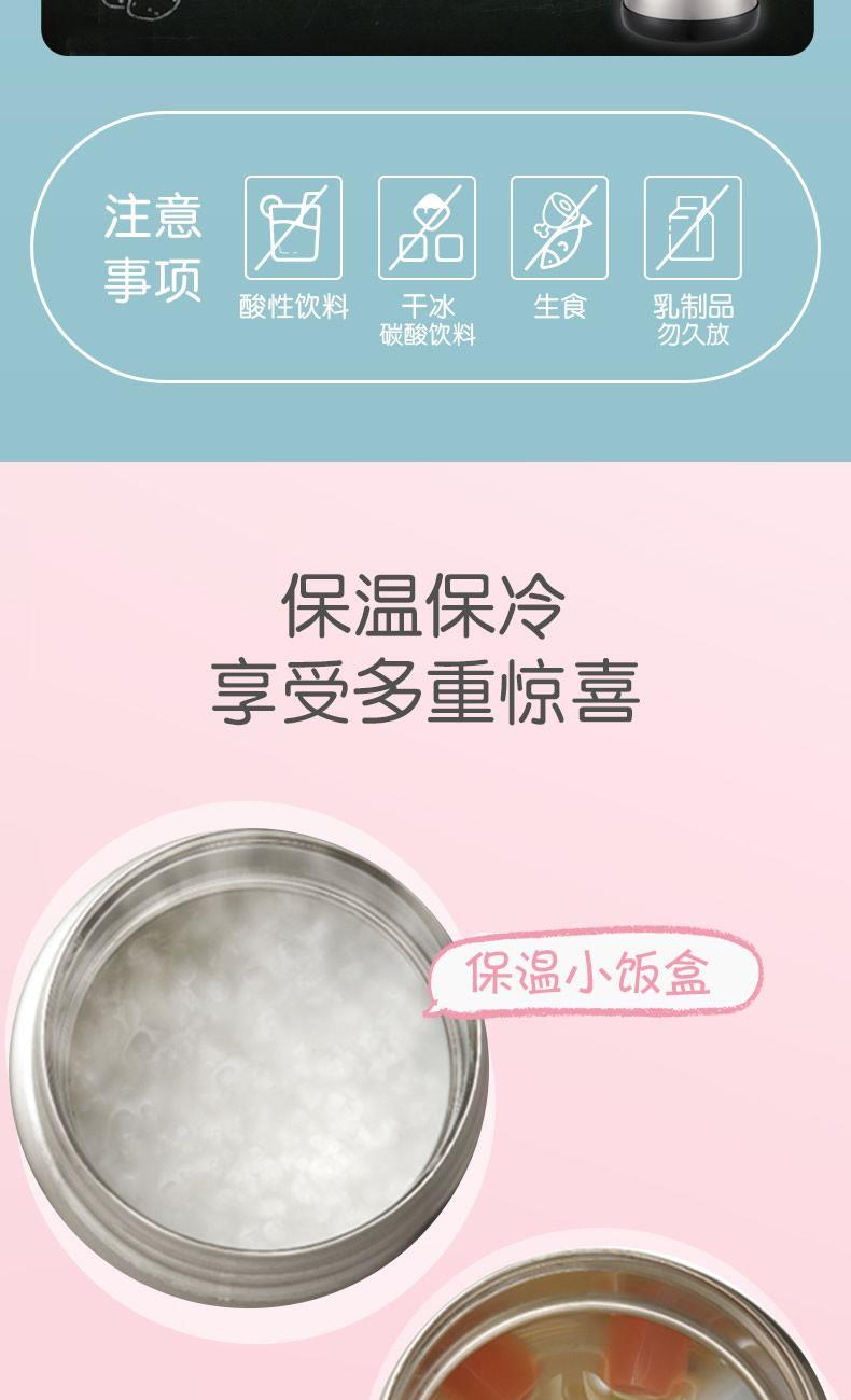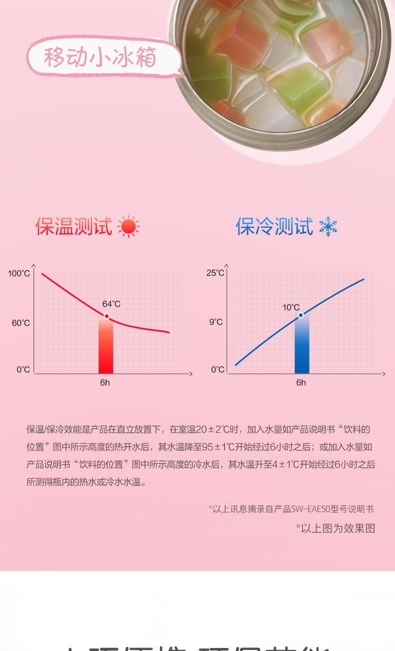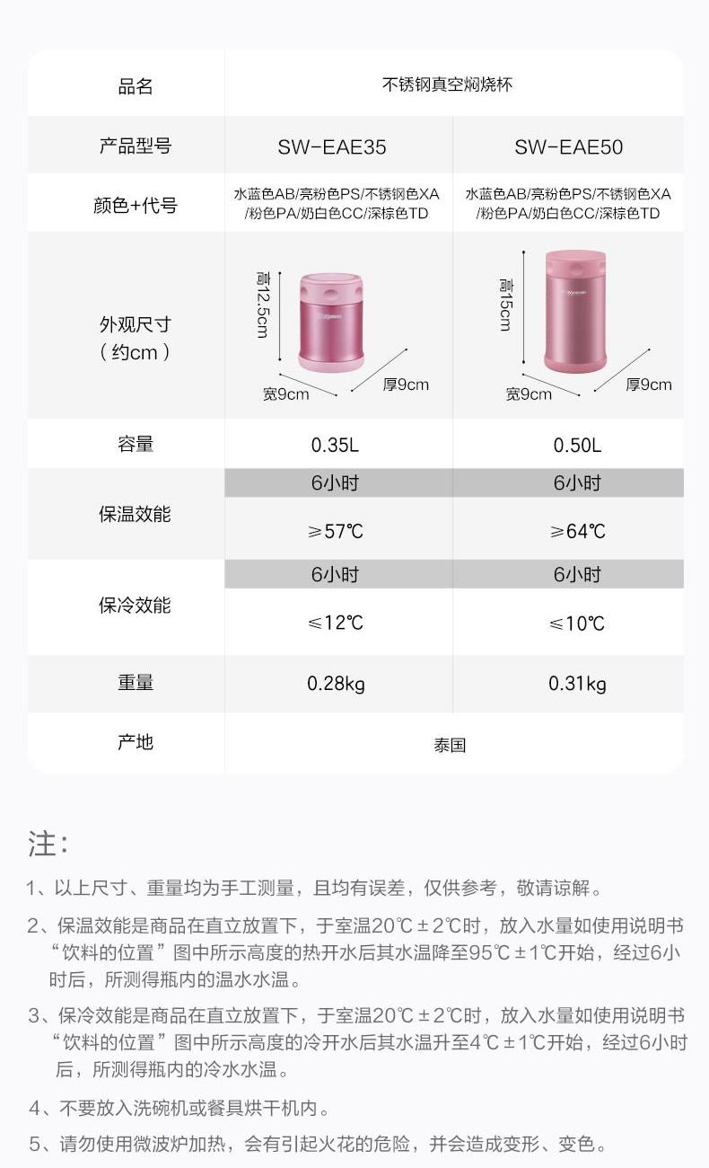 型号:SW-EAE50 颜色:红色PJ,粉色PA 容量:500ml 杯体材质 :上盖为塑胶、 杯体为双层真空不锈钢 保温效率:64℃/6h 保冷效率:10℃/6h 外形尺寸(宽深高):9x9x15cm 重量:0.31kg 产地:泰国 产品特点: 1.通气孔设计,上盖易开启,方便使用 2.保温/保冷两用,可放粥、汤、甜品 3.广口径杯口(约6.5cm),整体可清洗 4.银离子处理,更为清洁卫生 5.平滑的不锈钢内壁,有效防污,更易清洗