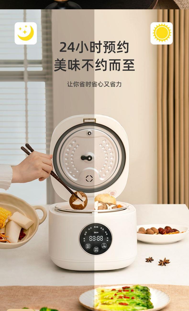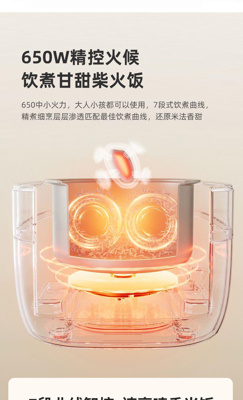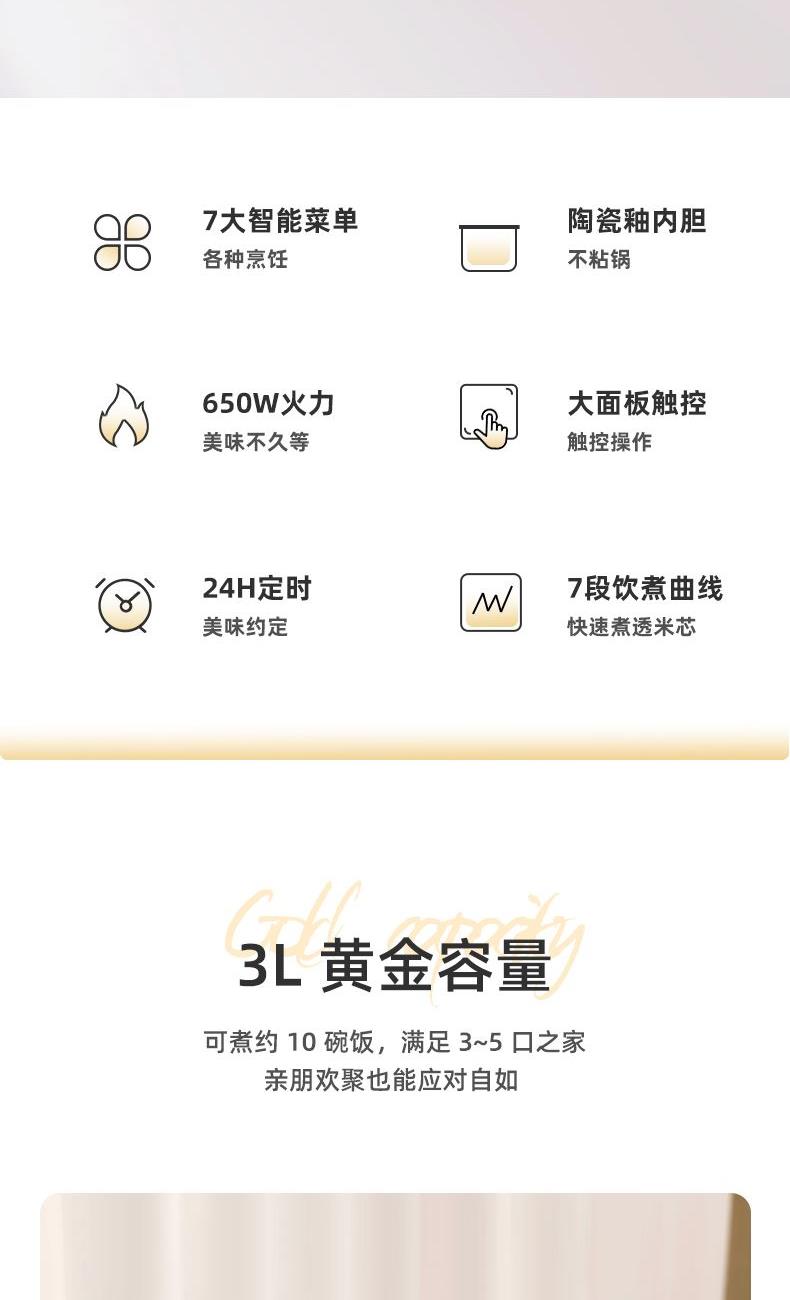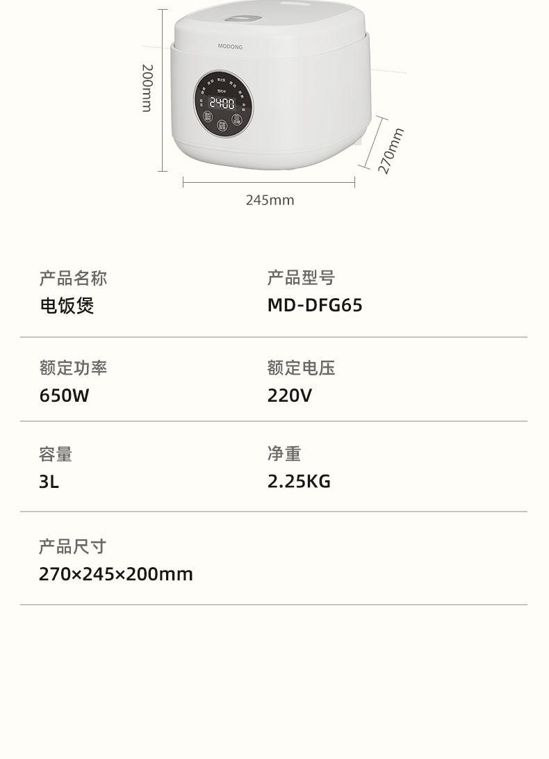 产品净重:2.25KG 产品毛重:3.0KG 额定功率:650W 额定电压:220V~ 容量:3L 内含:主机x1、内胆x1、饭勺x1、量杯x1、PP蒸笼 x1、电源线x1 1.隐形面板、电脑触控 2.操作简易、健康省心 3.自动温控、可控可靠 4.智能微电触摸控制,24小时预约,多功能一键煮饭,焖炖煮蒸样样精通