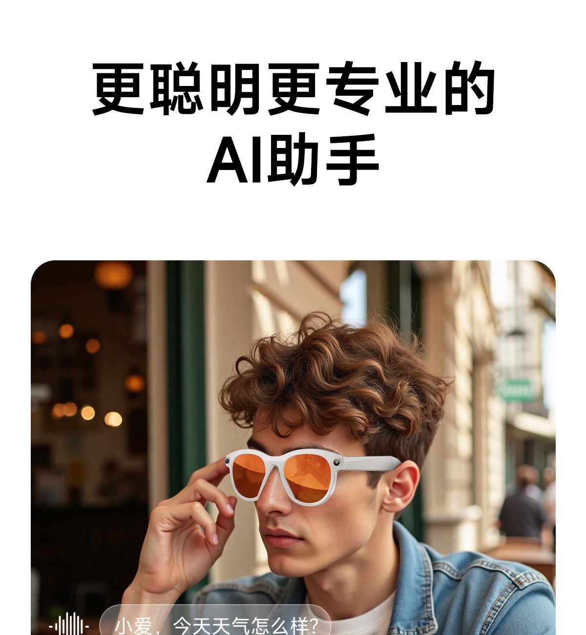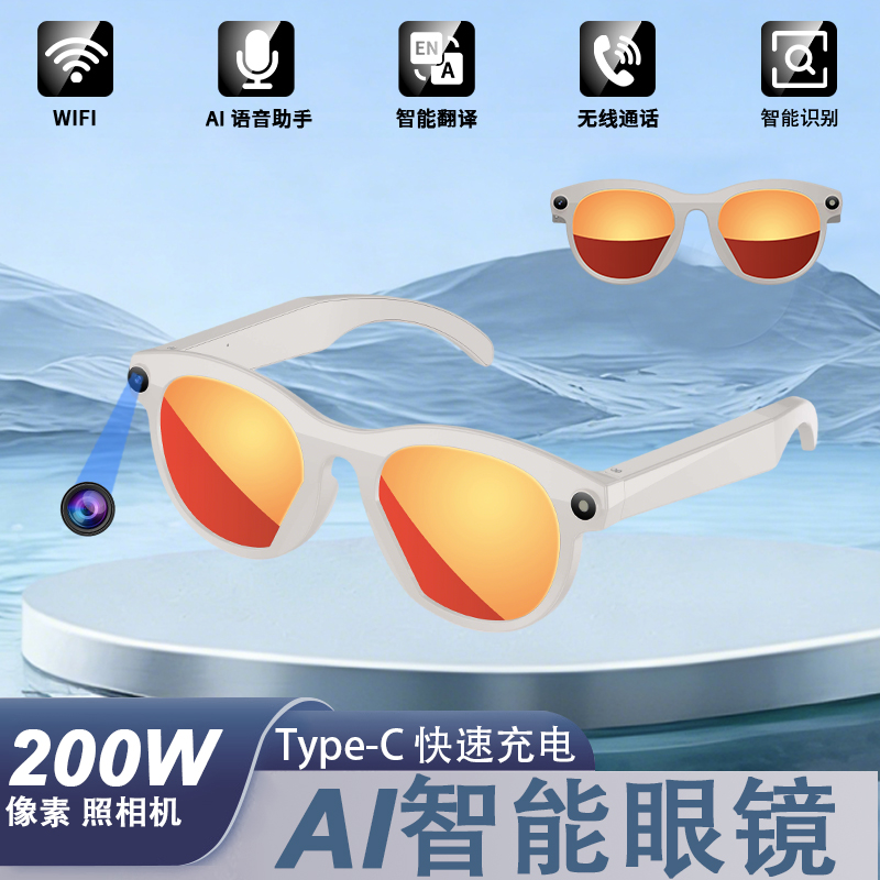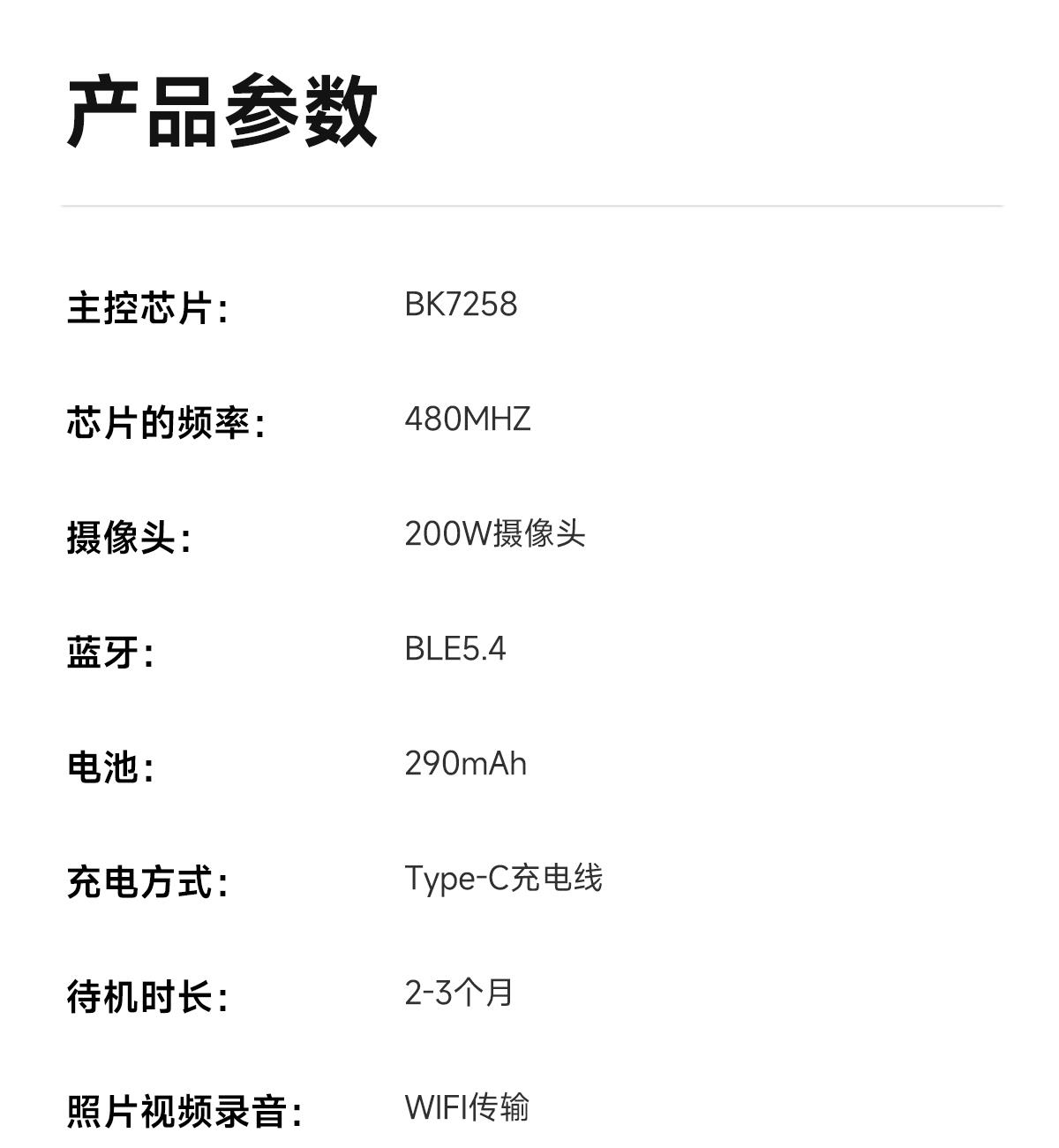主控芯片:BK7258 内存:8MB+512MB(支持4G) 摄像头:200W APP:WheatAI 连接参数:BLE5.4+WIFI6( IEEE 802.11b/g/n/ax 1x1 标准/2.4GHz) 使用时间:常规使用15小时左右,待机2-5天(60%音量播放歌曲4小时) 充电方式:有线充充电,约1-1.5小时 电池容量:双145mAh,合计290mAh 智能眼镜尺寸(mm):镜腿158*镜框150*镜高45mm 产品材质:环保PC1414材质 眼镜重量:约40g 防水等级:生活防水 产品清单:眼镜+充电线+说明书+包装盒+手提袋 产品功能:AI语音助手/拍照/录视频/录音/音乐控制/蓝牙通话/提示音/指示灯/翻译/智视识物/触摸/可连接电脑图片视频传输/音乐播放/离线语音等;语音提醒语言(中文/英文); 手机APP语言:APP跟系统语言(阿拉伯语,保加利亚语、英语、日语、中文、西班牙语等) 翻译支持语言:中文、英语、德语、西班牙、法语、意大利、日语、韩语、葡萄牙语、俄语、瑞典语 AI支持语言:中文、英文、 日语、粤语、韩语、德语、法语、俄语、意大利语、西班牙语、印地语