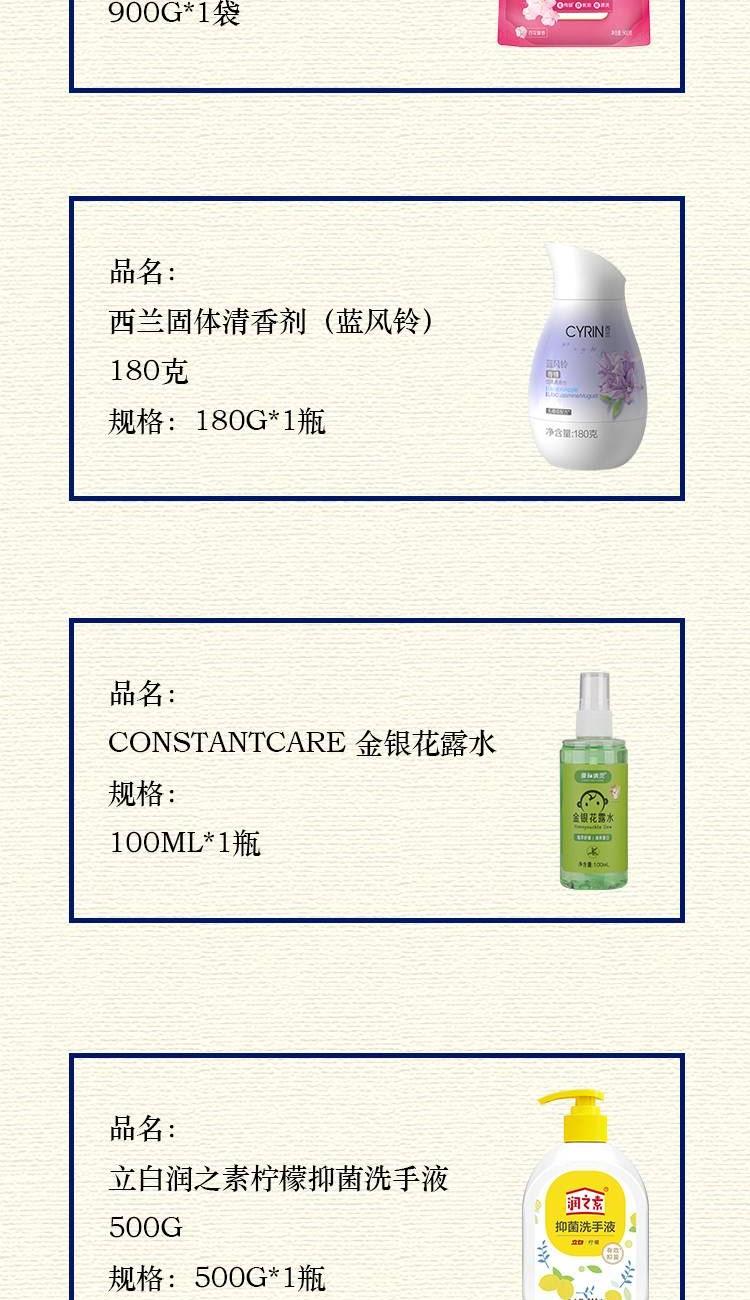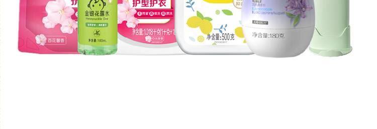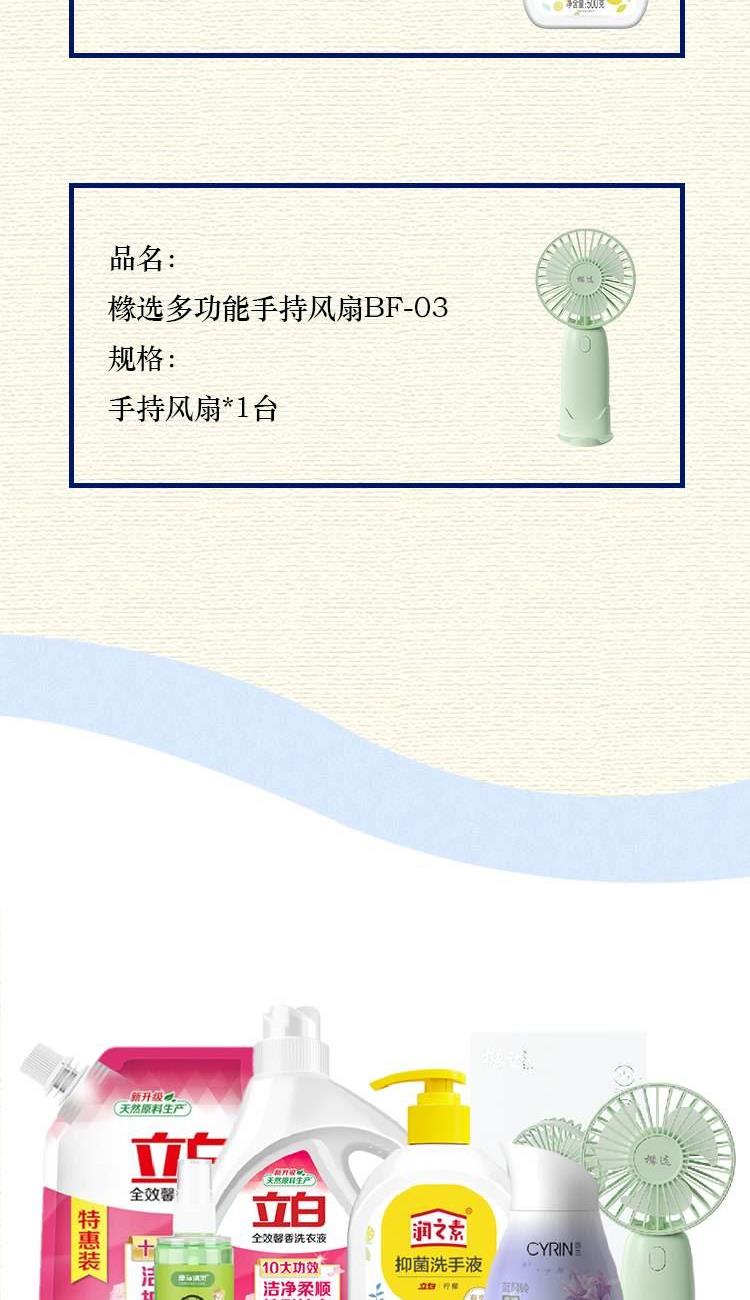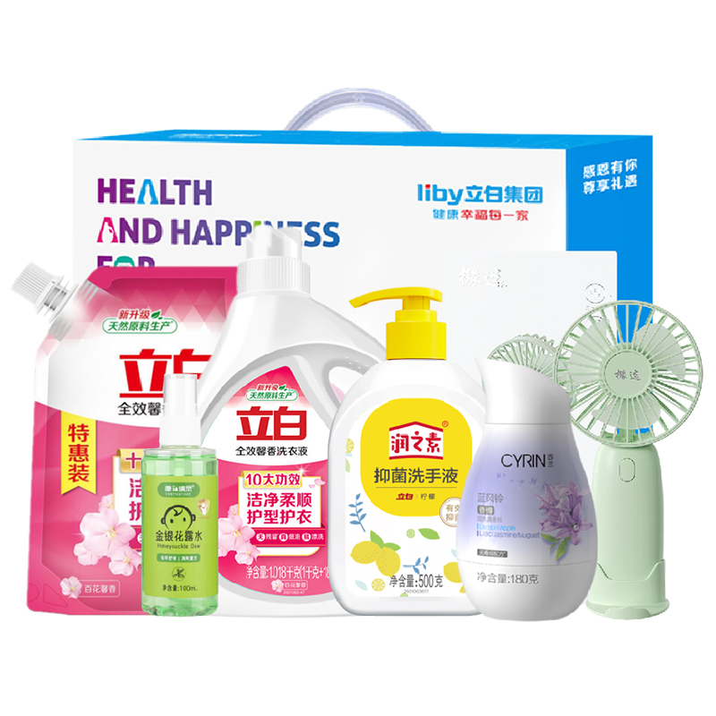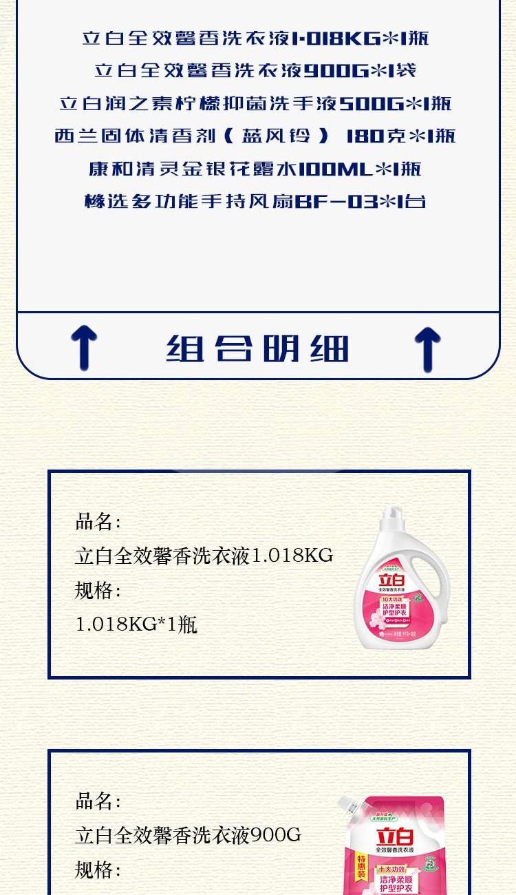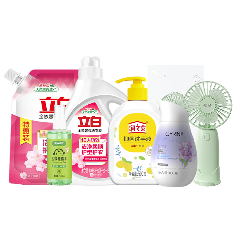 配置: 立白全效馨香洗衣液1.018kg*1瓶 立白全效馨香洗衣液900g*1袋 立白润之素柠檬抑 菌洗手液500g*1瓶 西兰固体清香剂(蓝风铃) 180克*1瓶 康和清灵金银花露水100mL*1瓶 橼选多功能手持风扇BF-03*1台 核心卖点: 立白全效馨香洗衣液凭借其出色的洁净效果、护衣功能、持久留香的特点,成为了众多家庭洗衣的首 选。 夏天清凉组合套装的不二之选。