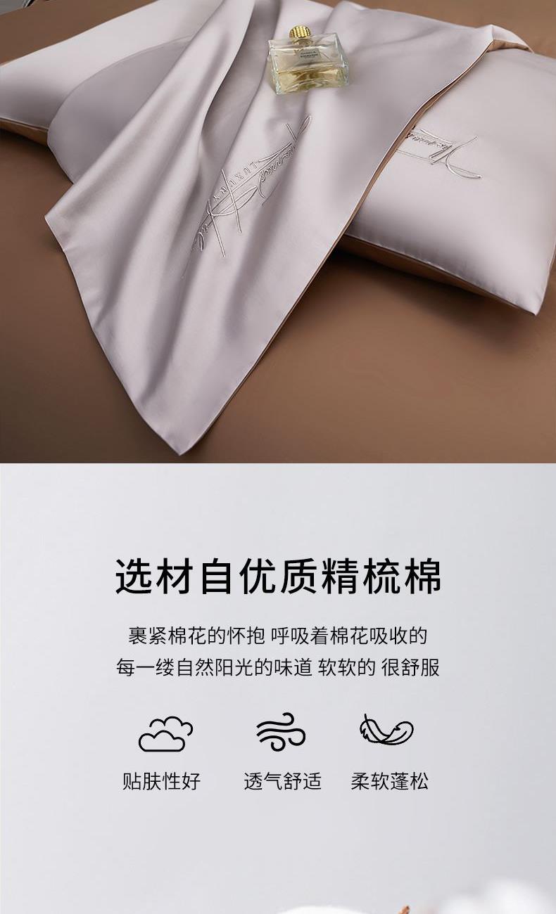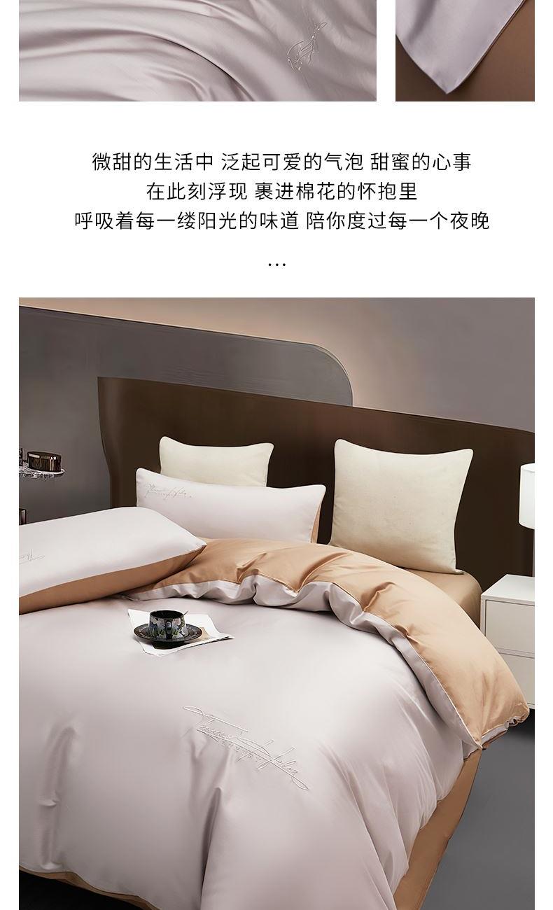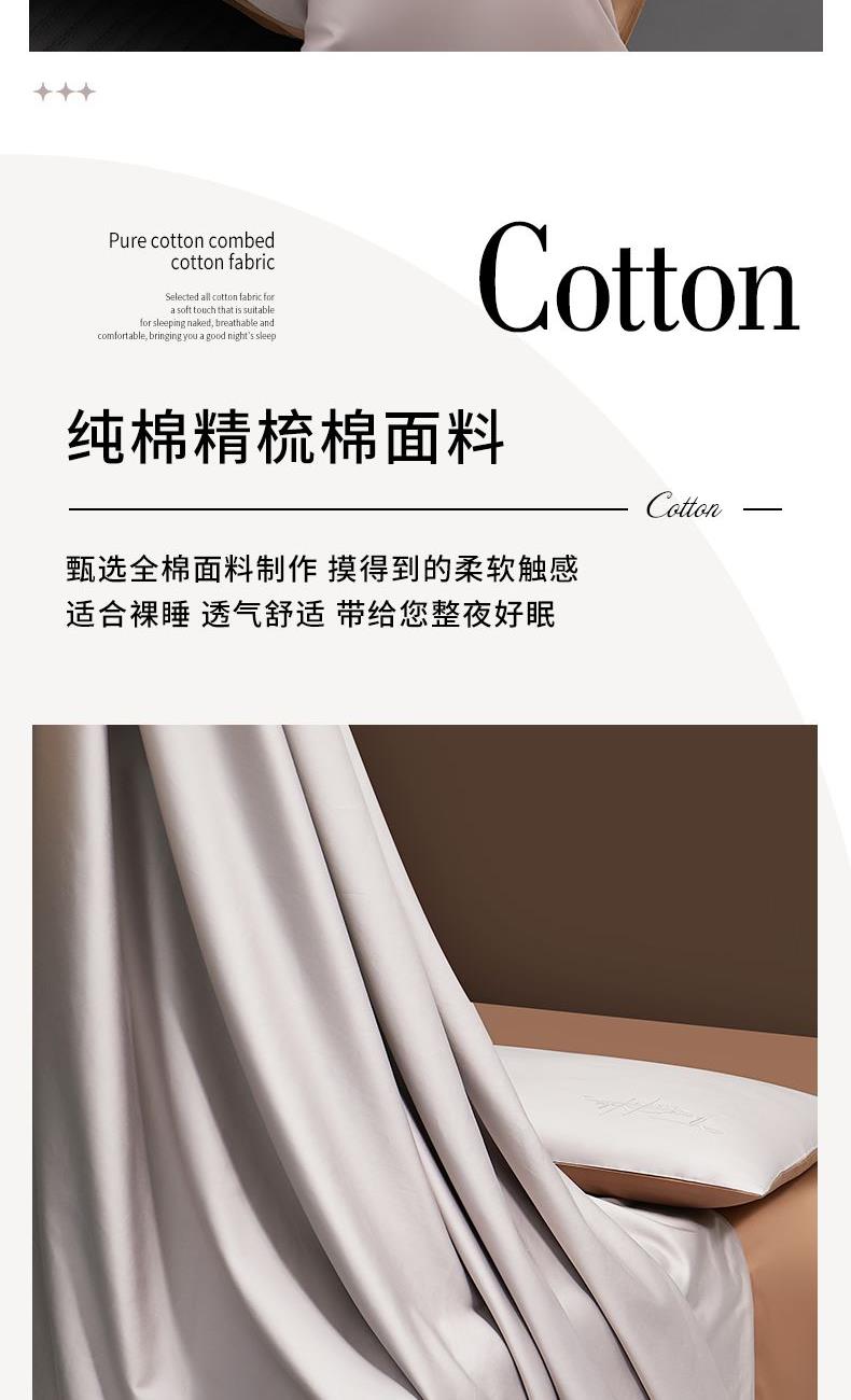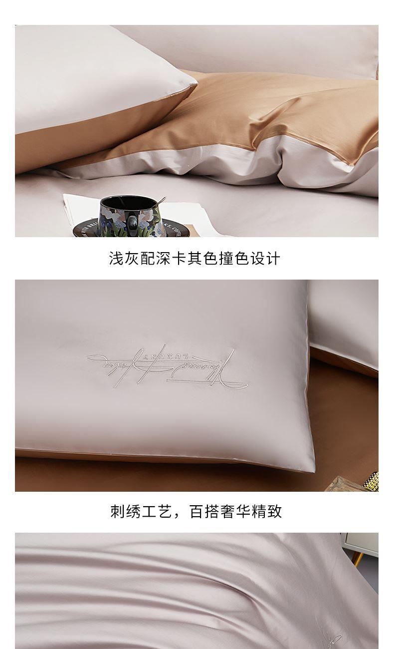产品型号:S02025004 被 套:200*230cm 床 单:240*250cm 枕 套:48*74cm*2 面 料:棉 装 箱 数:7 纯棉精梳棉面料,G-SOFT印染工艺,面料光泽度好、柔软、顺滑; AB版撞色设计,浅灰配深卡其色,刺绣工艺,百搭奢华精致; 天地盖礼盒包装,自用送礼两相宜。
