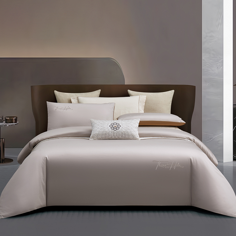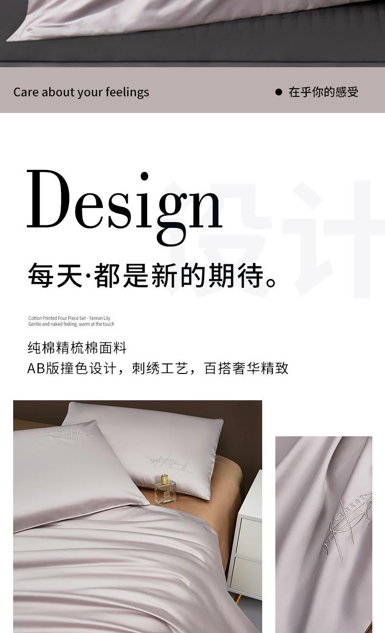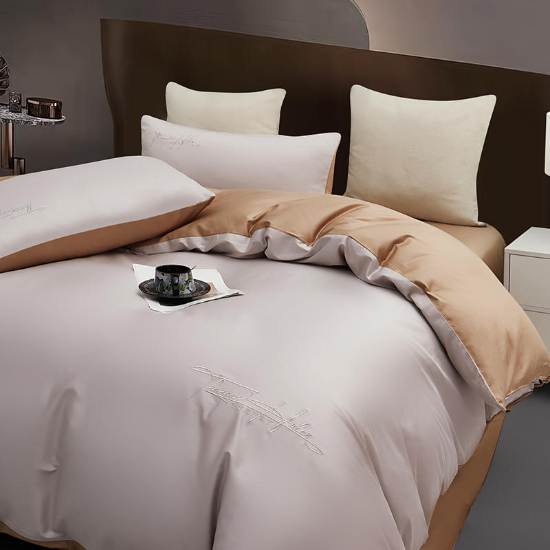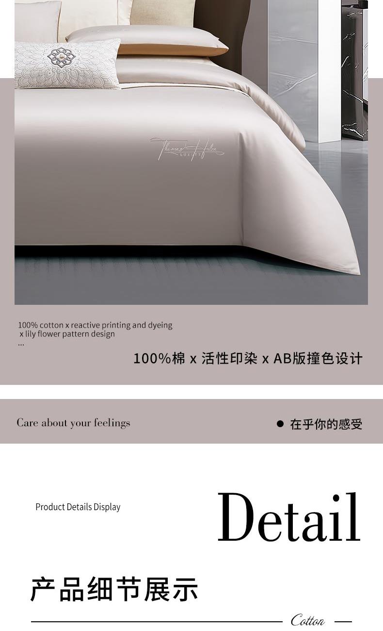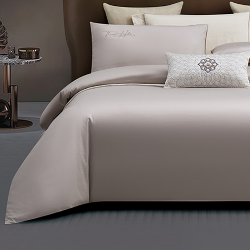 产品型号:S02025004 被 套:200*230cm 床 单:240*250cm 枕 套:48*74cm*2 面 料:棉 装 箱 数:7 纯棉精梳棉面料,G-SOFT印染工艺,面料光泽度好、柔软、顺滑; AB版撞色设计,浅灰配深卡其色,刺绣工艺,百搭奢华精致; 天地盖礼盒包装,自用送礼两相宜。