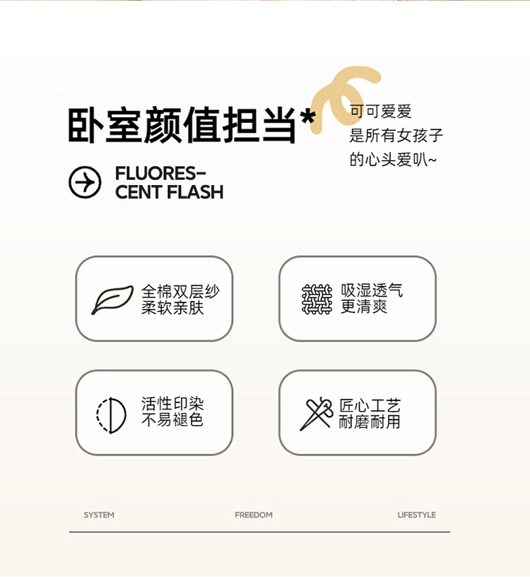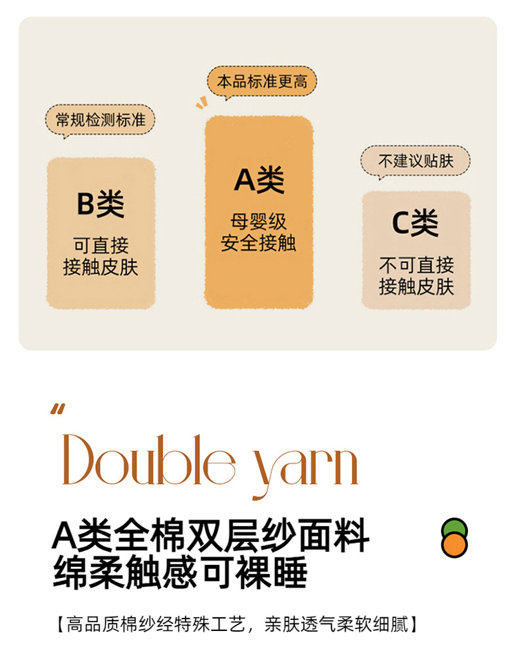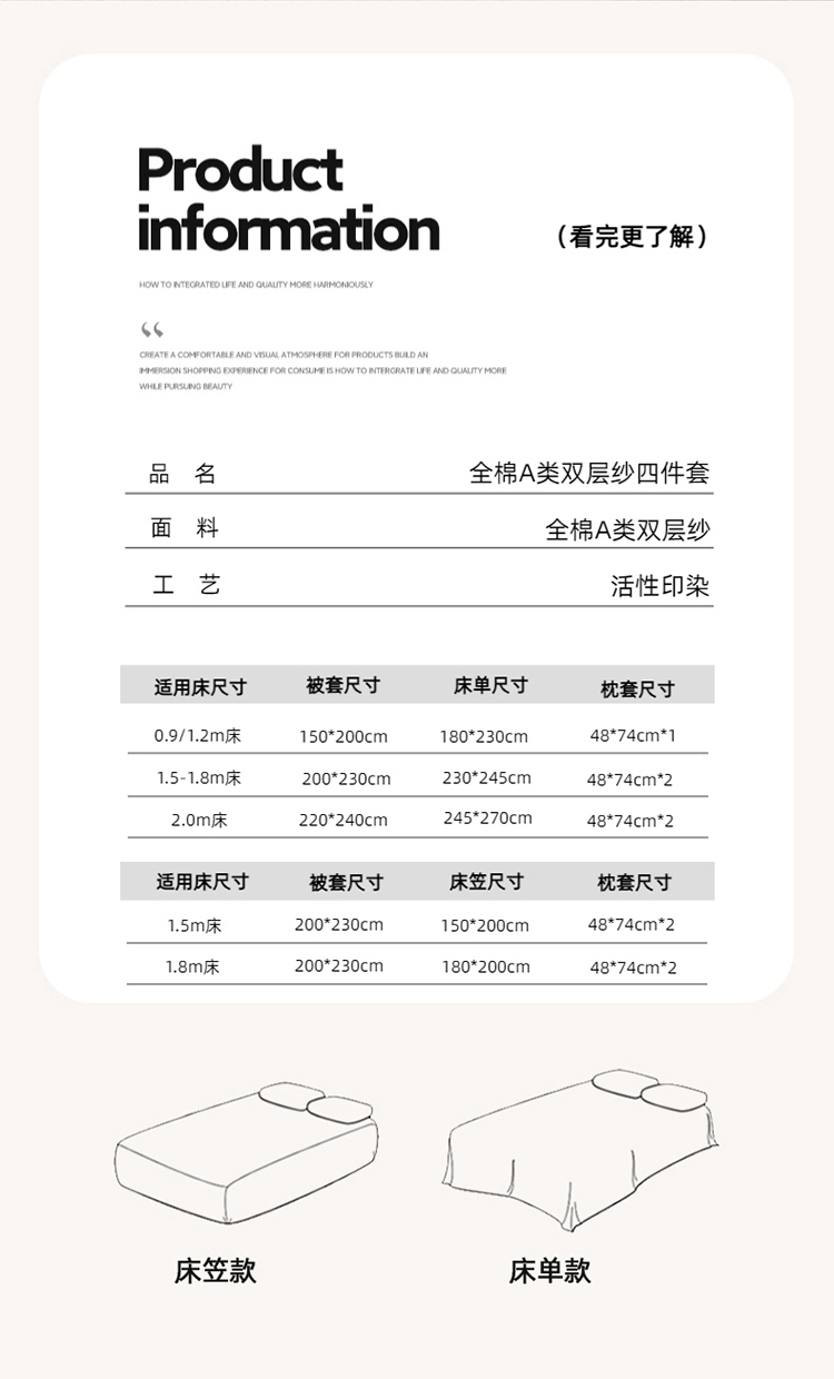 1:全棉双层纱面料绵柔触感可裸睡 【高品质棉纱经特殊工艺,亲肤透气柔软细腻】 2:双层纱是全棉面料的双重结构将空气保留在纱布中越洗越柔软,具有很好的透气性 3:一缕阳光一朵棉 日照3000+小时新疆棉,洁白长纤维更柔软 好地方,种出来的棉花当然更好 尺寸:被套200*230cm*1 床单:230*245cm*1 枕套:48*74cm*2 包装:彩盒