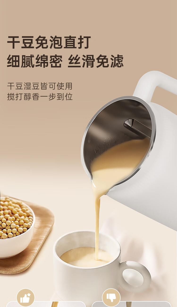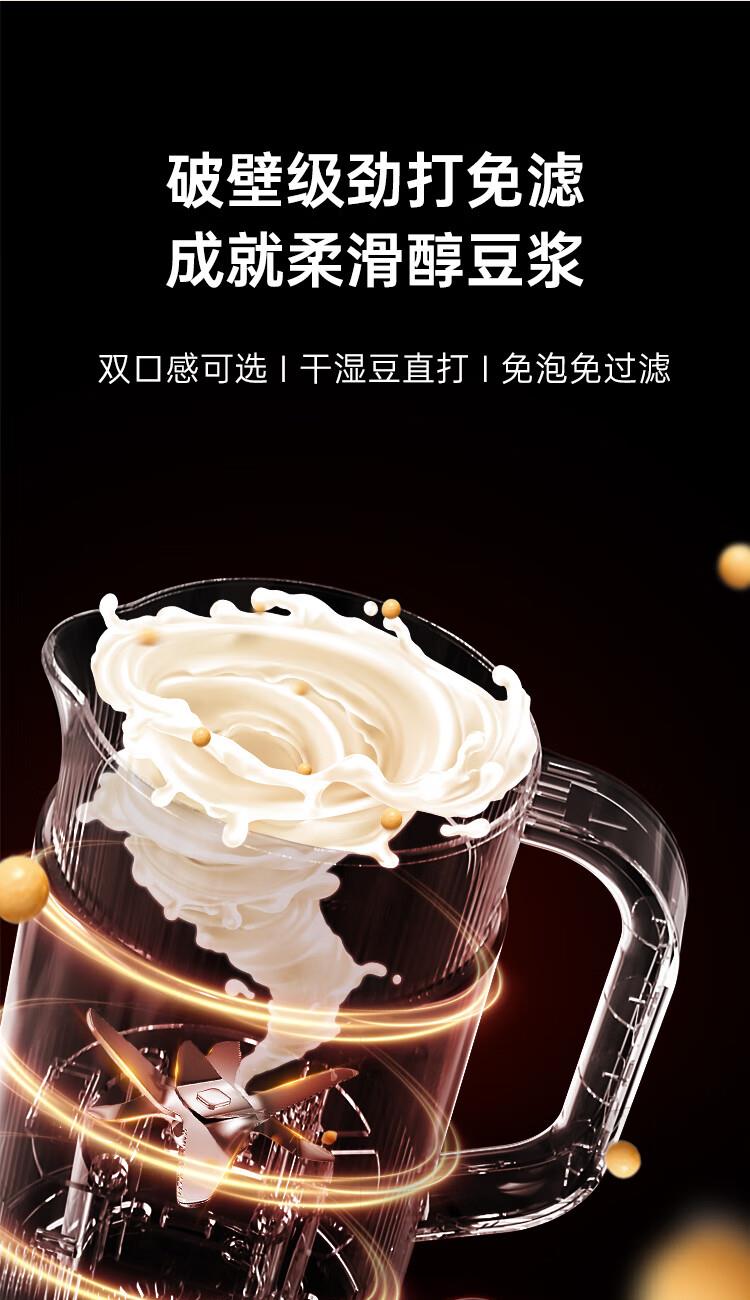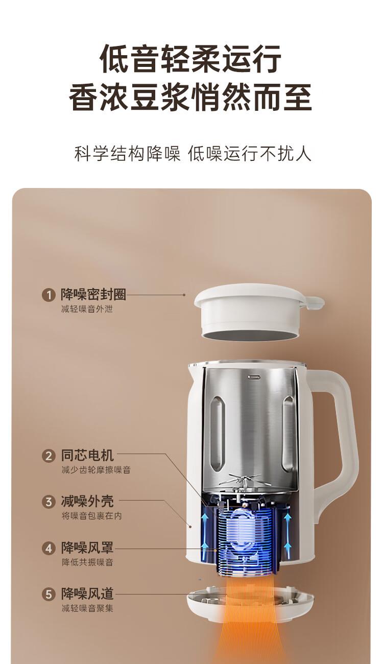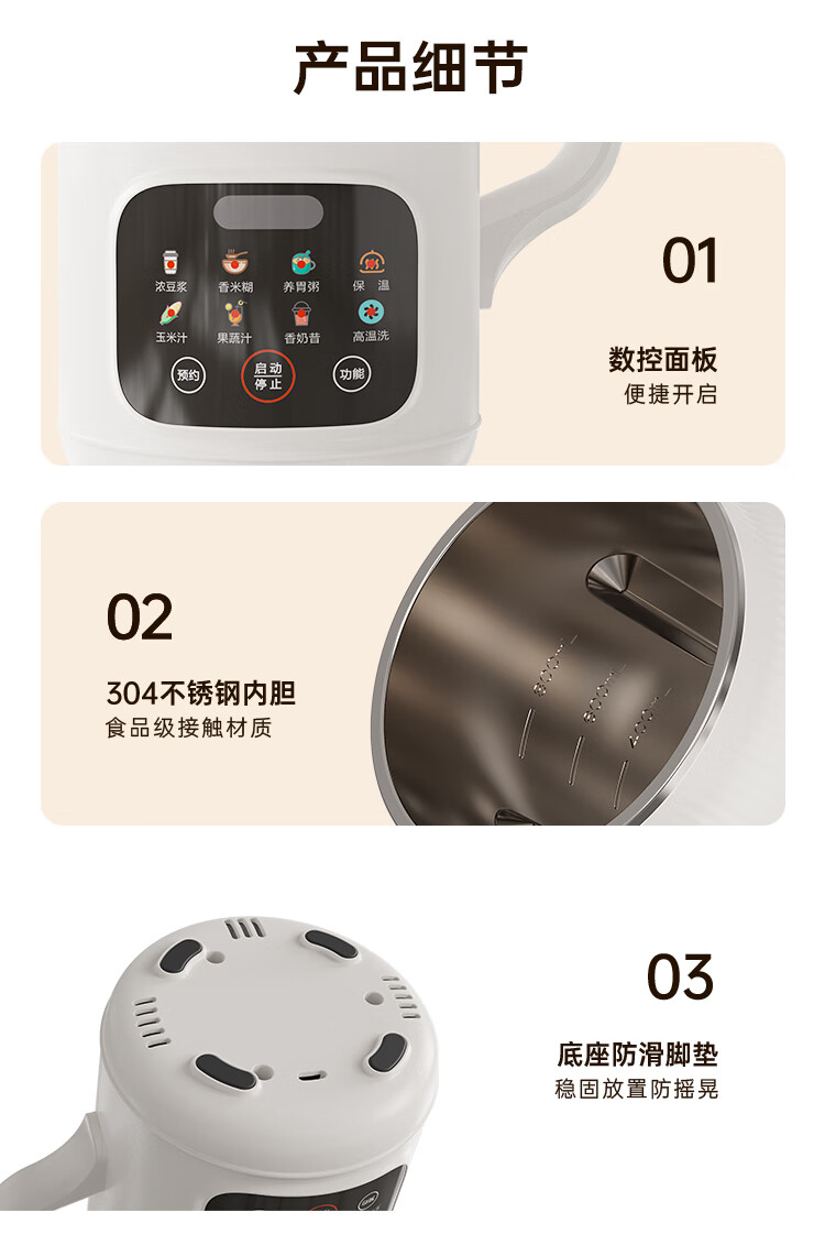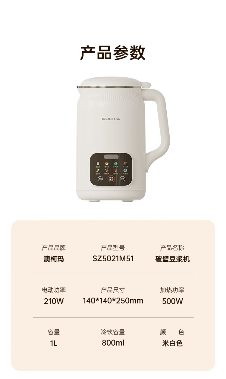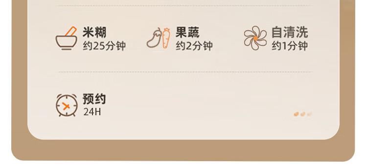 电动功率:210W 加热功率:500W 毛 重:1.7kg 净 重:1.3kg 容 量:1L 大容量,可供1-4人使用。 刀组件:36叶精钢刀组,细腻无渣。 预约功能:24H小时超长智能预约 面板功能 :8大预设智能菜谱,营养美味不重样。 豆浆:干豆直打,免泡免滤,便捷香浓无渣。 电机:5425电机 材质:不锈钢304钢桶,无涂层更安心更健康。 清洗方便:一键清洗,快速便捷。 多重安全保护:开盖保护,避免机器误操作,安全放心使用