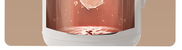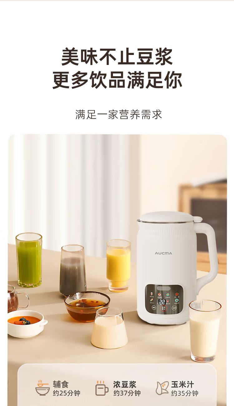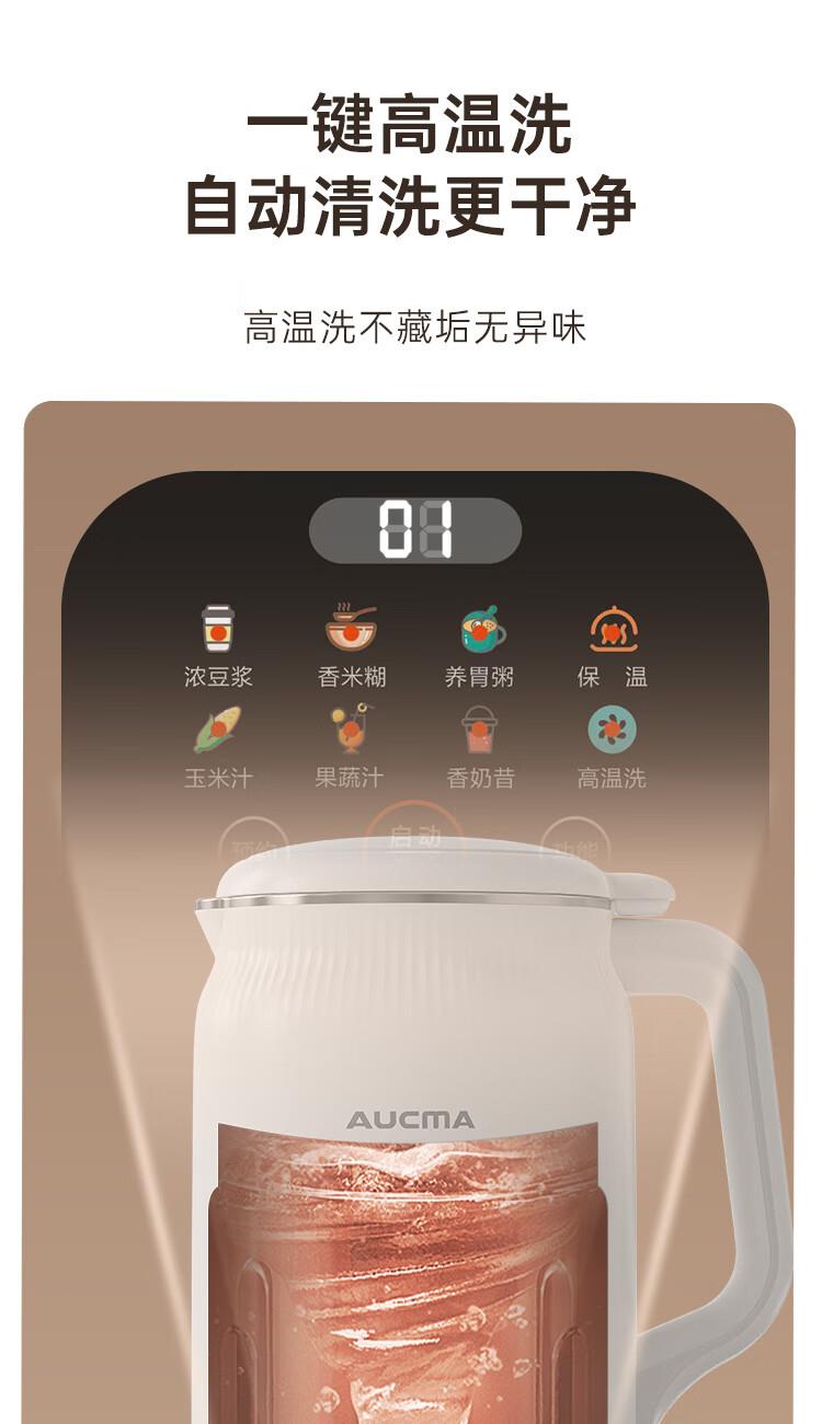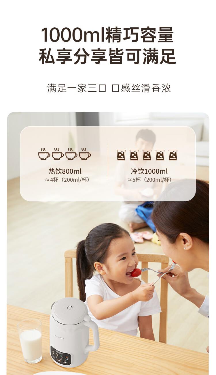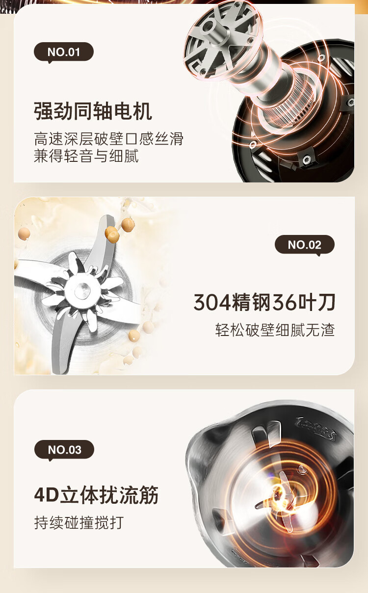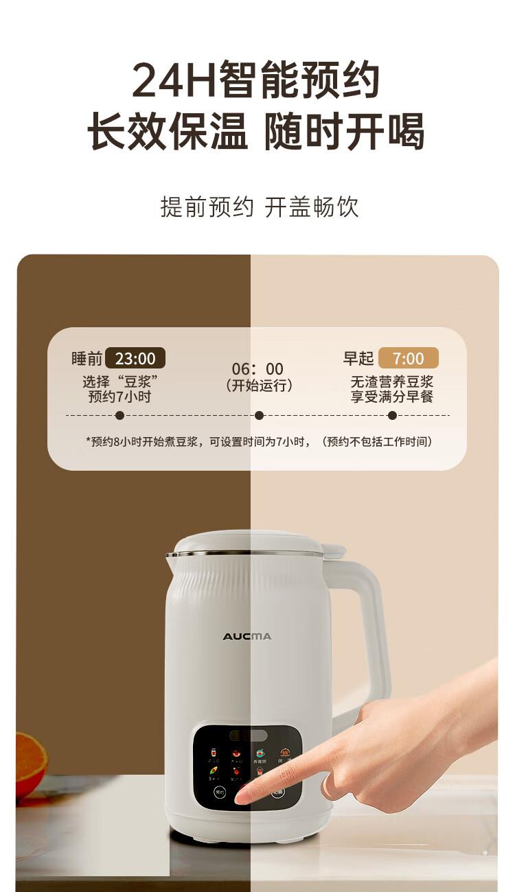 电动功率:210W 加热功率:500W 毛 重:1.7kg 净 重:1.3kg 容 量:1L 大容量,可供1-4人使用。 刀组件:36叶精钢刀组,细腻无渣。 预约功能:24H小时超长智能预约 面板功能 :8大预设智能菜谱,营养美味不重样。 豆浆:干豆直打,免泡免滤,便捷香浓无渣。 电机:5425电机 材质:不锈钢304钢桶,无涂层更安心更健康。 清洗方便:一键清洗,快速便捷。 多重安全保护:开盖保护,避免机器误操作,安全放心使用