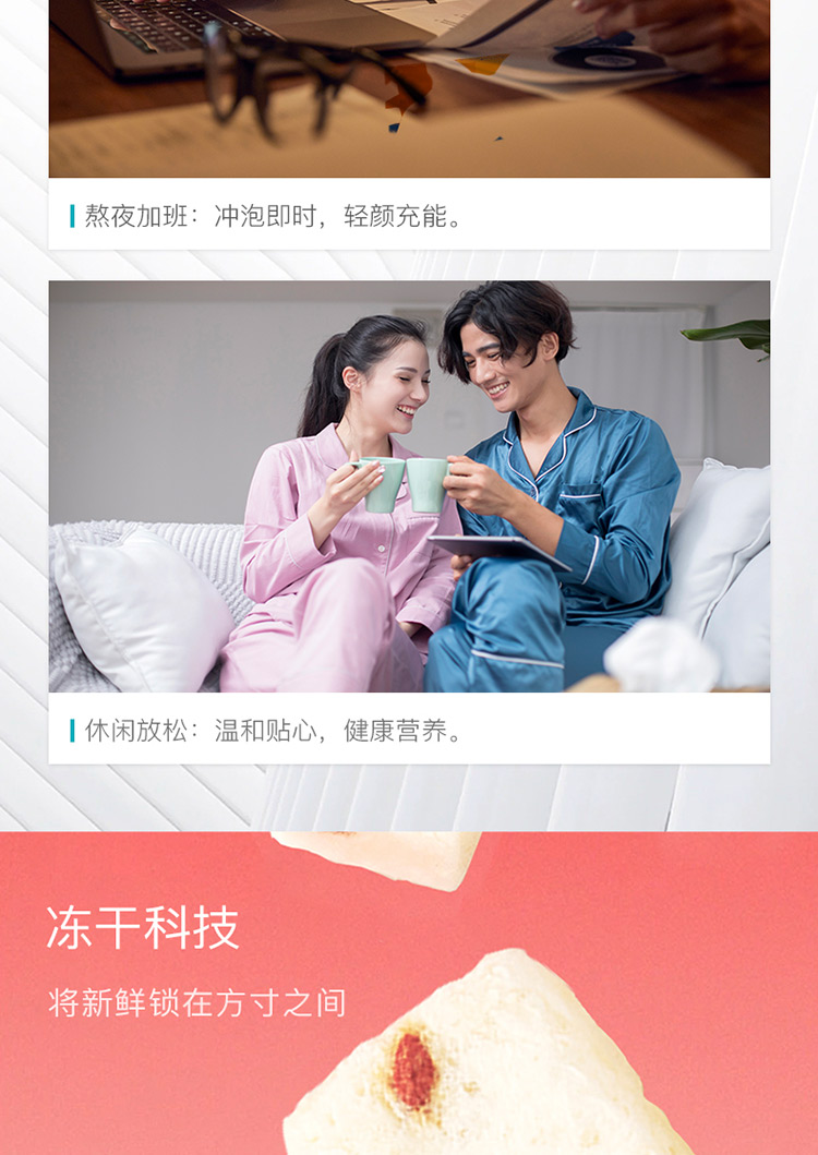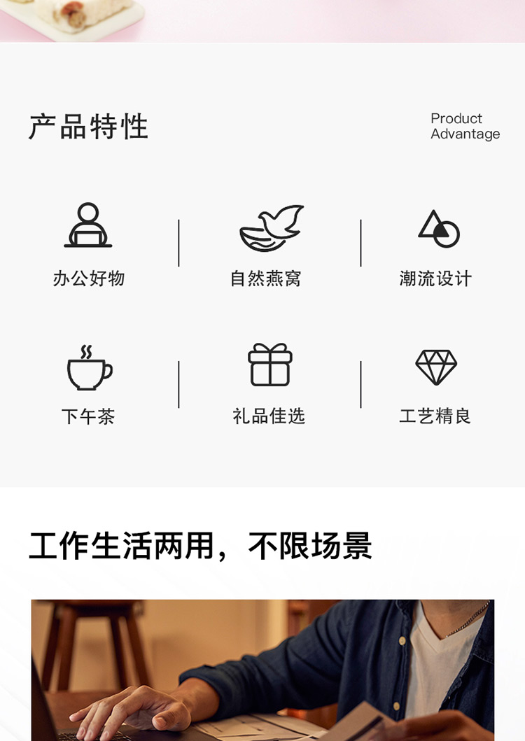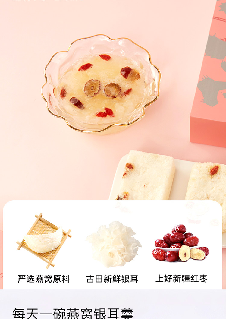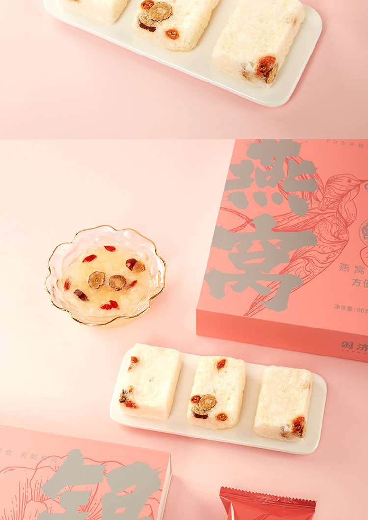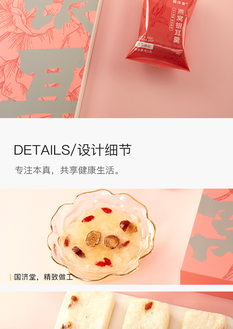规格:冻干燕窝银耳羹15克/袋*6袋/盒*2盒 (银耳含量≥30%、燕窝含量≥0.07%) 配料:银耳、冰糖、红枣、枸杞、燕窝 食用方法:将产品拆包放于杯中,加入200-250mL开水,冲泡搅拌均匀即可食用,静置2分钟后口感更佳。 保质期:18个月净含量:90克/盒*2盒 国济堂自行开发设计的年轻化、潮流化新产品——燕窝银耳羹。随着社会生活的快节奏发展,冻干产品的需求越来越多,本款采用暖粉+银配色,更年轻更时尚。 真材实料的搭配,银耳、红枣、枸杞等肉眼可见