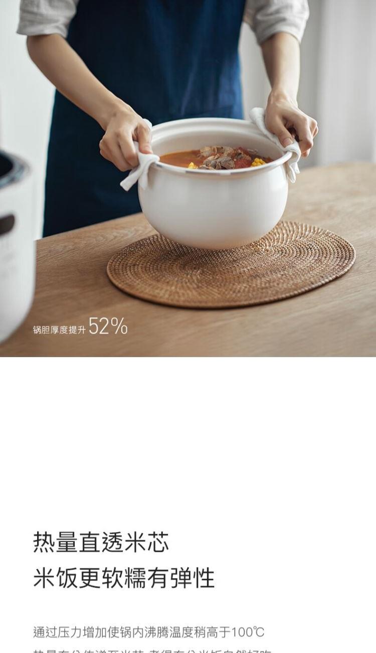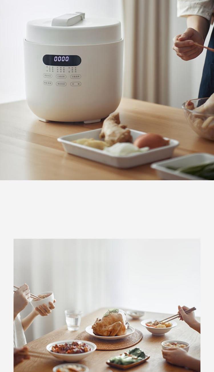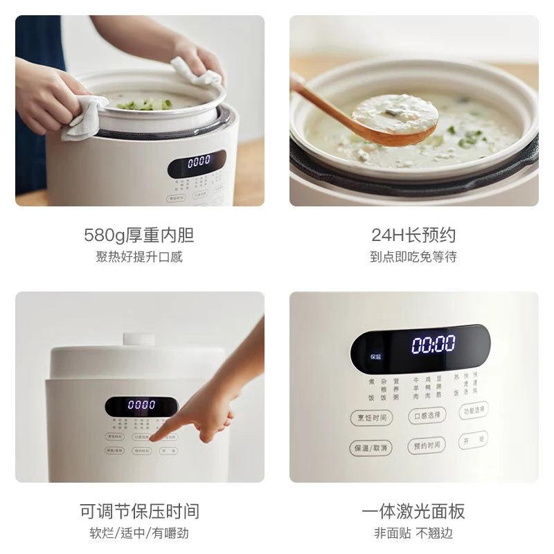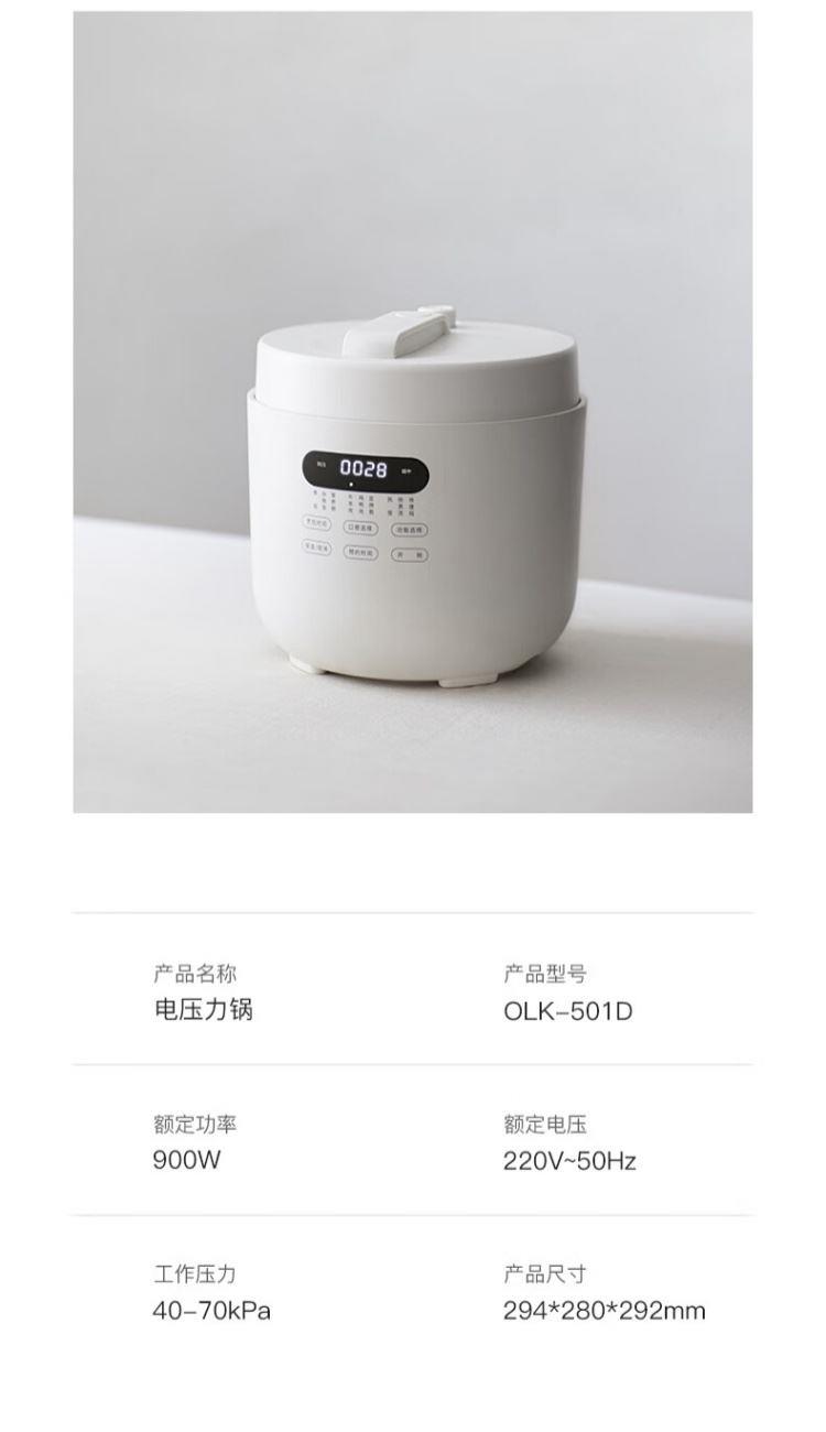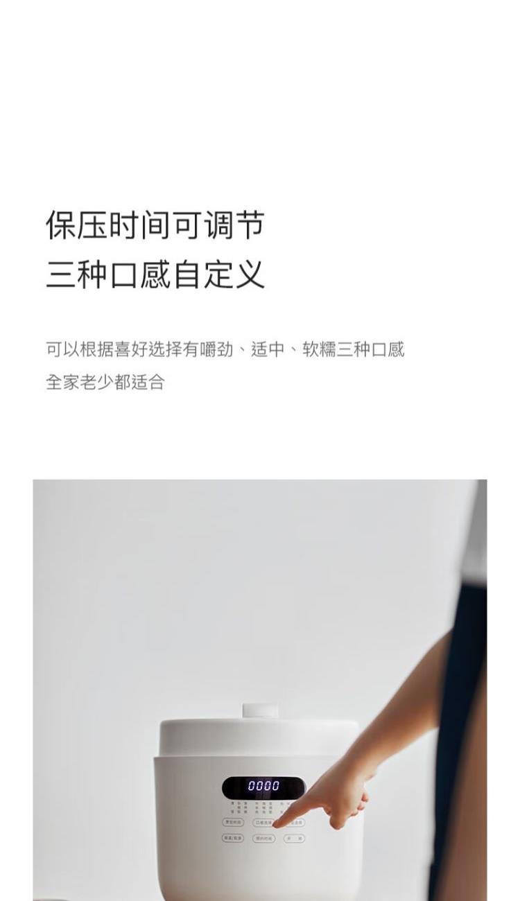 电压力锅: 颜色:陶白 容 量:5L 重量:4.58/6.55kg 额定功率:900W 产品尺寸:294*280*292mm 包装尺寸:340*322*490mm 8H原标陶瓷釉圆釜内胆,不粘锅好清洗 70Kpa高压快煮,软嫩脱骨 24小时预约保温,泄压防堵保护 可调节保压时间,自定义三种口感 上下NTC双感温探头,煮粥煲汤不溢锅